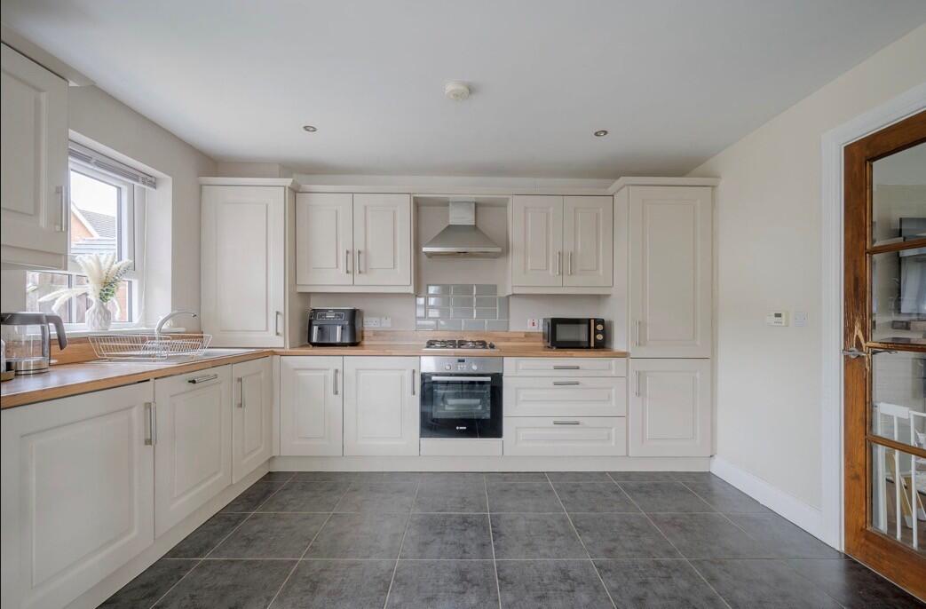 at widest points. Range of high and low level units, laminate work surfaces, single bowl single drainer stainless steel sink unit with mixer tap, integrated four ring gas hob, tiled splashback, extractor fan above, integrated oven, integrated dishwasher, integrated fridge freezer, integrated washing machine, gas fired boiler, fully tiled floor, uPVC double glazed French doors to rear garden.