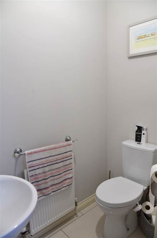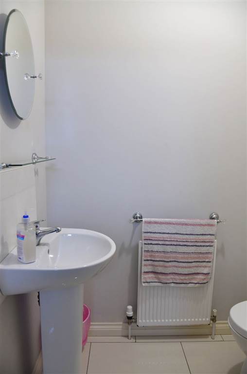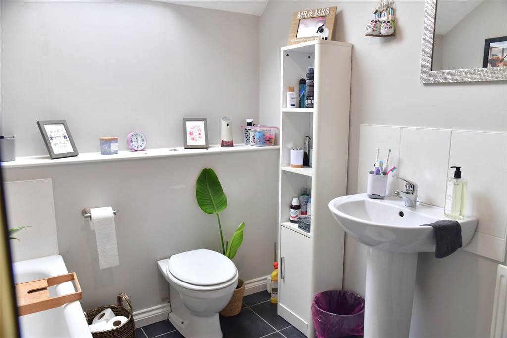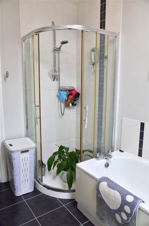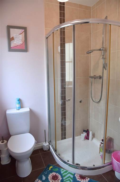 With 3-piece white suite comprising LFWC, WHB and shower to enclosed tiled corner cubicle. Splash back tiling. Tiled flooring.