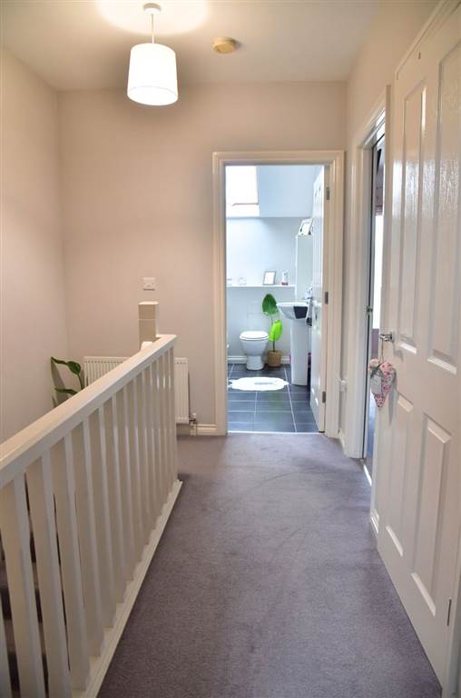 With access to partly floored loft with drop down ladder. Hot-press with shelved storage.