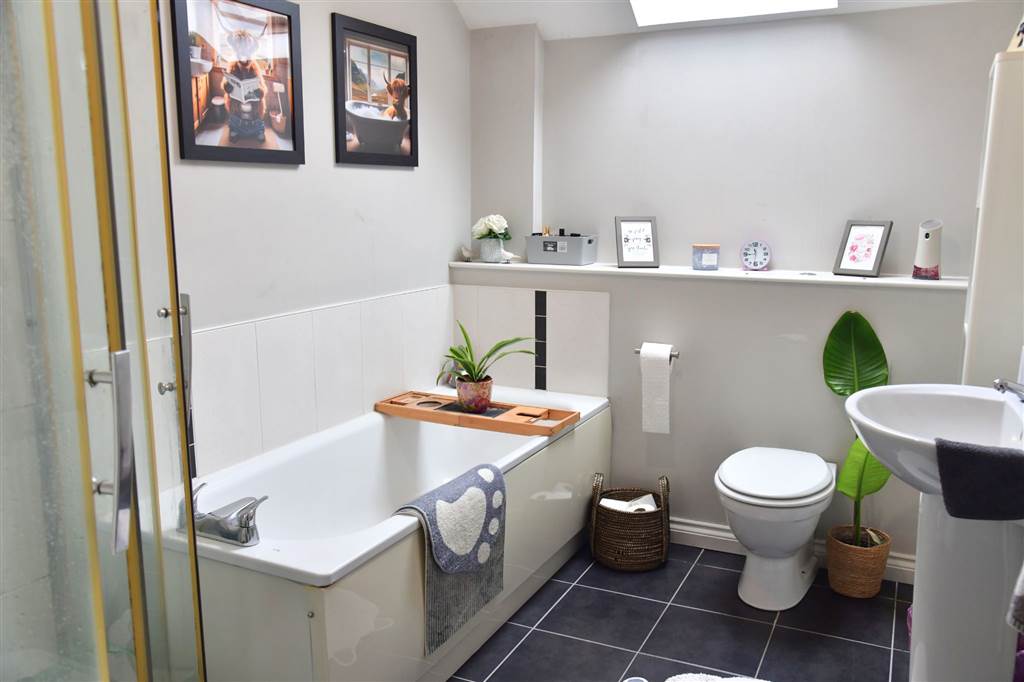 With 4-piece white suite comprising LFWC, WHB, panelled bath and shower to enclosed tiled corner cubicle. Velux window. Splash back tiling. Tiled flooring.