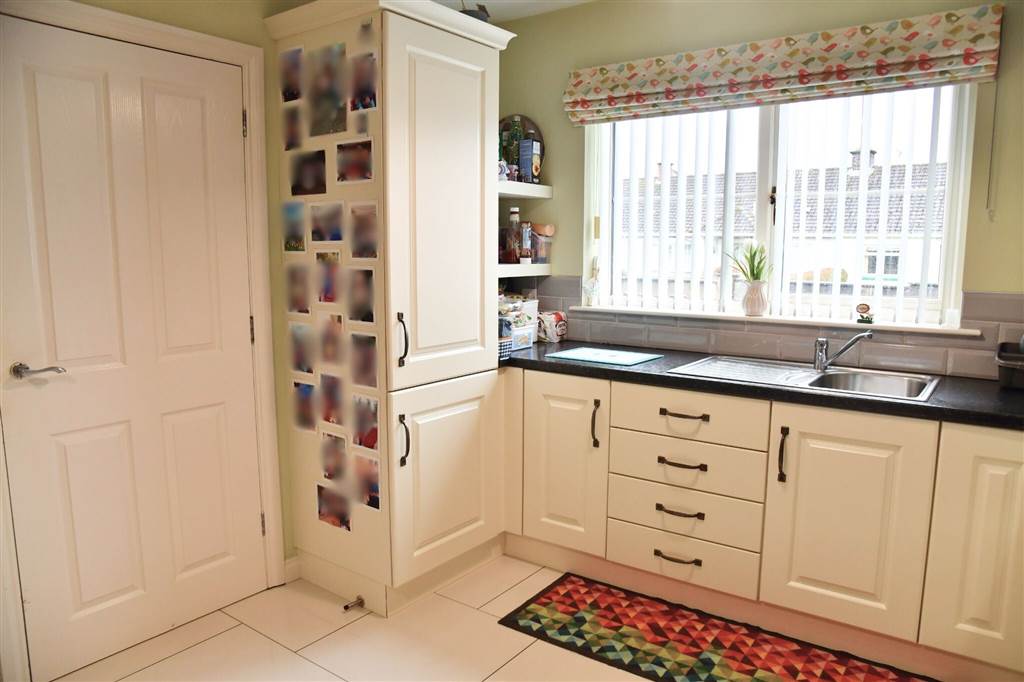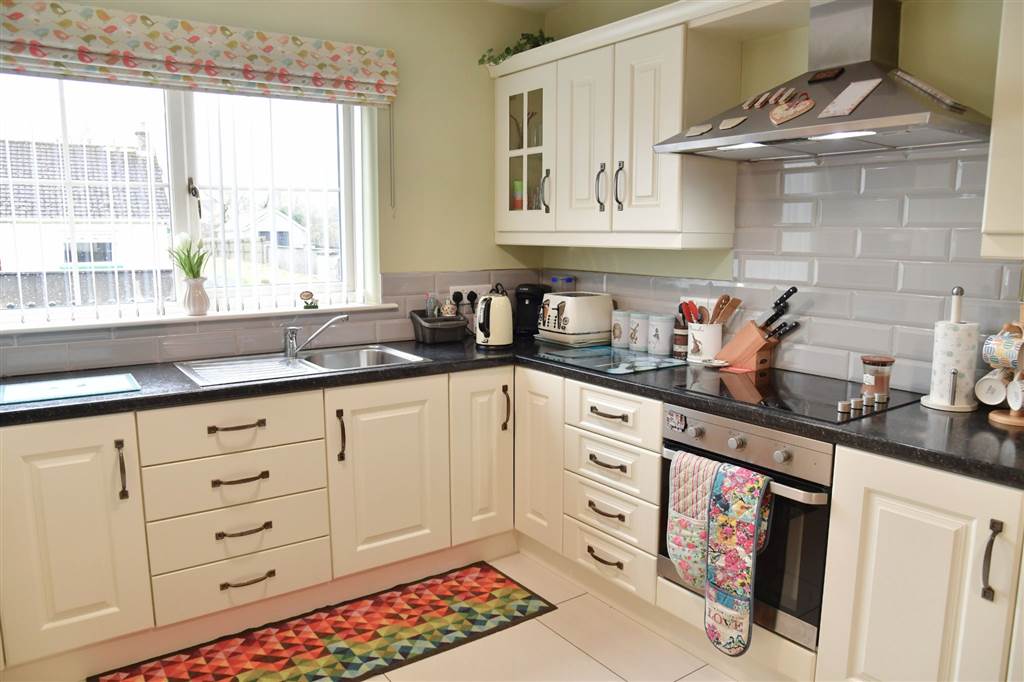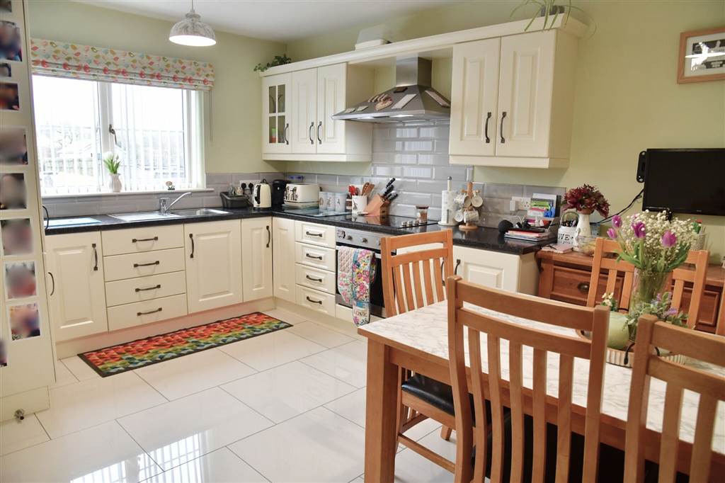 With a range of eye and low-level fitted units, stainless-steel sink unit and drainer with stainless-steel mixer tap. Integrated four ring electric hob and oven with stainless-steel extractor fan over. Integrated fridge-freezer. Cutlery drawers. Glazed display cupboard. Spacious area for dining. Under stair storage cupboard. Splash back tiling. Tiled flooring.