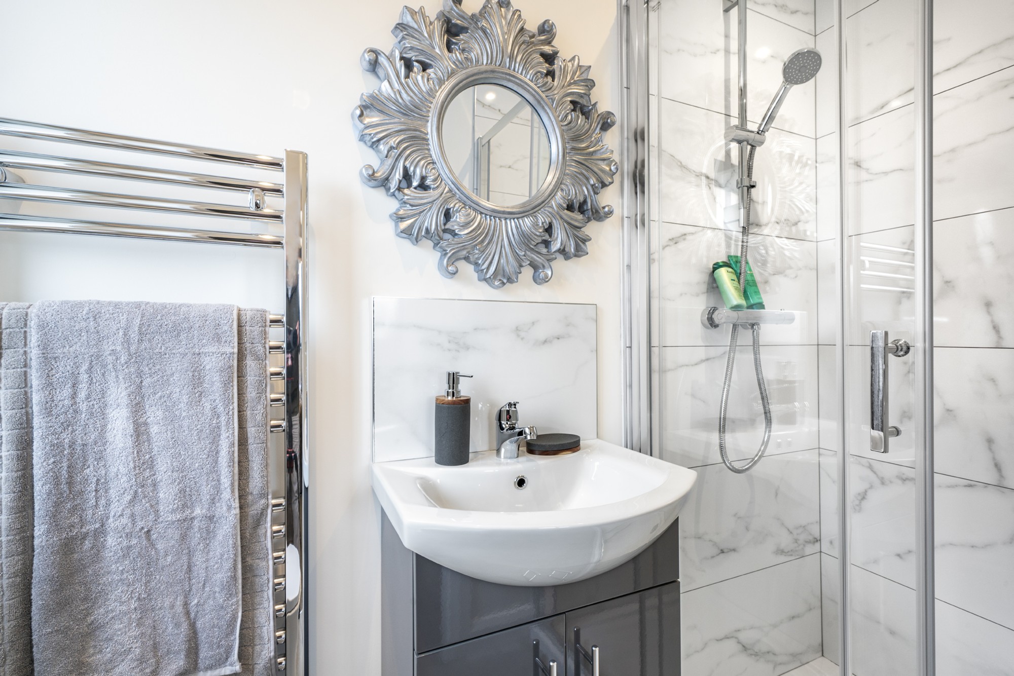 Tiled shower enclosure, with tiled splash back to sinks and bath