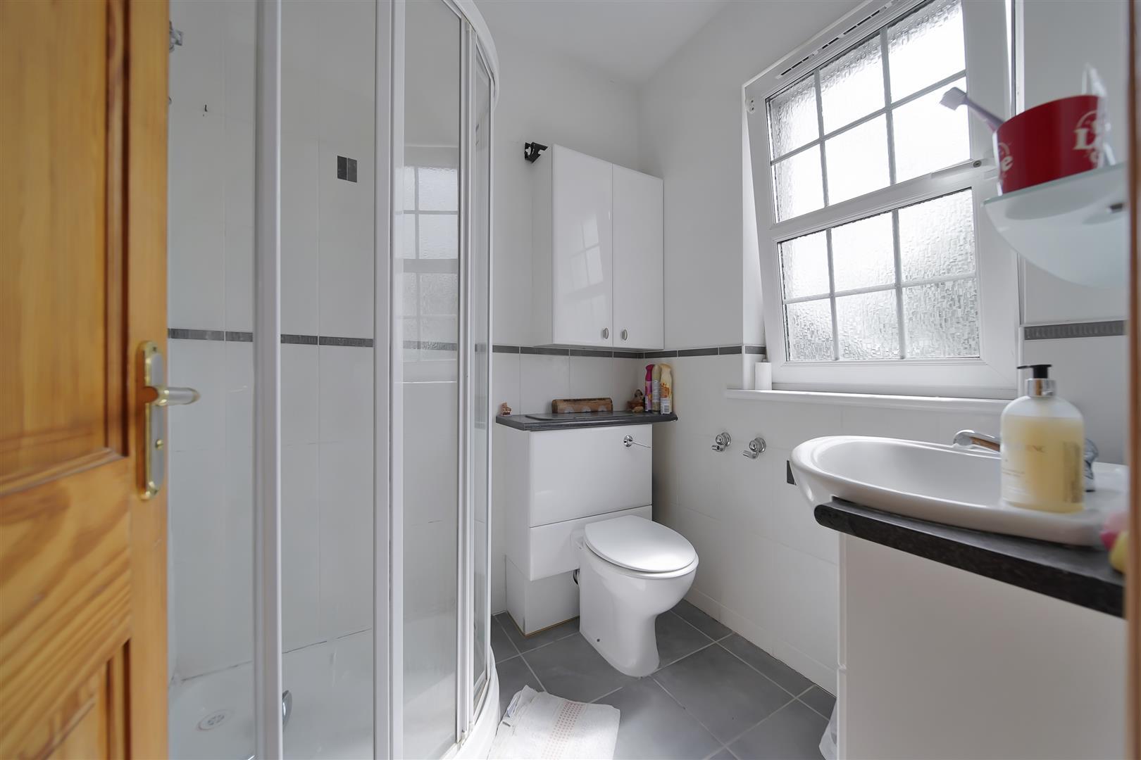 White suite. Back to wall toilet unit and sink in vanity unit. Tiled shower cubicle with power shower. 1/2 tiled walls and tiled floor. Heated towel radiator. Extractor fan.