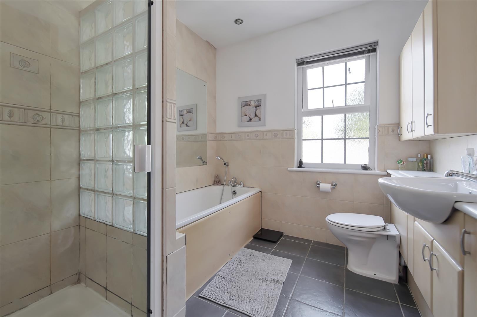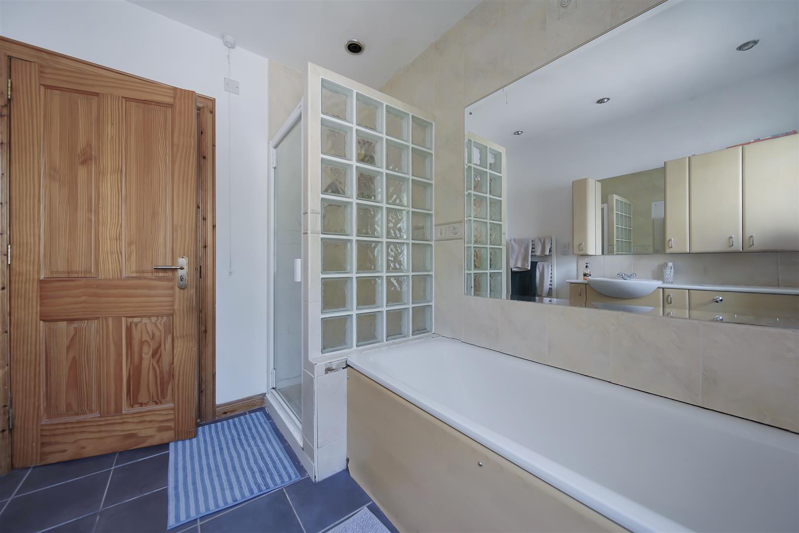 White suite. Combination vanity basin and toilet with built in storage. Panel bath with mixer taps. Glass and tiled shower cubicle with power shower. 1/2 tiled walls and tiled floor. Spot lighting.