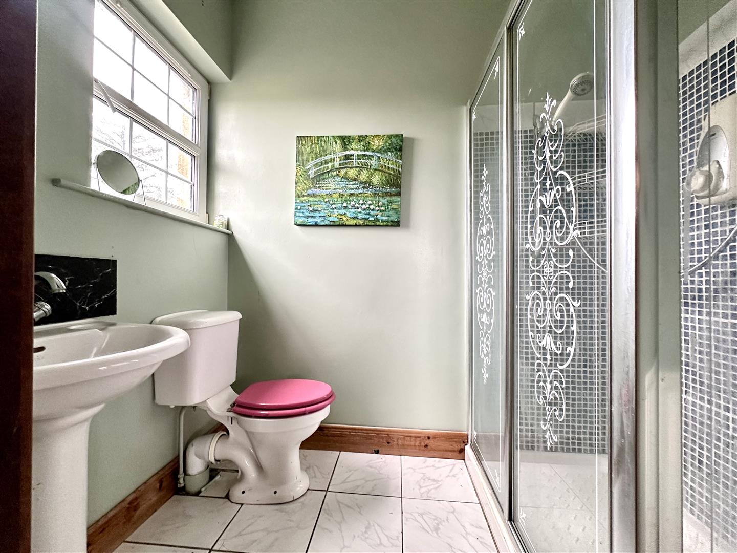 White suite. Low flush wc, pedestal wash hand basin. Tiled shower cubicle with `Aqualisa´ power shower. Tiled floor and splash back. Extractor fan.