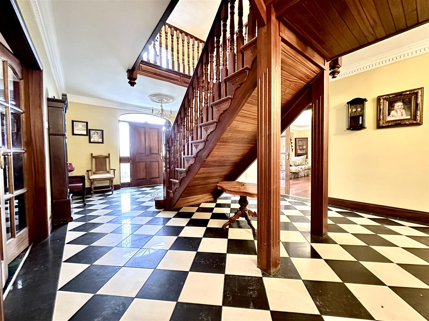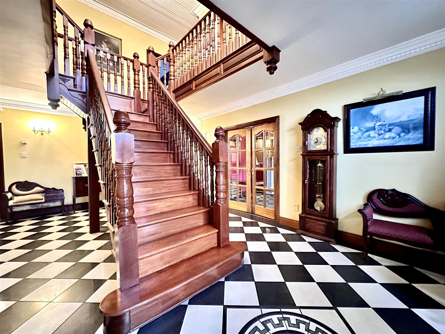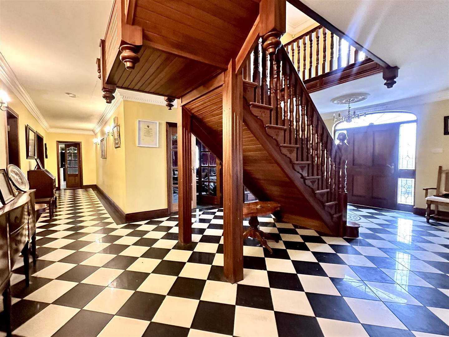 Georgian style front door with glazed side panels and fan light. Mahogany feature gallery staircase. Polished porcelain floor. Moulded cornicing and centre rose. Wall lighting. Telephone, power and Beam points. French doors leading to Drawing Room.