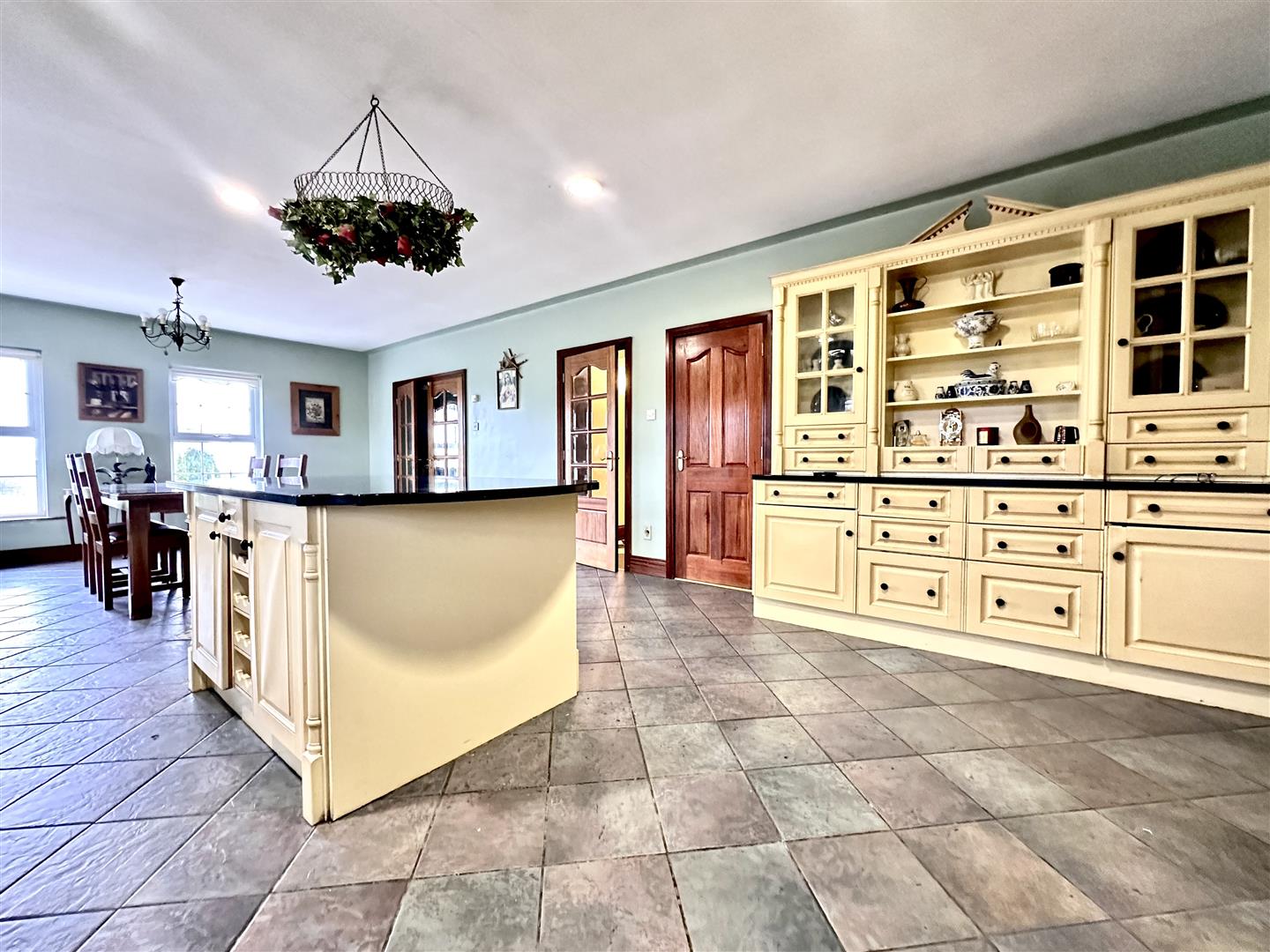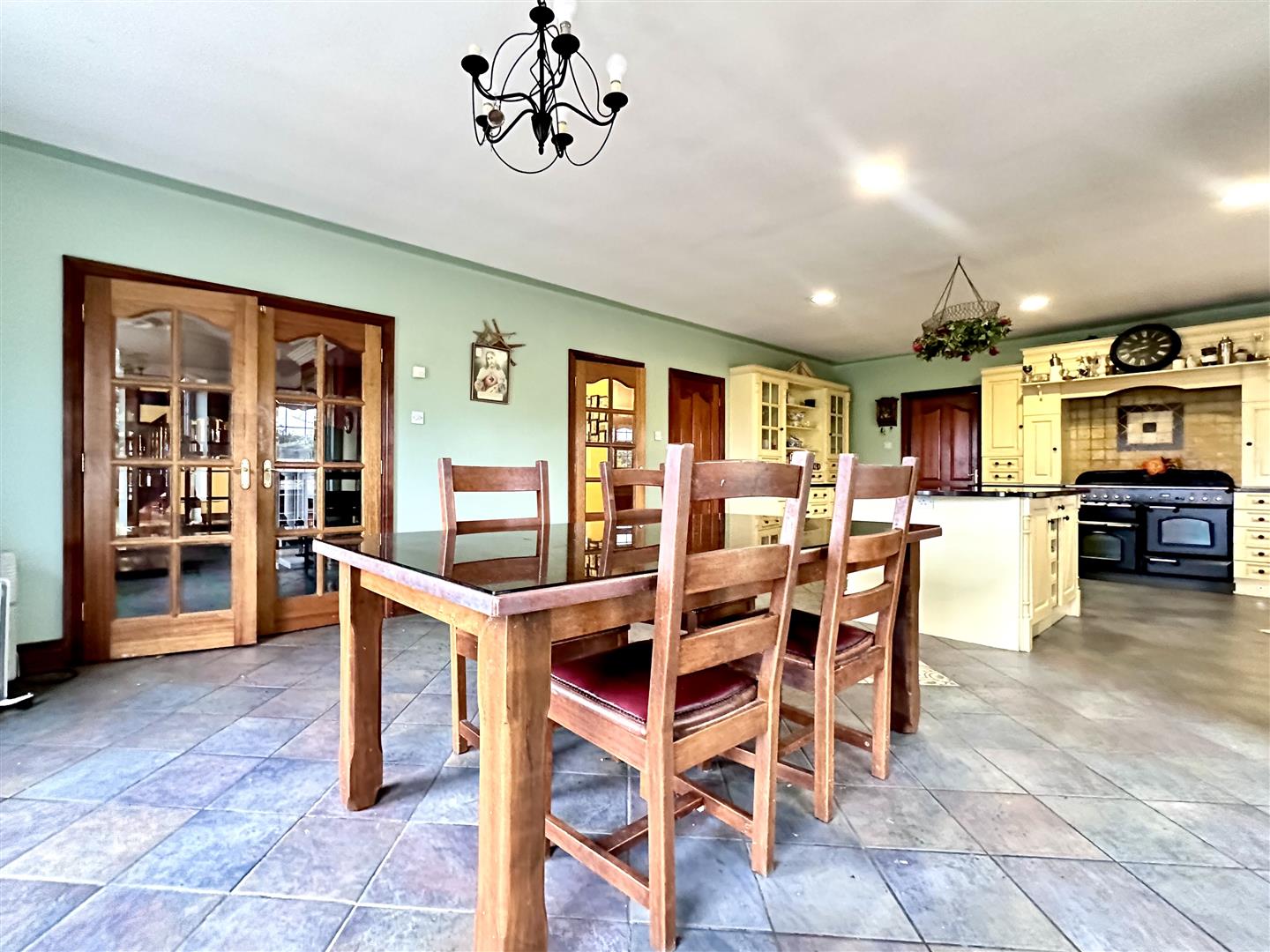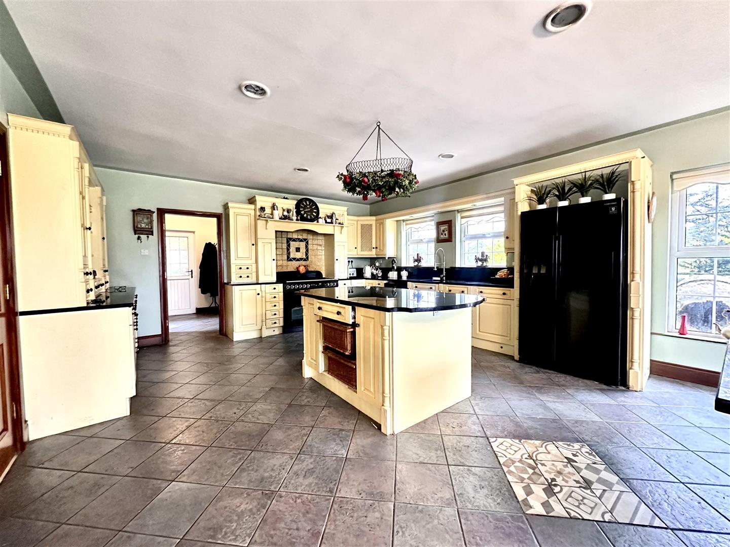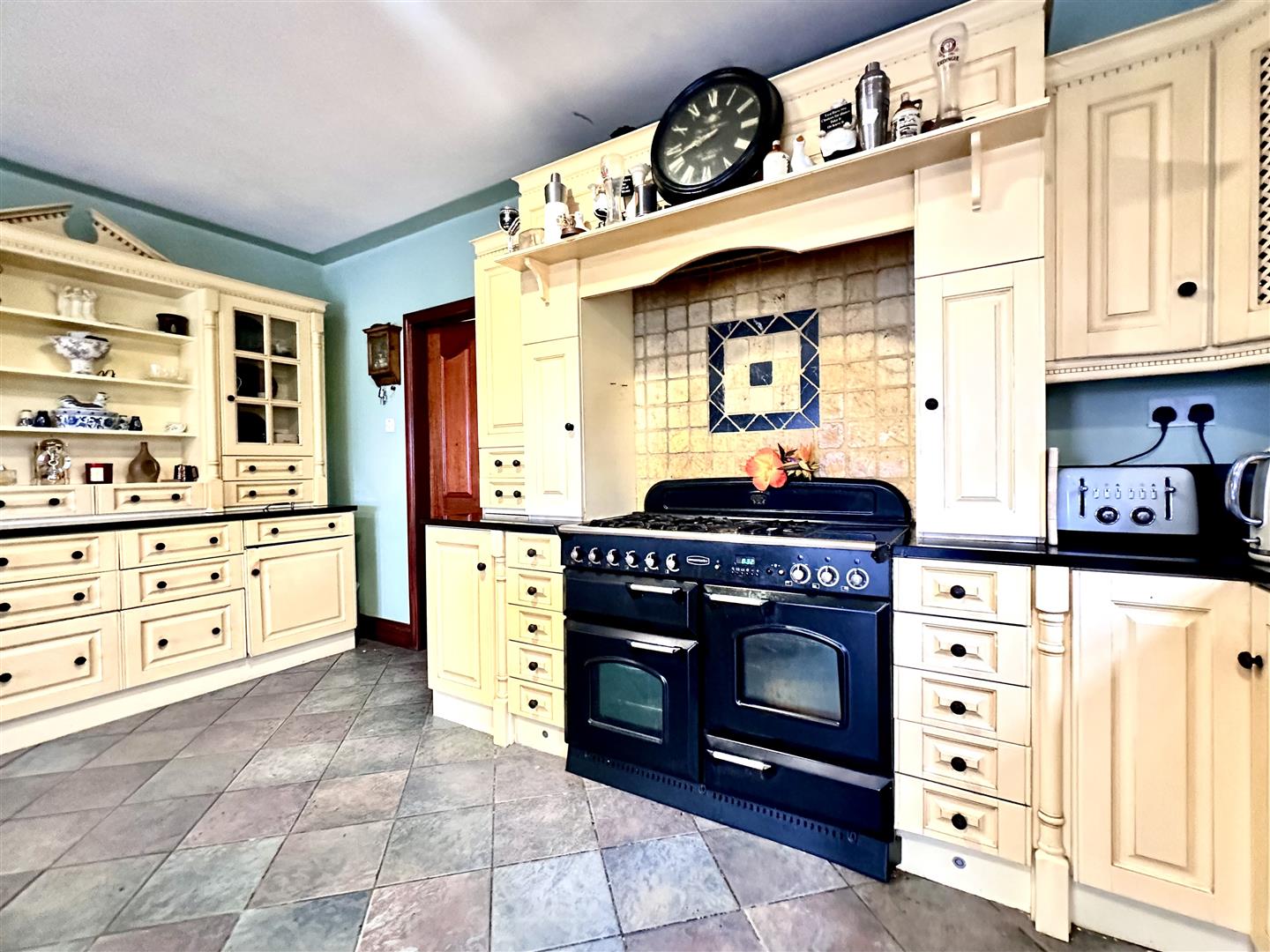 Range of high and low level kitchen units with granite countertops. Matching country style dresser and centre island with granite worktop and storage. Matching over mantle with Freestanding Rangemaster dual cooker with gas hob and electric ovens. American fridge/freezer, Rangemaster dual cooker and dishwasher included in the sale. Stainless steel sink. Concealed lighting under high level units. Tiled floor and splash backs. Television and power points.