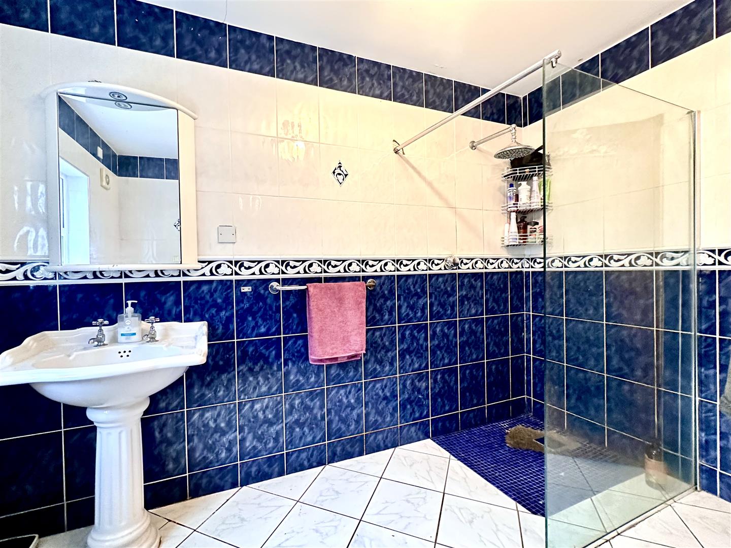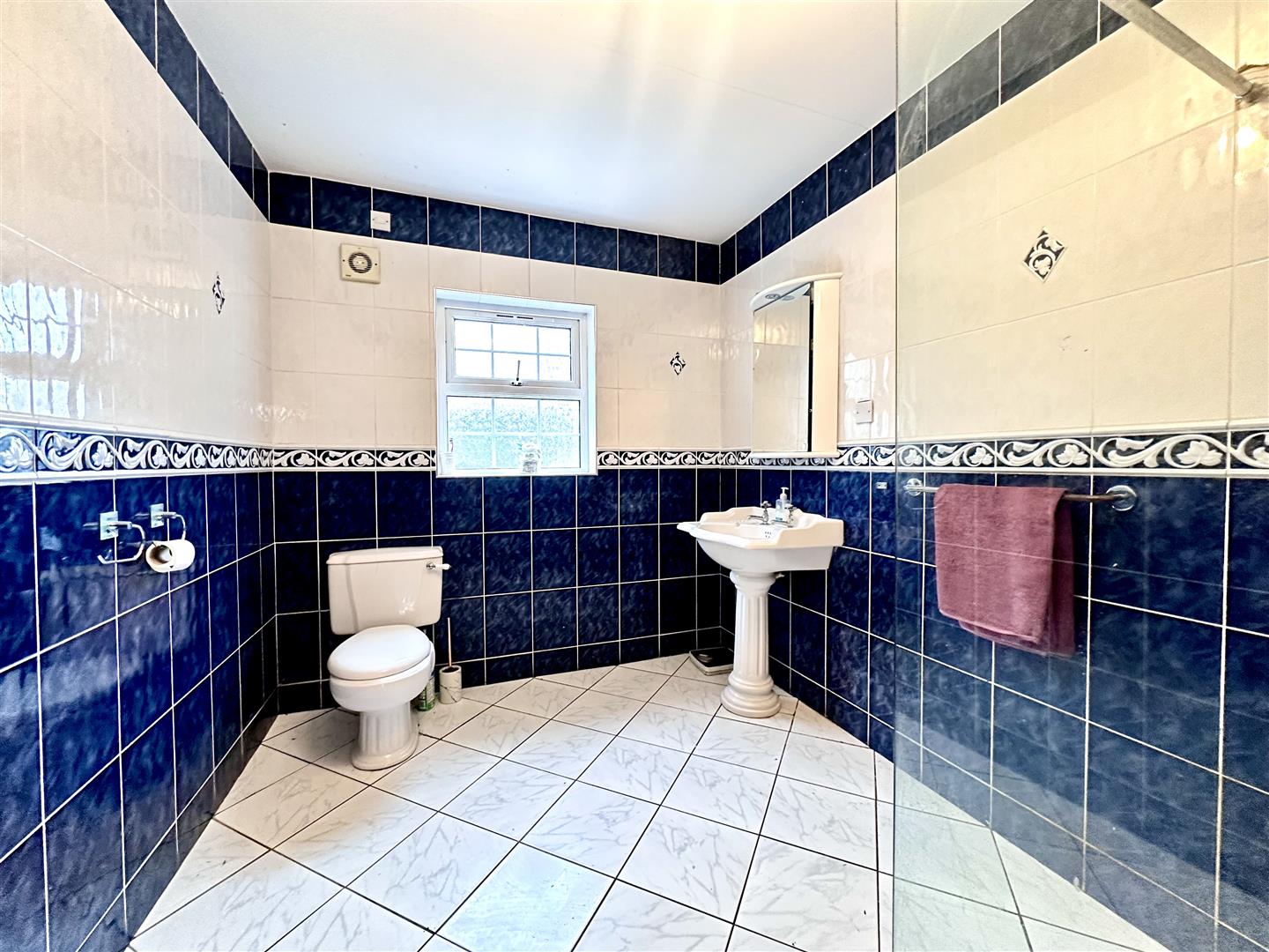 White suite. Low flush wc and pedestal wash hand basin. Walk in wet area with power shower. Tiled walls and floor. Extractor fan.