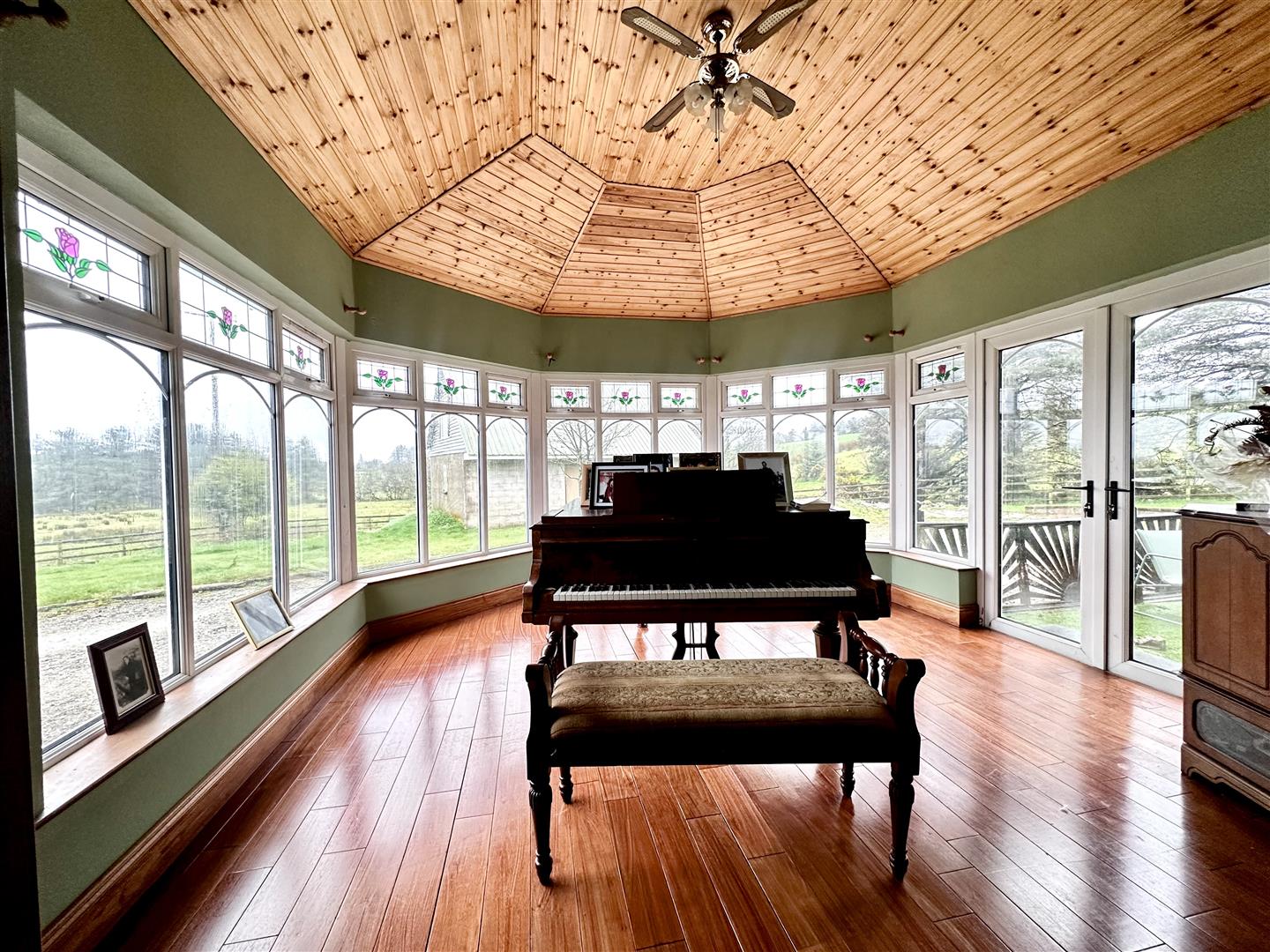 Solid wooden floor. Moulded centre rose. Power points. P.V.C. patio doors.