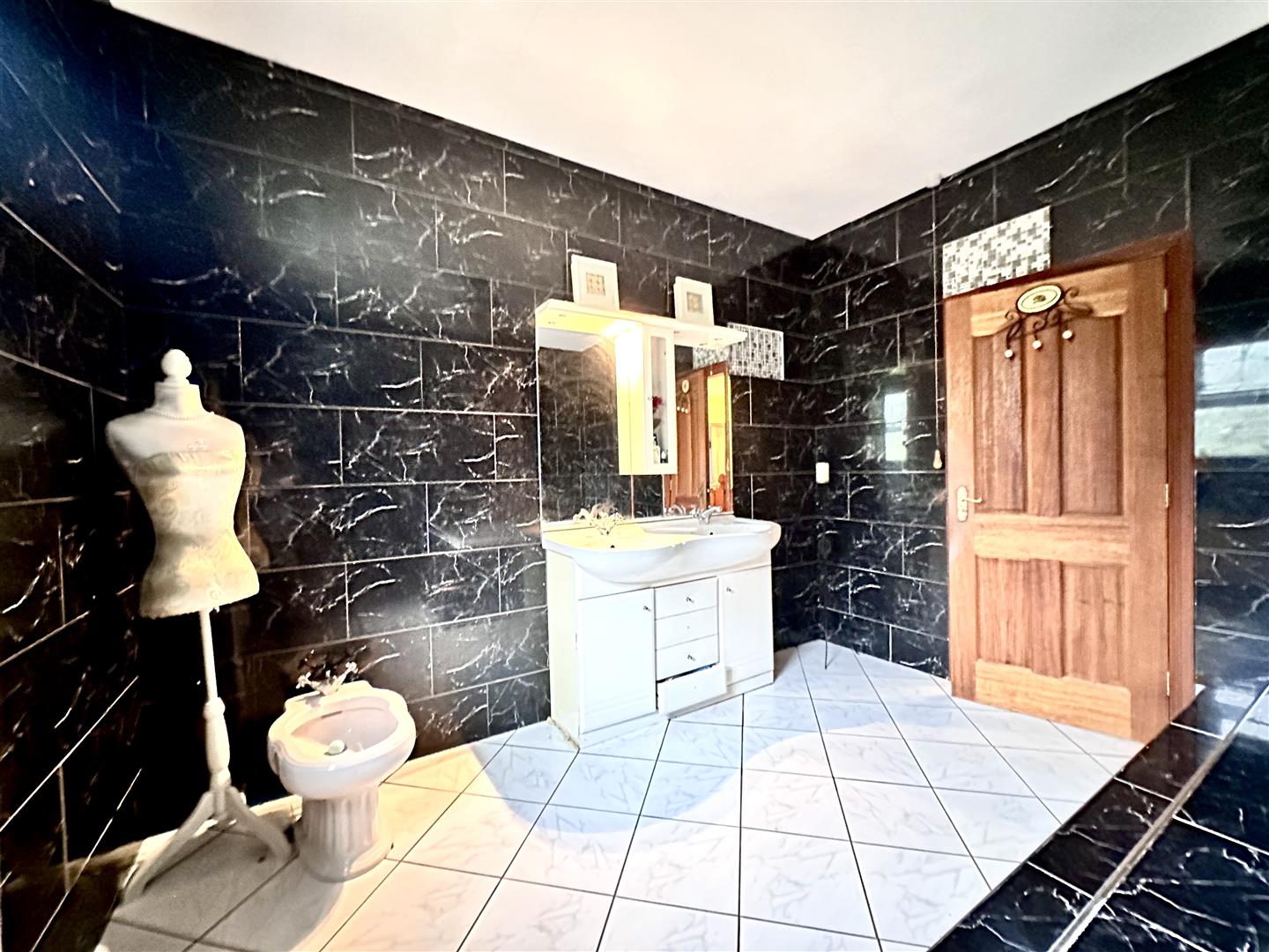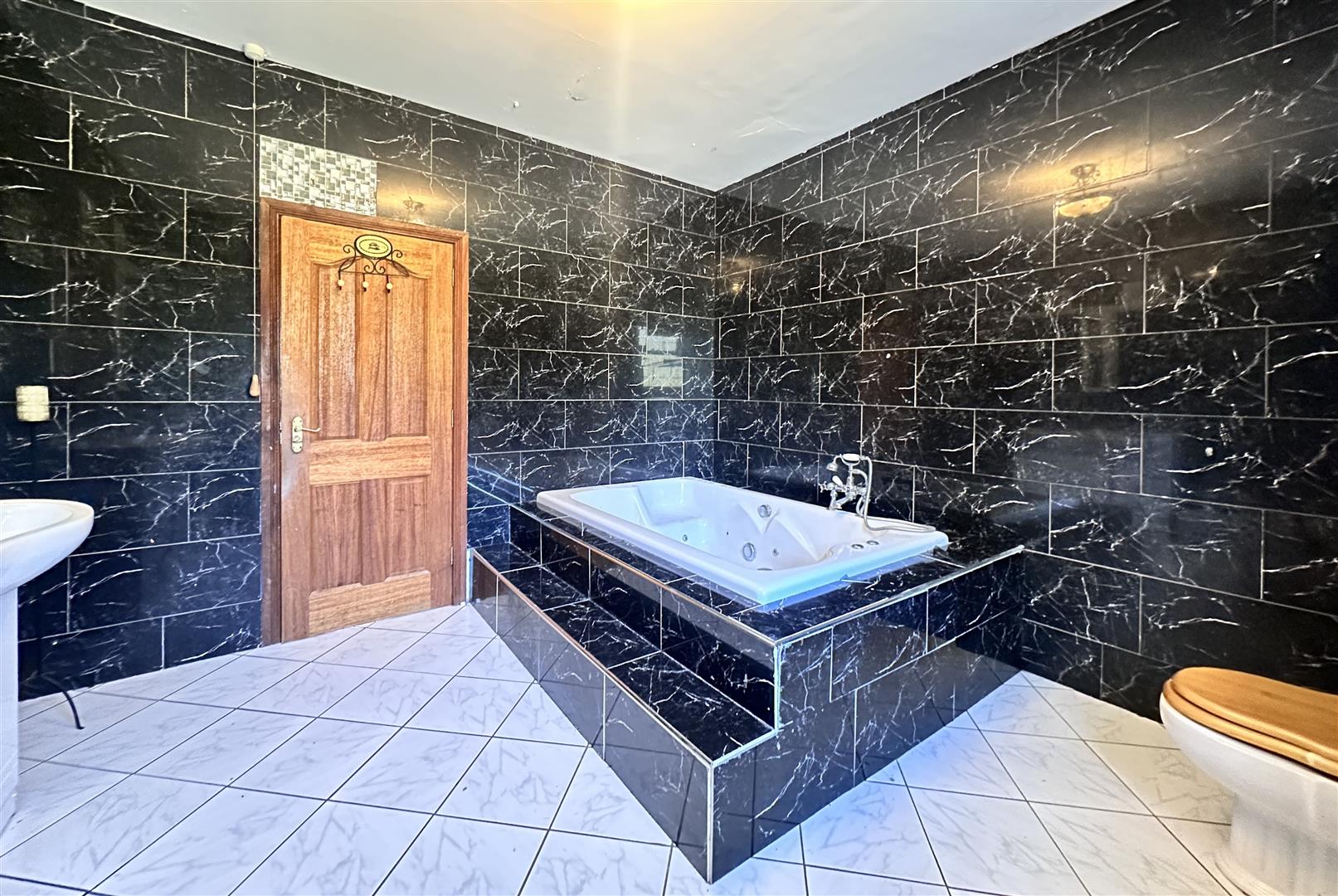 White suite. Built in double ended inset Jacuzzi bath with tiled surround and step. Low flush wc, double basins in vanity unit. Mirror with fitted light. Tiled walls and floor.