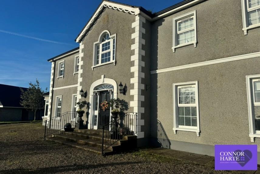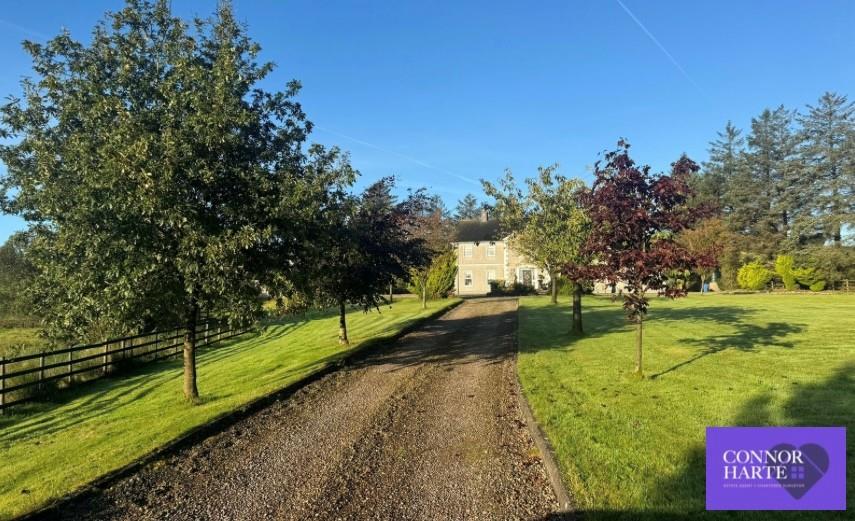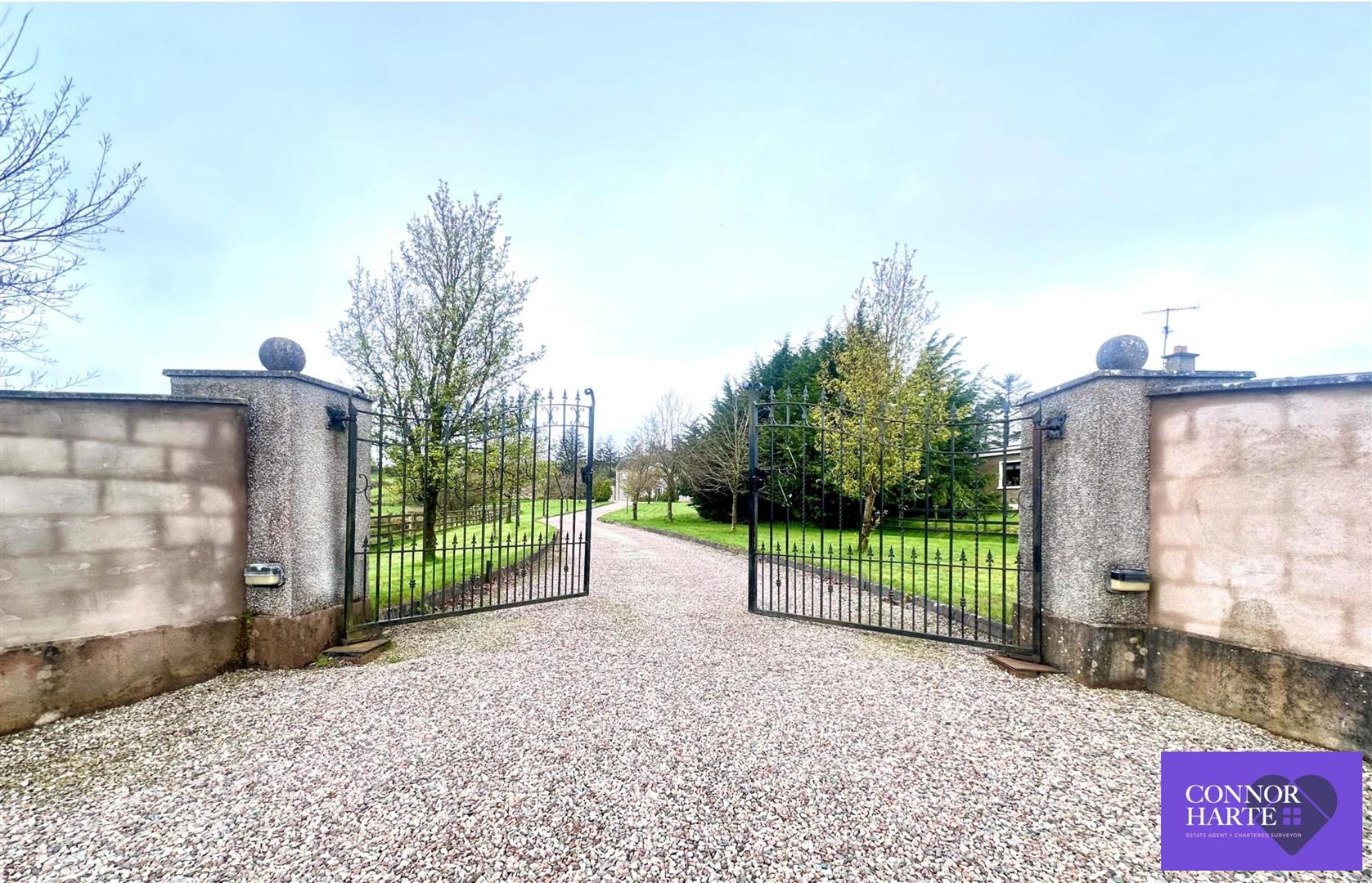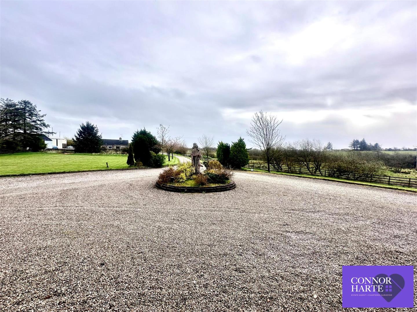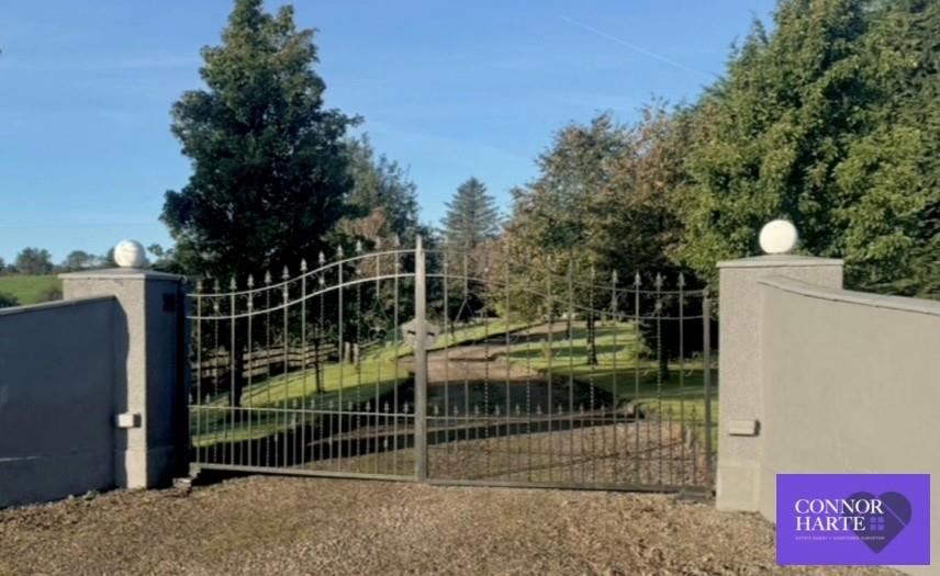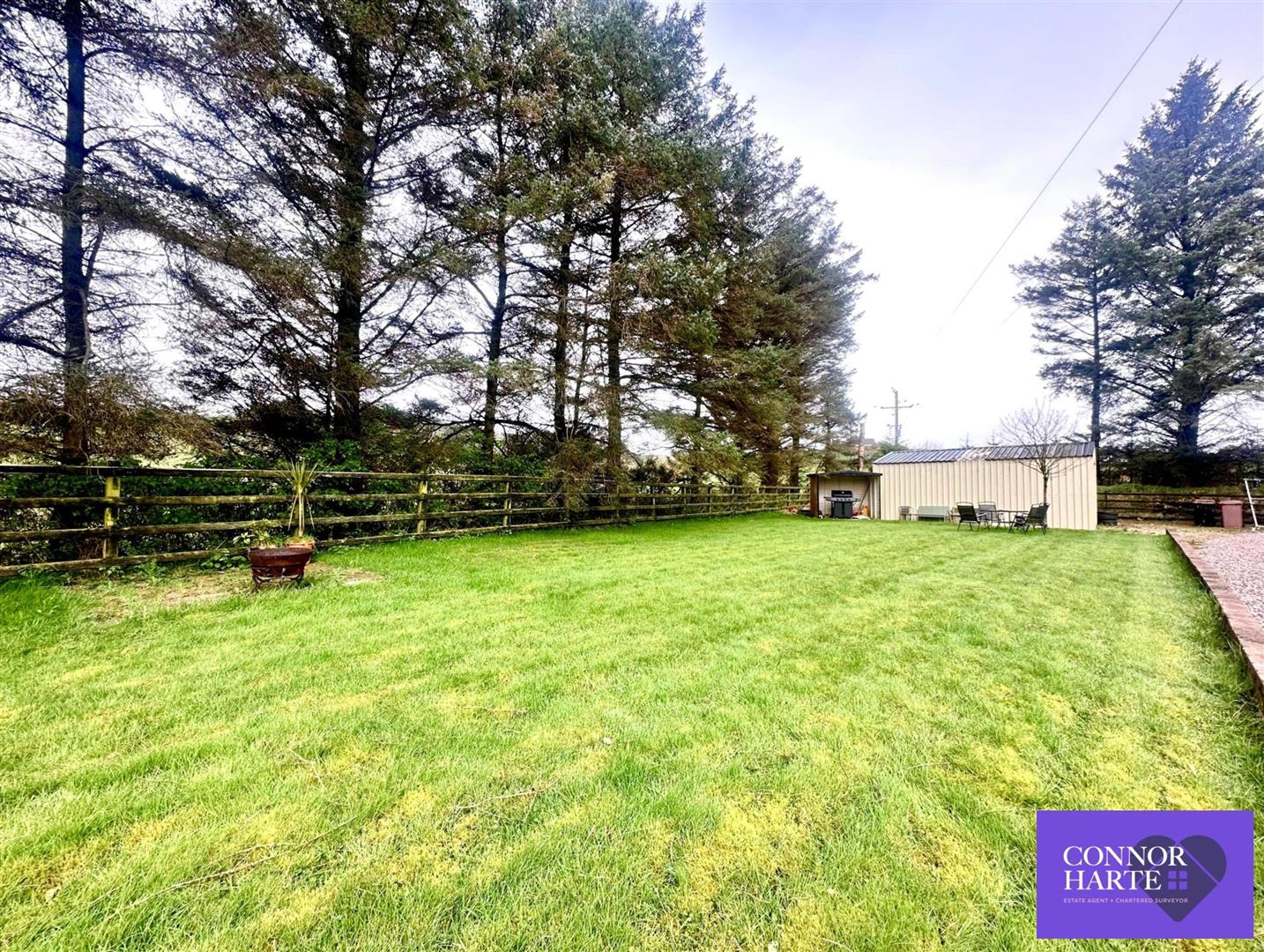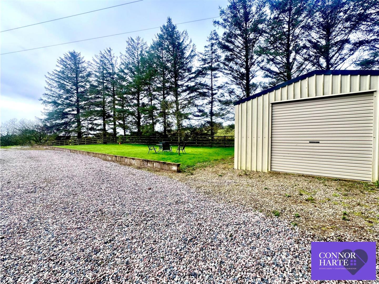 Electrically operated gated entrance to a stone driveway and parking area. Tree lined stone driveway with feature turning circle. Lawns laid out in lawn with D Rail fencing. Outside lighting. To rear of the property is a garden shed and store. Outside lighting and cold tap.