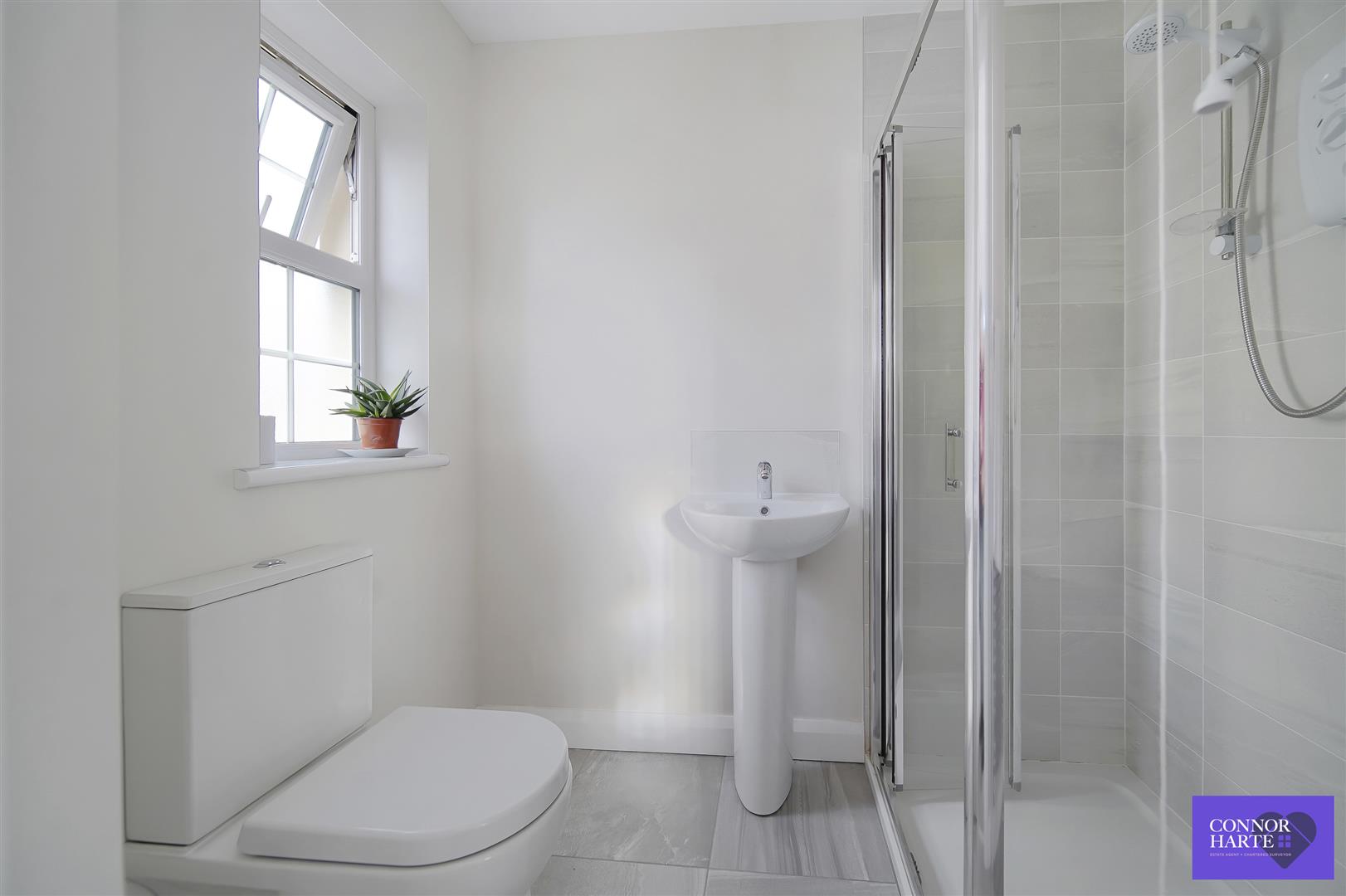 White suite with chrome fittings. Low flush wc, pedestal wash hand basin with mixer taps. Tiled shower cubicle with Triton electric shower. Extractor fan. Heated towel radiator.