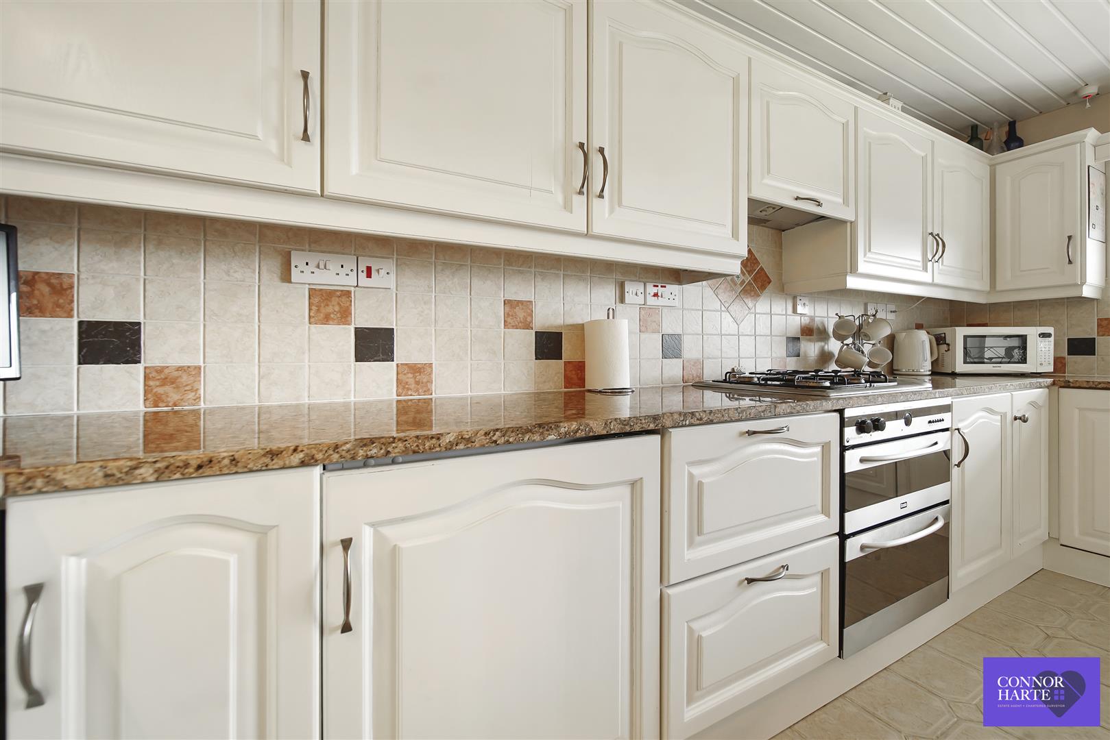 Modern fitted Cream kitchen with high and low level units and granite counter tops. Concealed lighting under high level units. Integrated fridge and dishwasher. Built in electric "Creda" oven and grill and "Indesit" 4-ring gas hob. Extractor hood with fan and light. Tiled floor and splash backs, single bowl stainless steel "Franke" sink. Television and points. P.V.C. external door leading to rear garden.