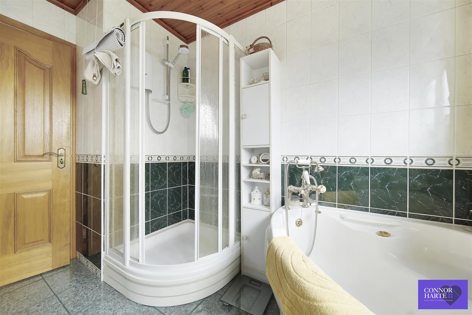 P.V.C. pedestrian door to the side of the garage/utility area. Up and over garage door to the front. The garage has been partitioned into sections for storage, front of garage and middle section for storage a shower area with wc, sink and also plumbed for automatic washing machine. Part tiled walls and vinyl flooring. Oil burner.