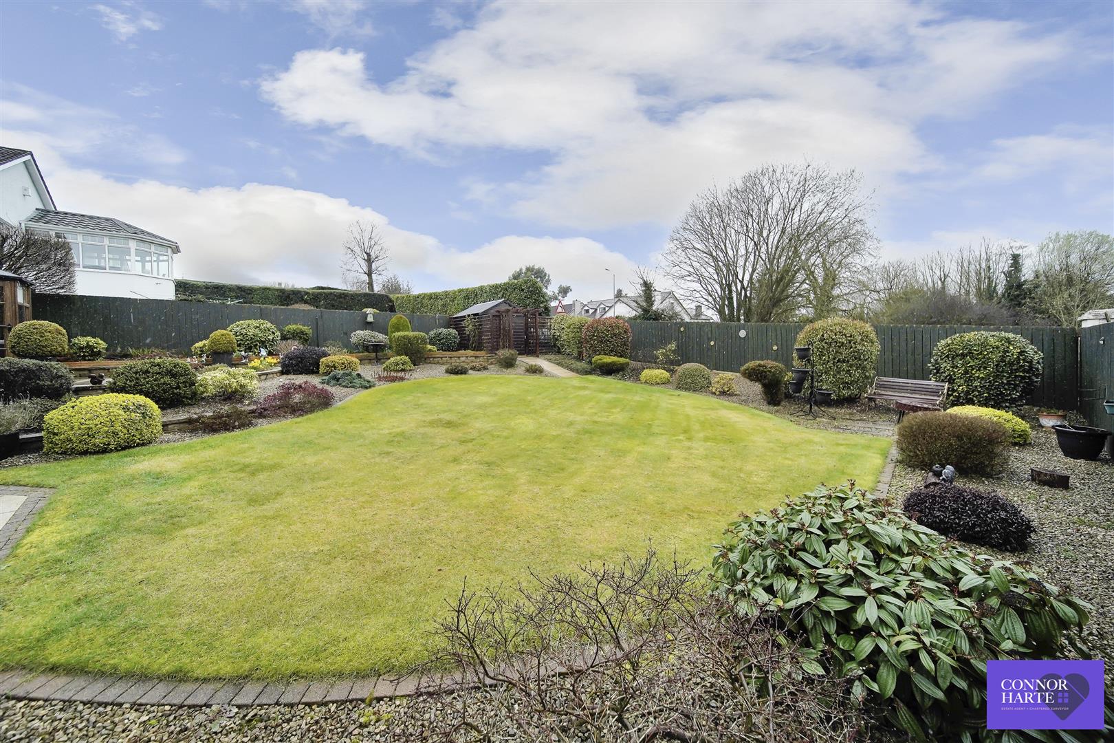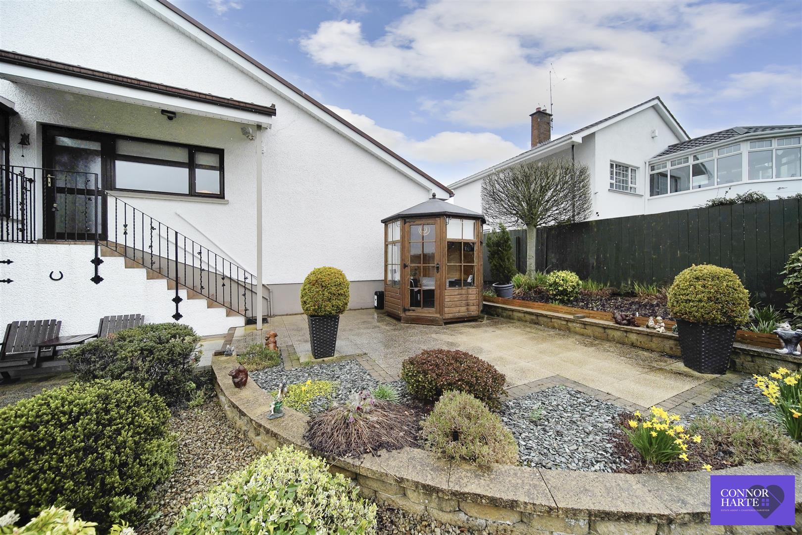 Tiled steps and cast iron hand rail from kitchen leading to paved patio area and rear garden. Garden shed included in sale. Garden to rear laid out in lawn with landscaped shrub and flowerbeds. Sensor security lighting. Storage area paved under steps. Light. Pathways are paved. Cold tap. Tarmac driveway.