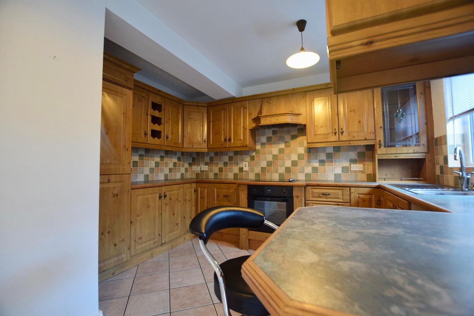 High and low level units, tiled between. Tiled floor. Integrated oven/hob. Space for fridge. Patio doors to rear. - Bathroom