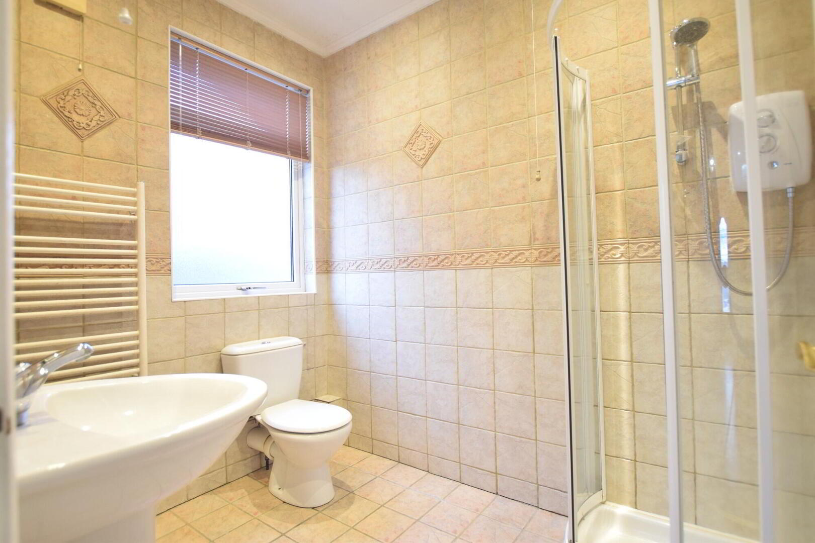 - Tiled flooring and fully tiled walls. Recessed downlighting. Completely tiled corner shower cubicle with electric shower. heated towel rail. Extractor fan.