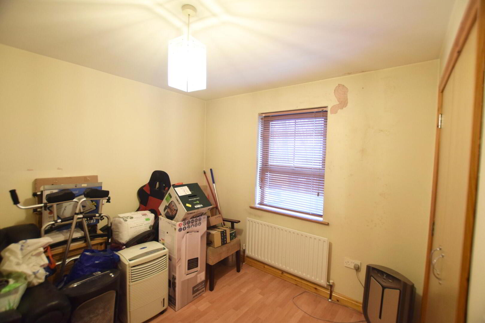 Rear facing double bedroom with laminate flooring and built in wardrobe.