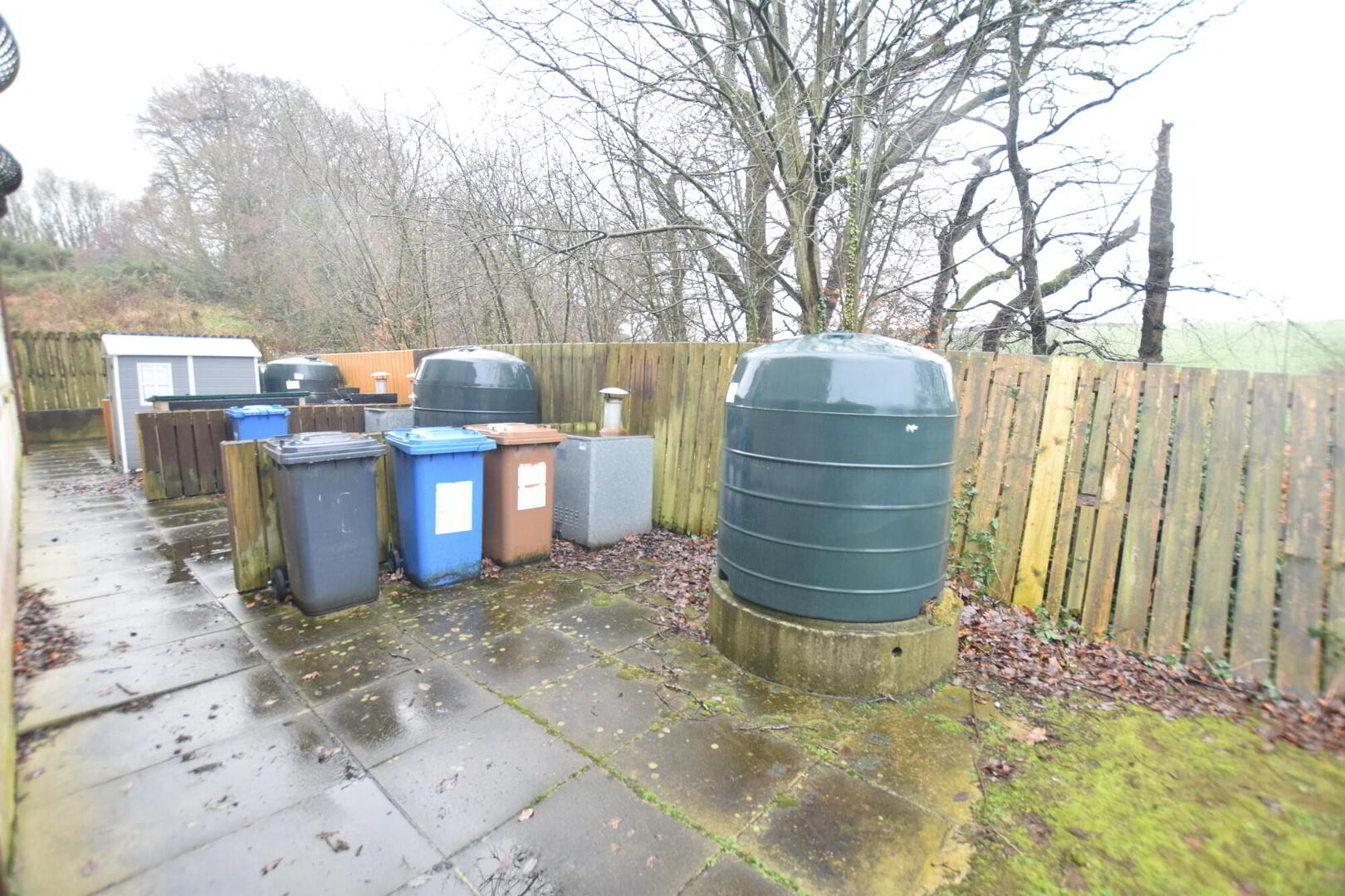 - Rear paved area with oil tank and burner. Bin space.