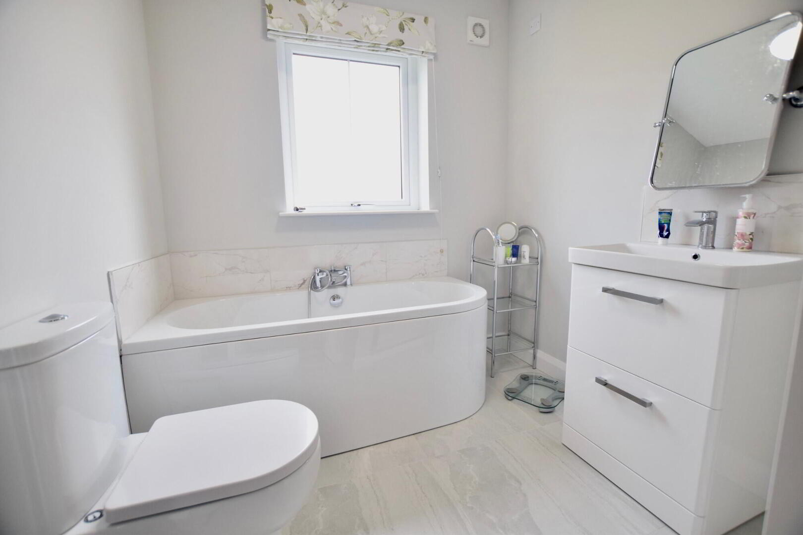 WC, WHB and free standing bath. Separate shower. Heated towel rail. Tiled floor.