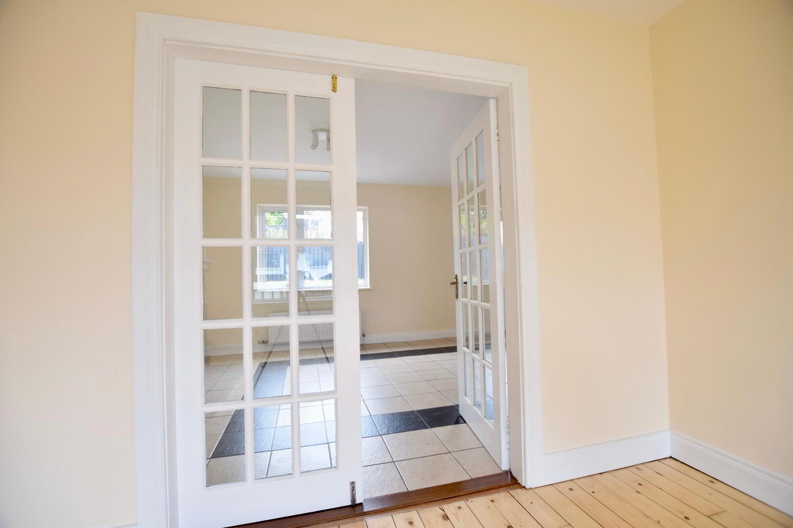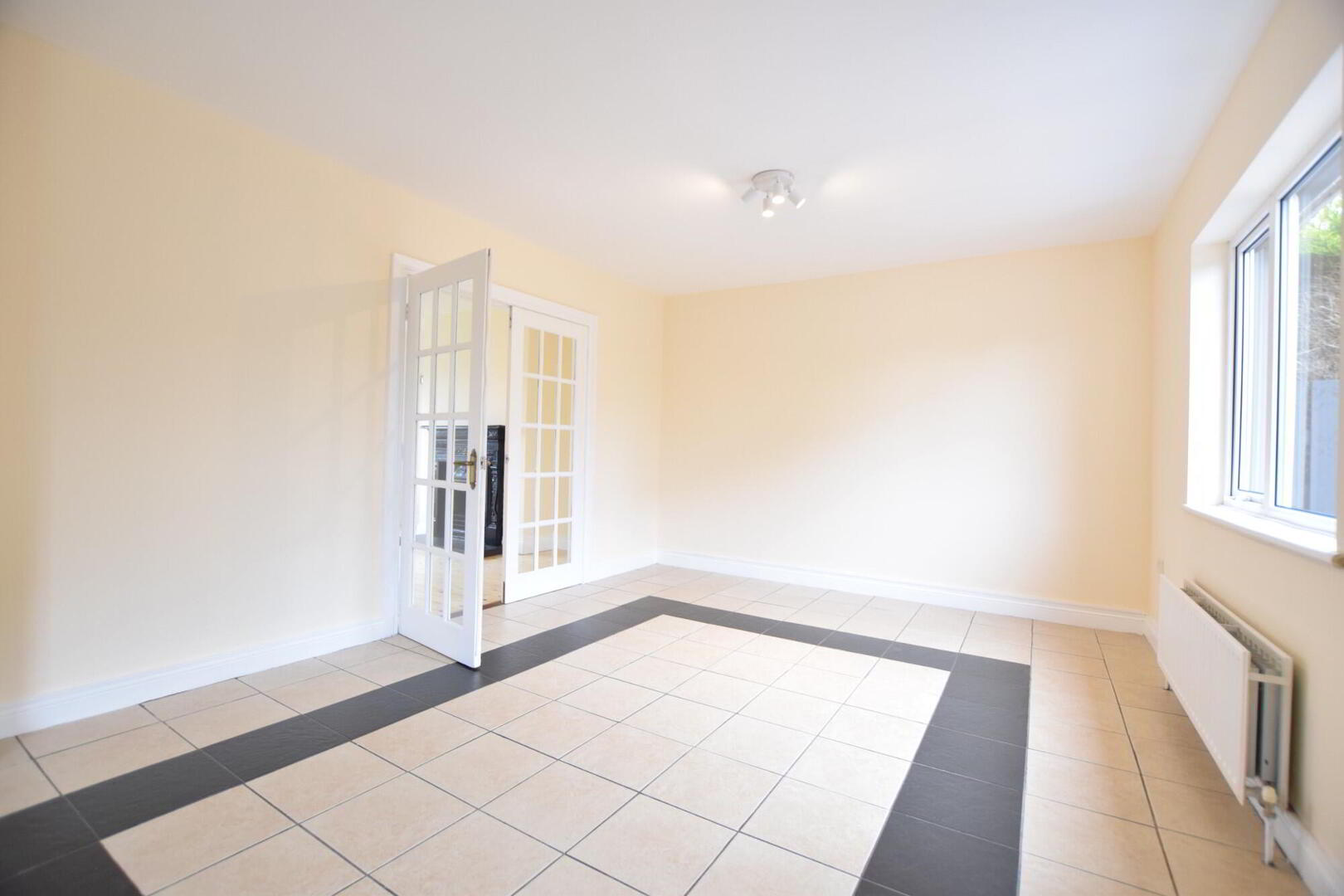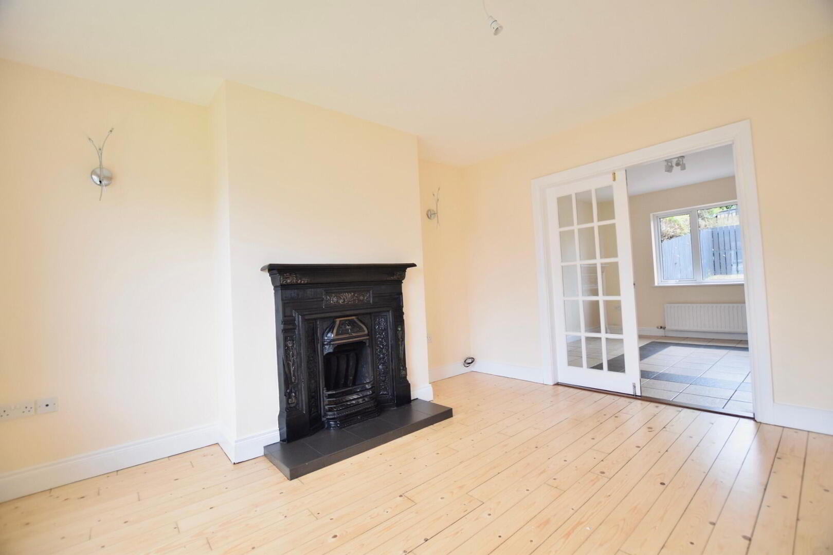 Front facing living room. Wooden flooring, Fireplace with open fire. French doors to kitchen. TV point. - Kitchen