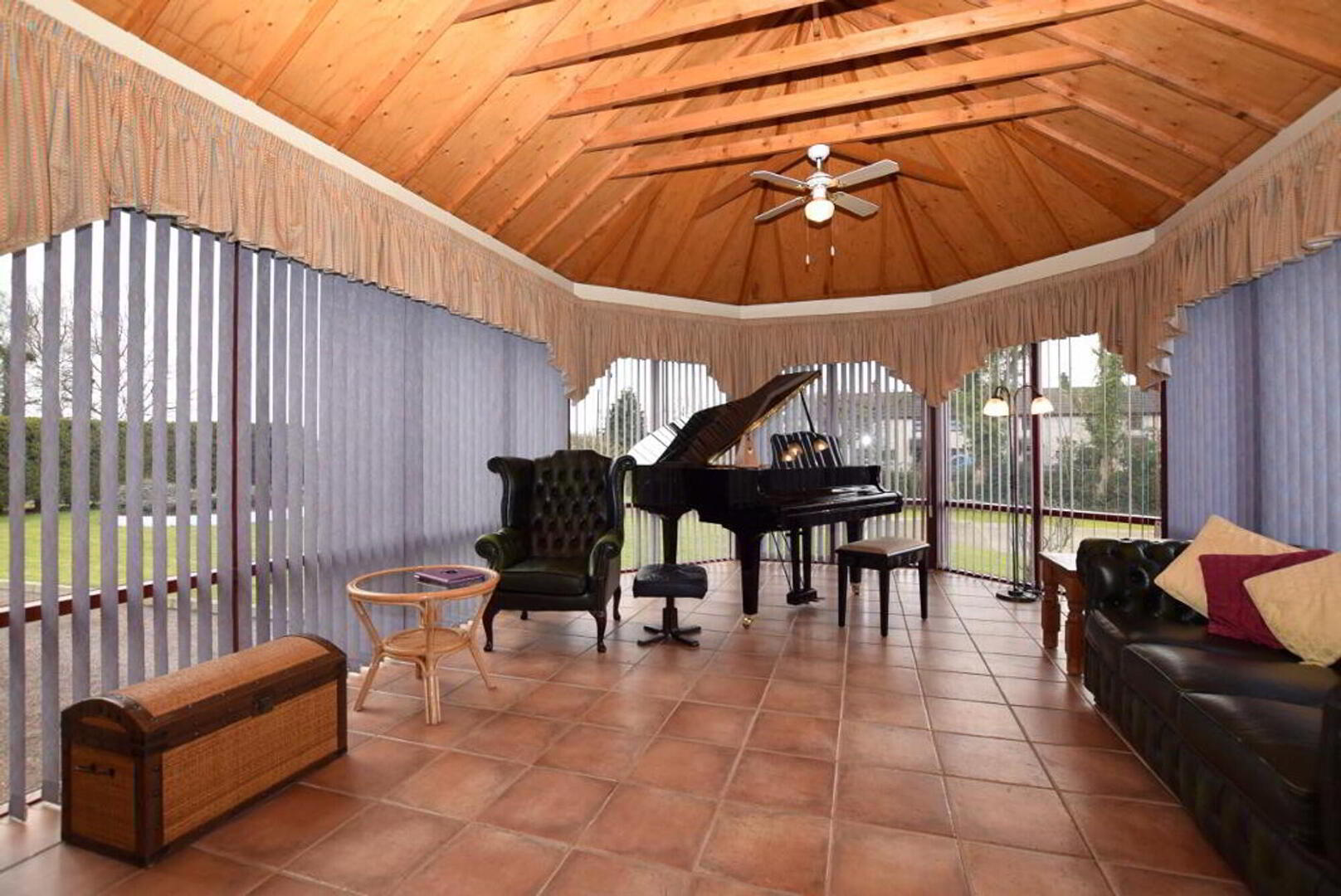 Lounge: 8.9m wide (29' 2) 5.4m long (17' 9) Arched double glazed pine doors from hallway. Large picture window overlooking gardens. Brick built fireplace with cast iron inset. Feature pine clad ceiling. Oak flooring. Sitting area with adjoining dining area. Double glass/pine doors to sun room overlooking gardens. Tiled flooring Feature timber ceiling.