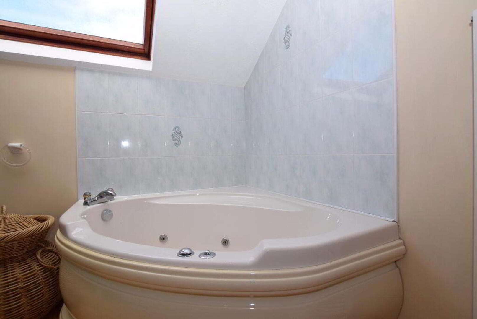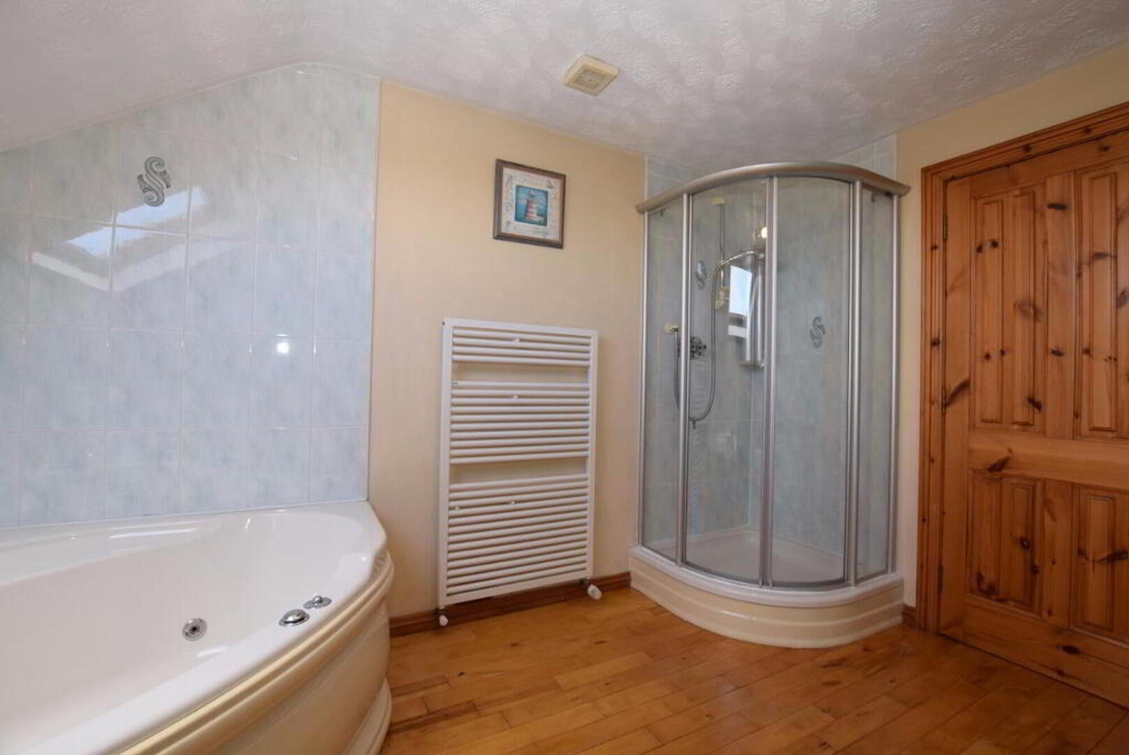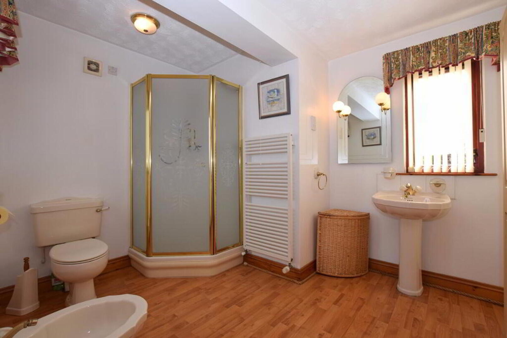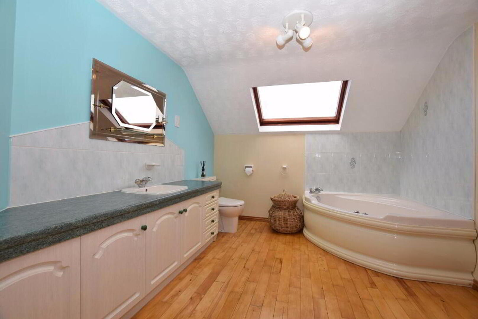 Bathroom: 3.5m wide (11' 6) 2.9m long (9' 6) Corner Jacuzzi bath. W.C., W.H.B in fitted vanity units. Corner shower. Heated towel rail. Part tiled walls. Solid wood flooring. Velux window.