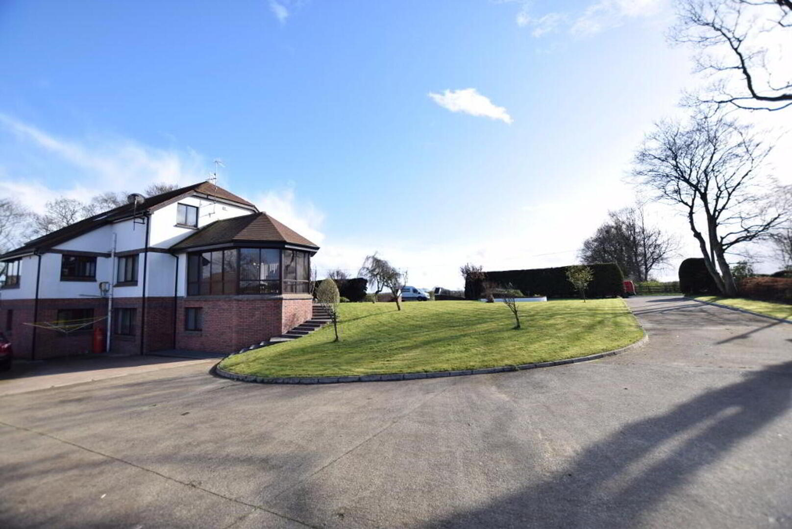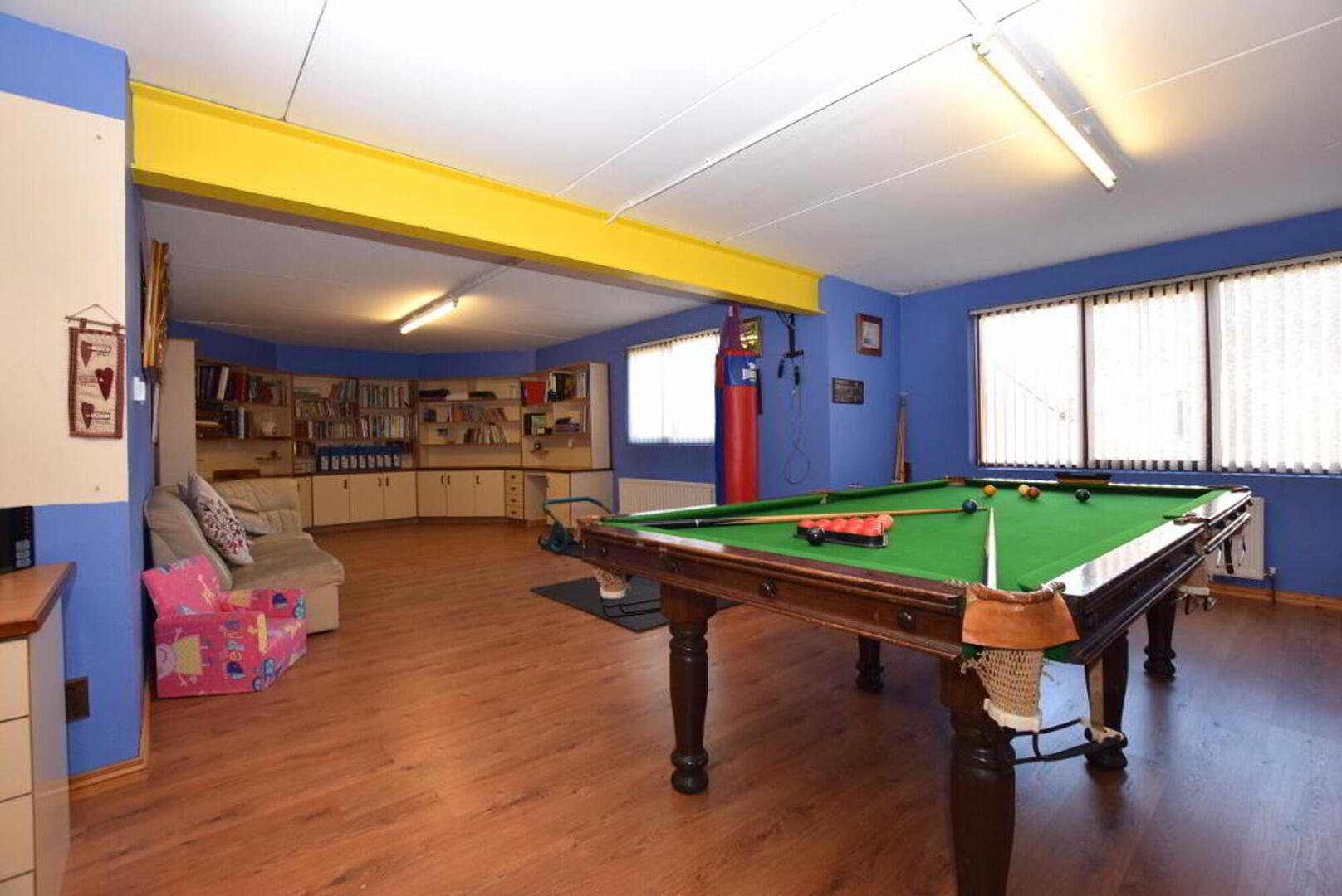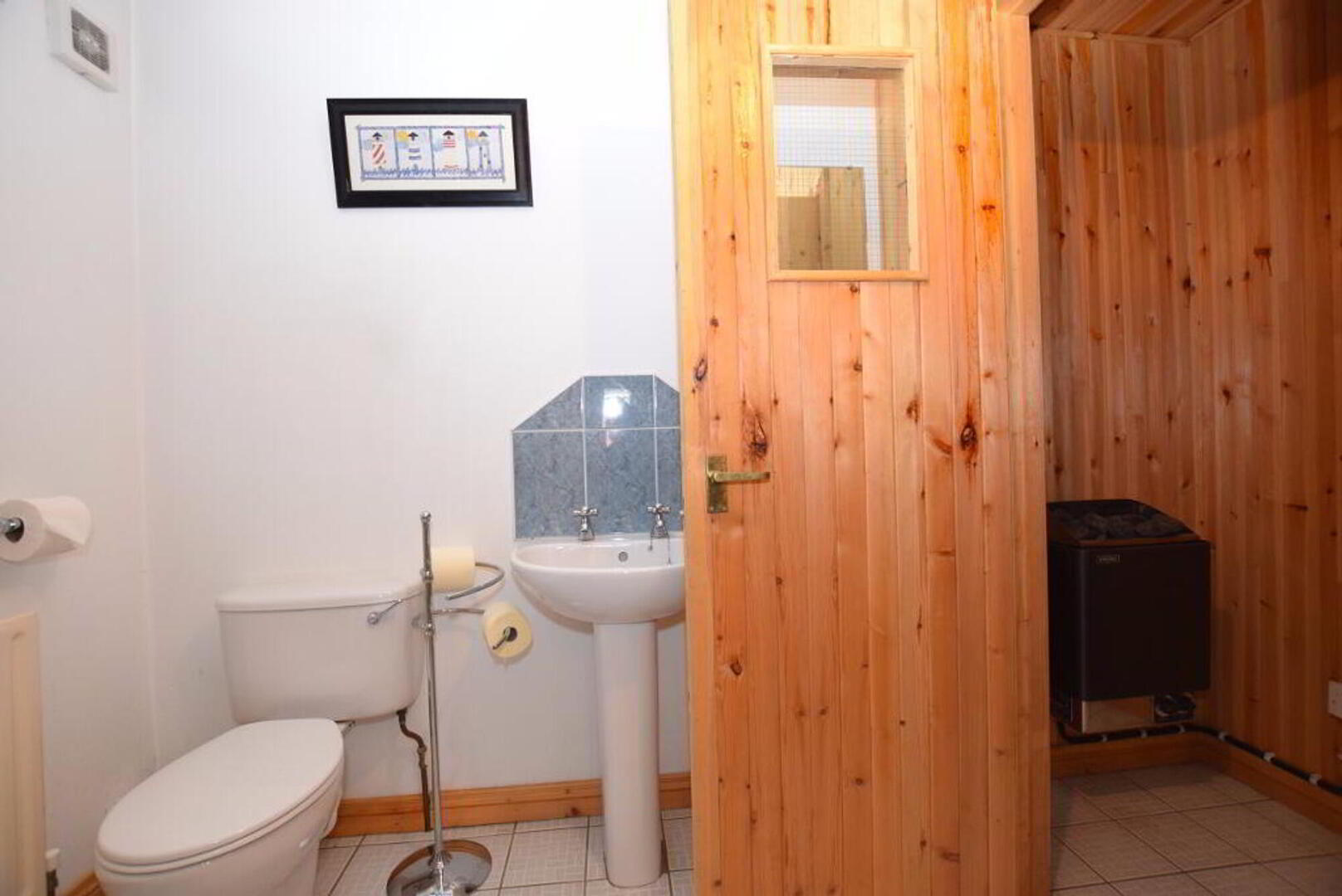 Basement area: Stairs from kitchen to tiled hallway and sitting area, stable door to rear yard. W.C. and corner shower. Sauna. Utility room with fitted units (6.2m x 2.4m) Storage room (plumbed for oil fired boiler). Games room/sitting area/office with laminate flooring (9.8m x 8.7m). Access to integrated garage with roller door.