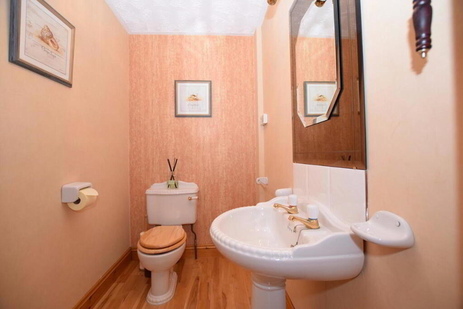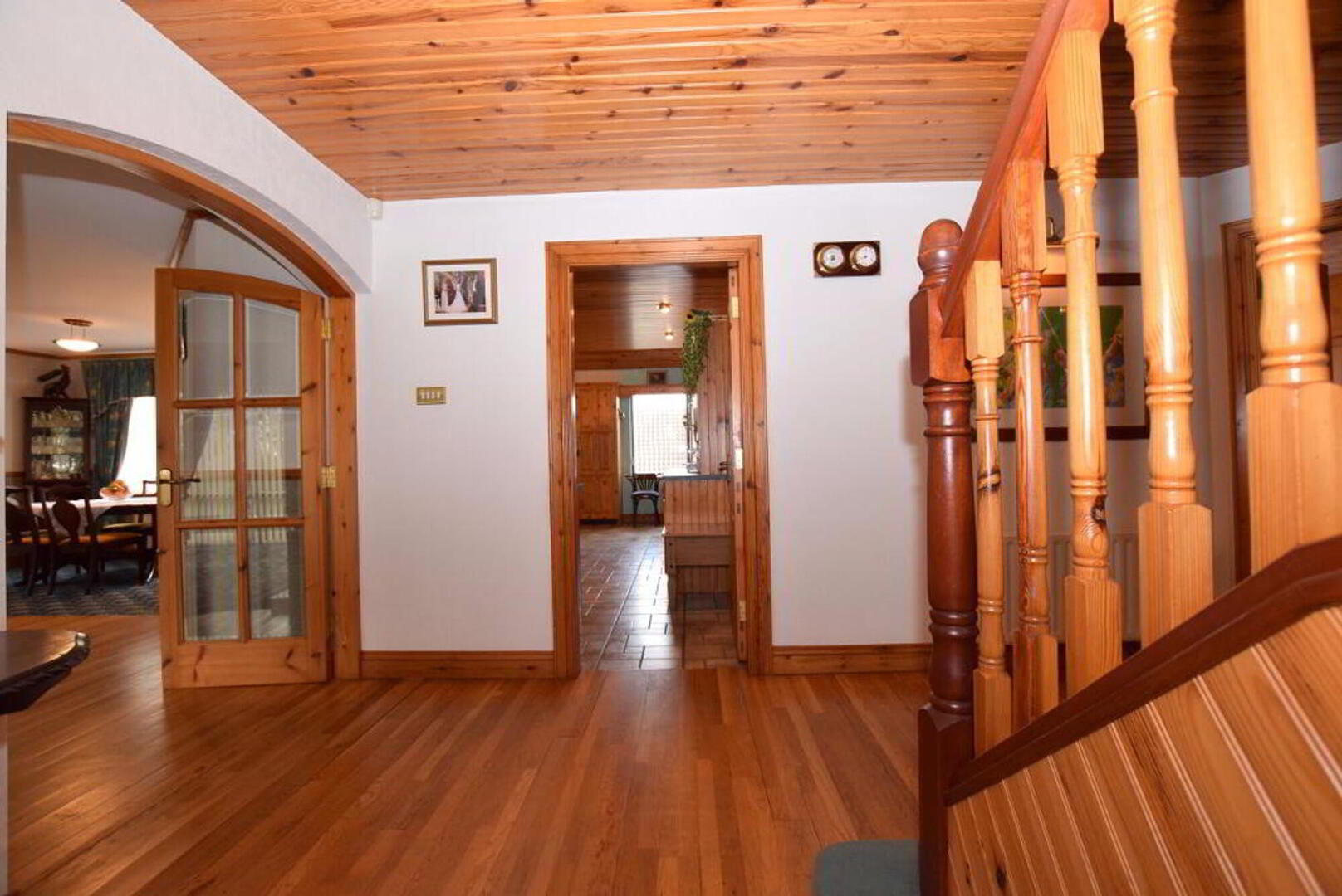 Entrance hallway: Mahogany door with glazed side panel. Oak flooring. Timber ceiling with gallery landing. W.C. & W.H.B with solid wood flooring.