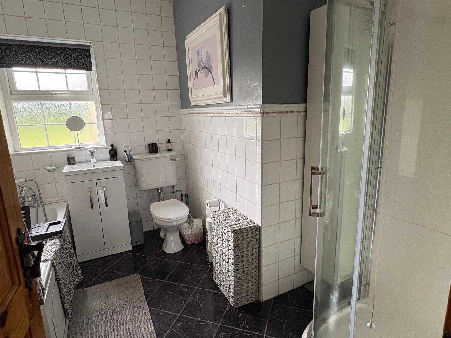 WC. WHB. Bath. Corner power shower. Tiled floor. Partially tiled walls. - Exterior