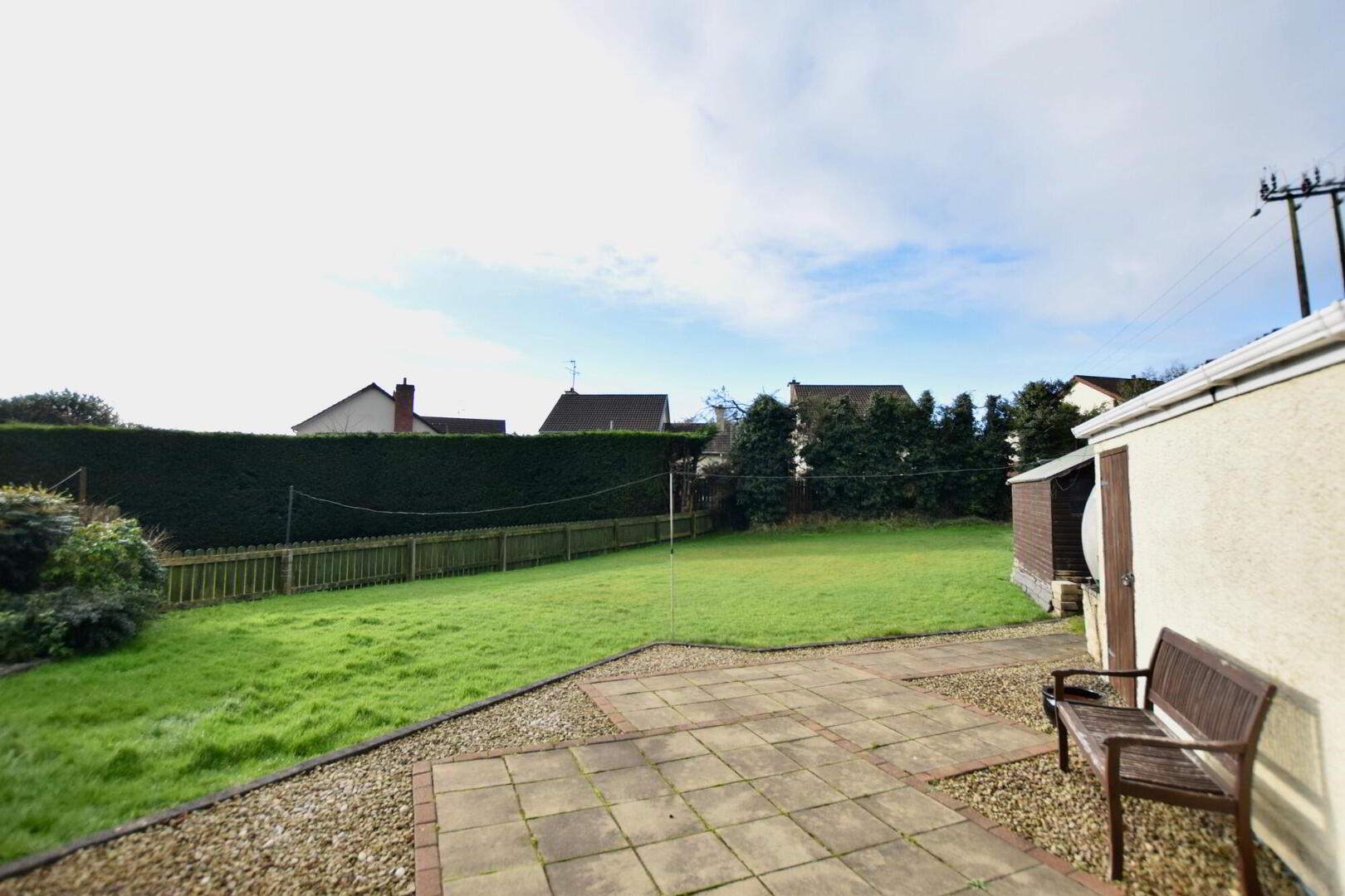 - front garden in lawn. Driveway and parking area to front and side with access to garage. Rear gardens in lawn with patio area. Coal shed. Garden shed.
