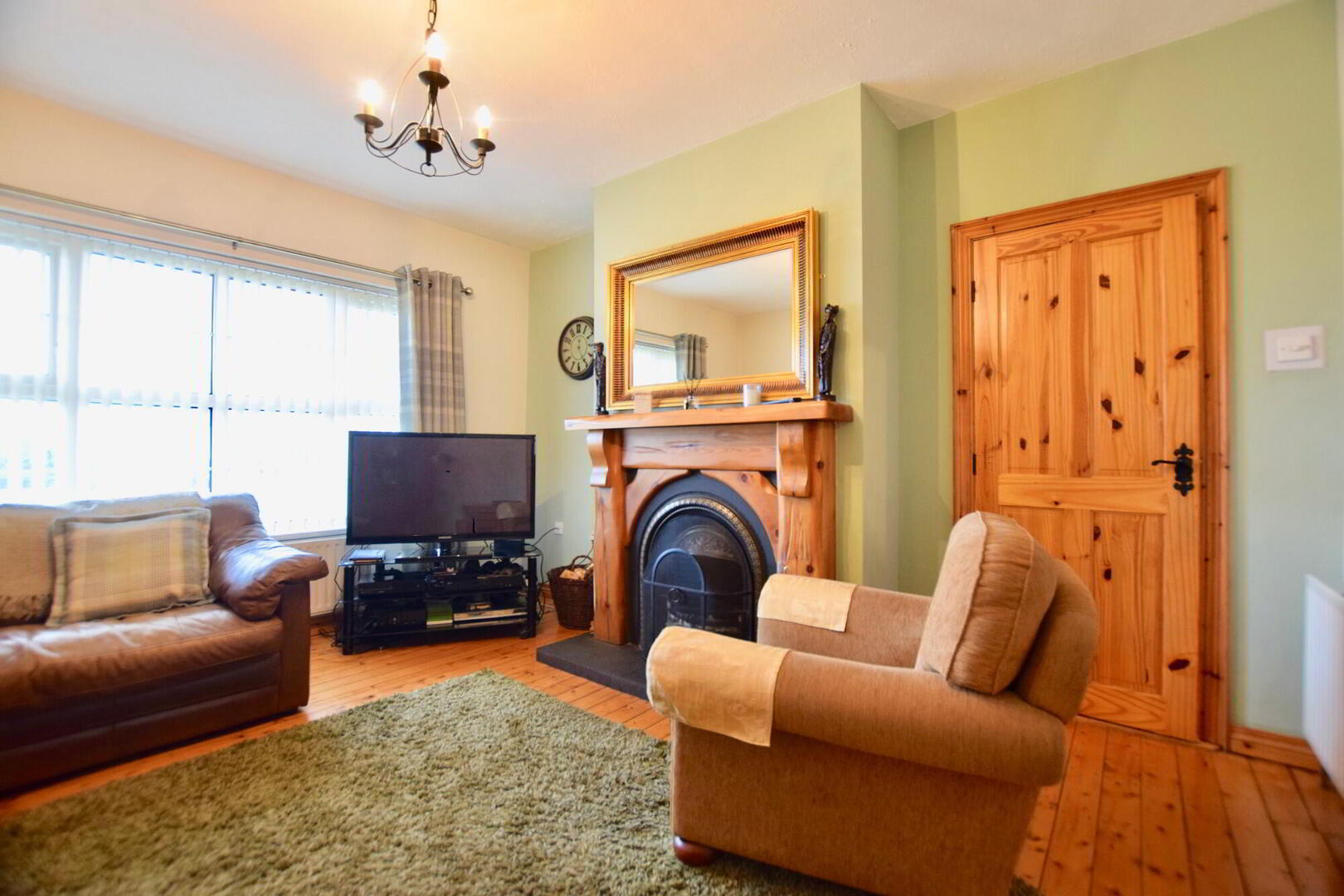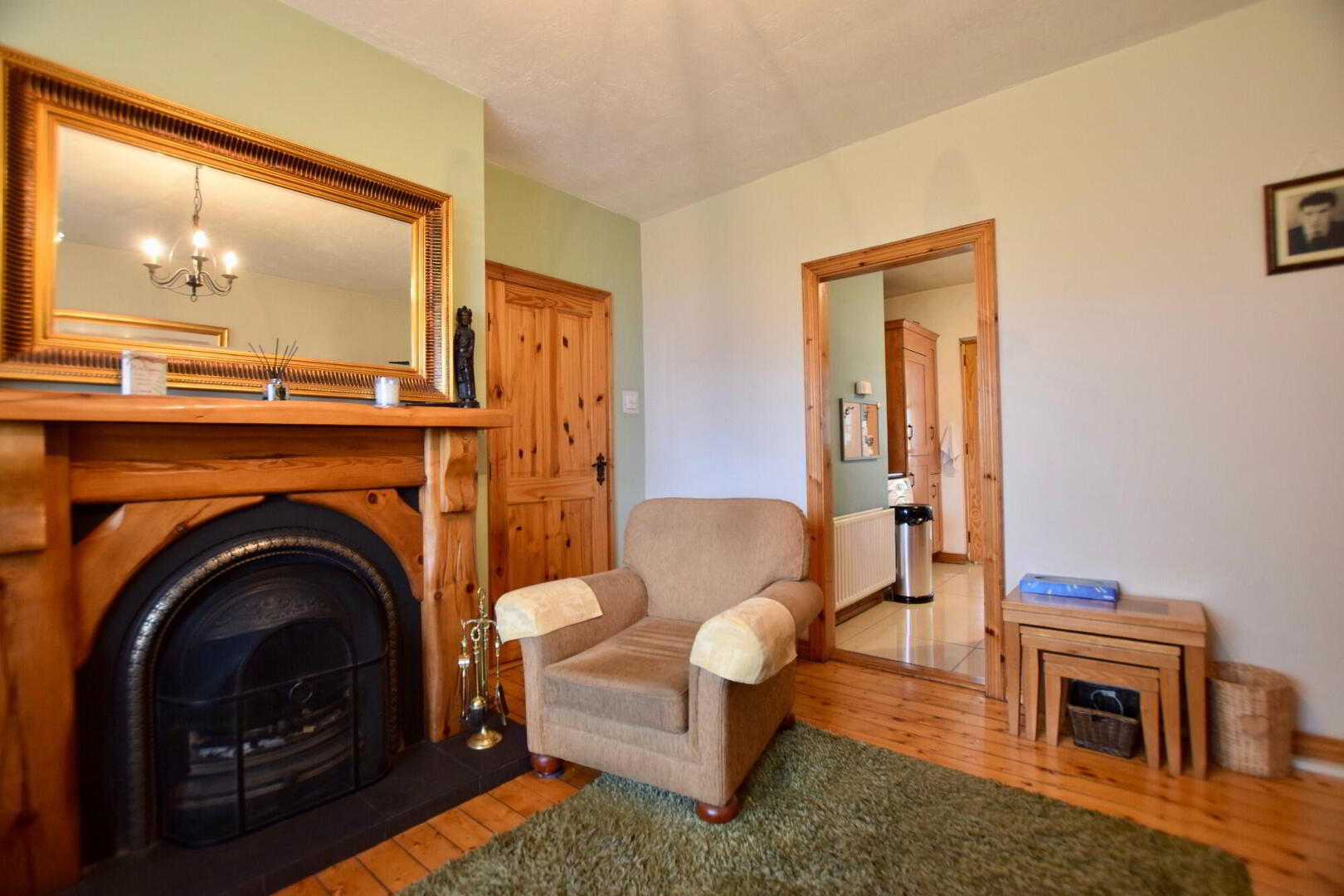 Front facing living room. Wooden flooring. TV point. Feature fireplace with open fire. - Kitchen