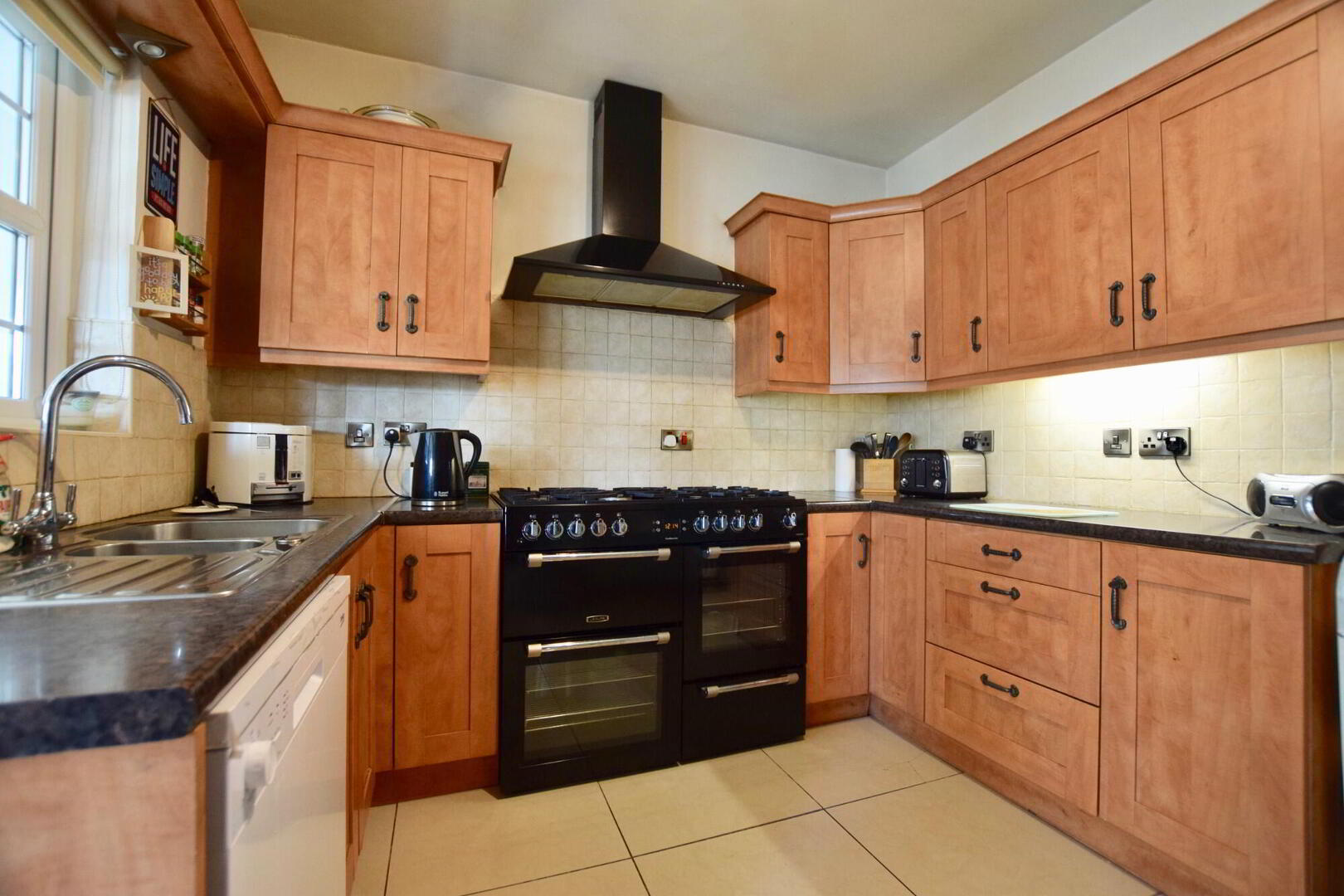 Fully fitted kitchen with high and low level units, tiled between. Tiled floor. Space for washing machine and dishwasher. Space for double cooker. Integrated fridge/freezer. - Sun Room / dining room