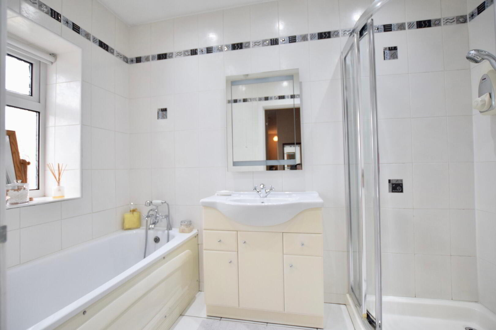 Tiled floor. Tiled walls. Bath. Sink in vanity unit. Shower in corner cubicle. - W.C
