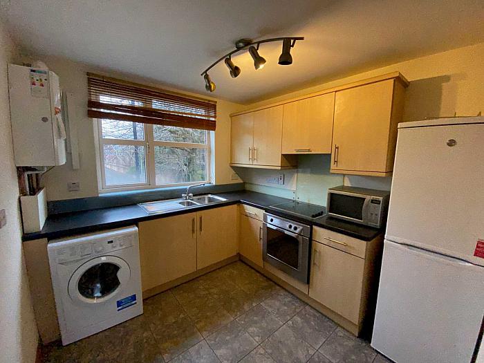 Range of high and low level units built hob, oven and extractor fan, space for washing machine, fridge/freezer. Tiled Floor
