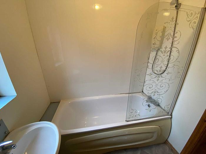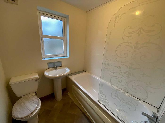 White suite to include panelled bath with shower over, mixer tap over basin, low flush toilet. Tiled effect flooring.