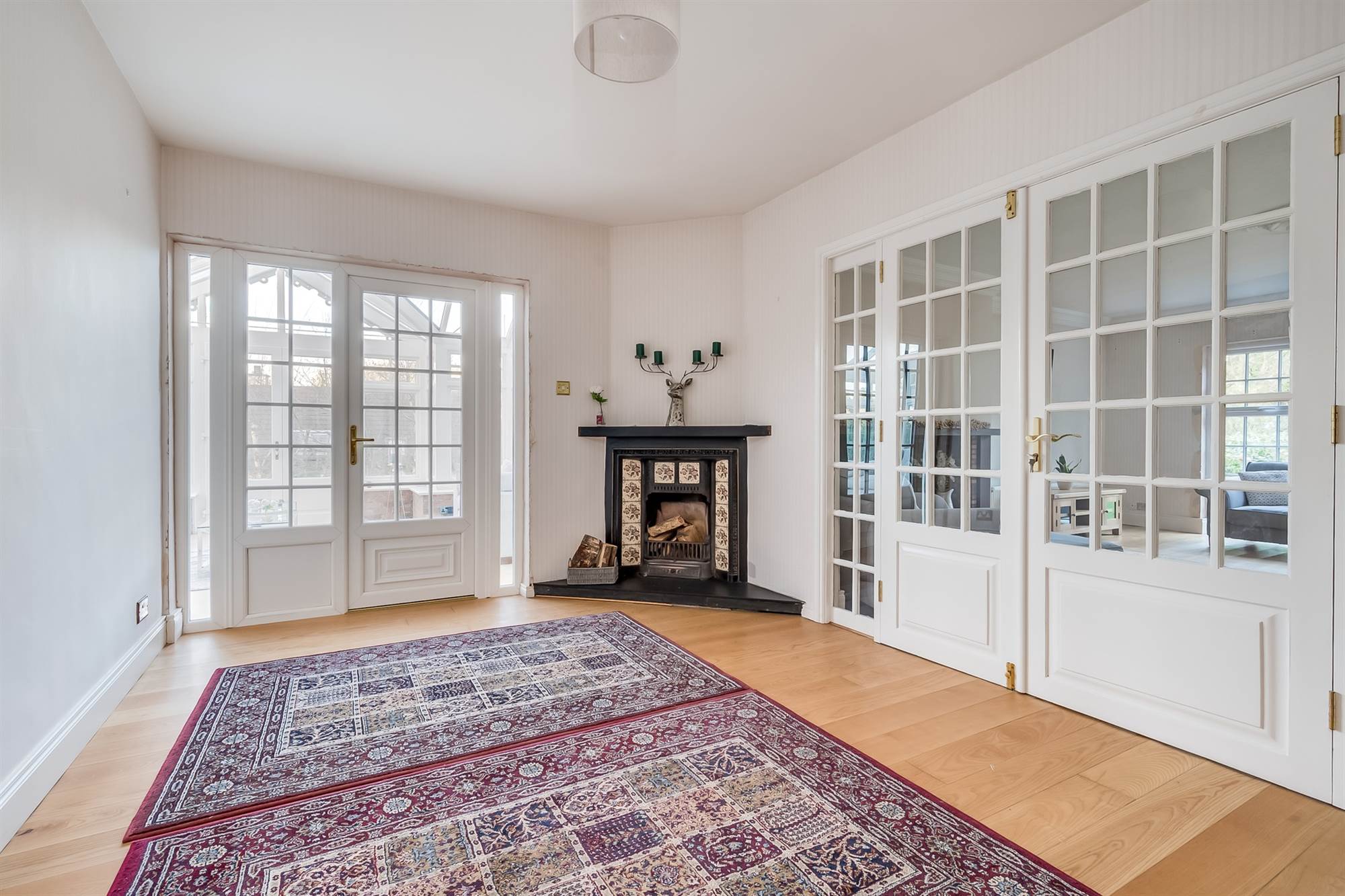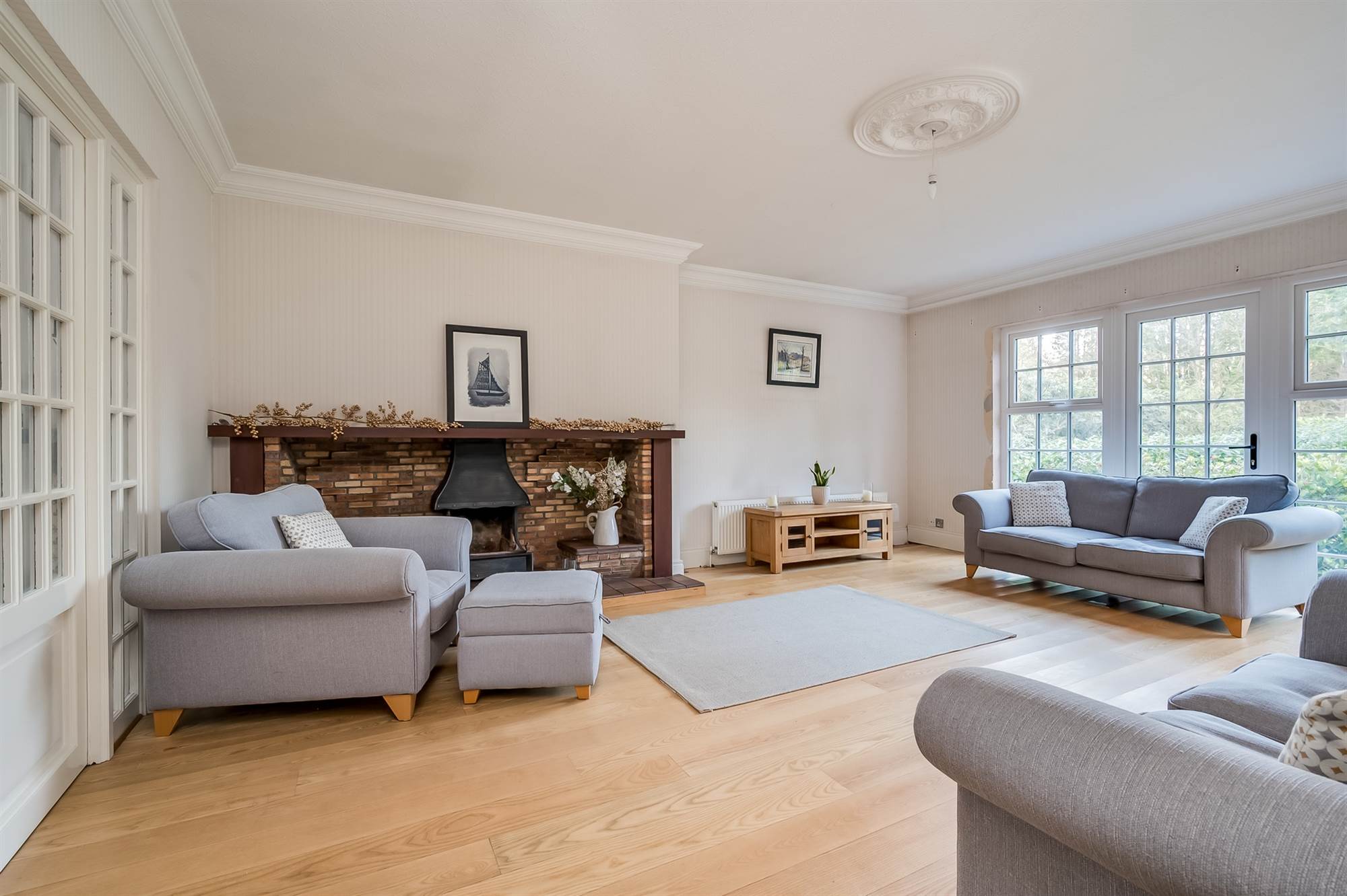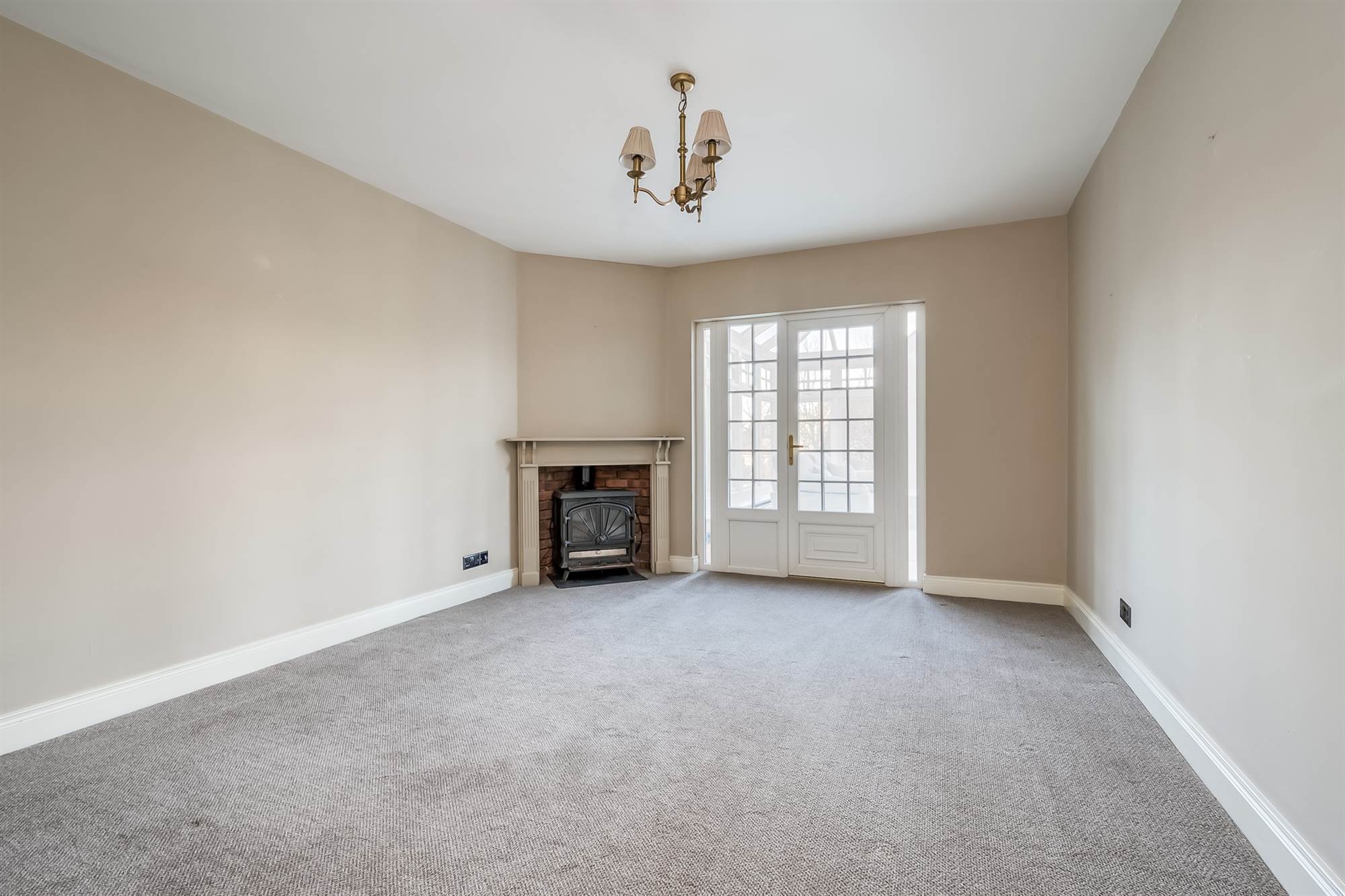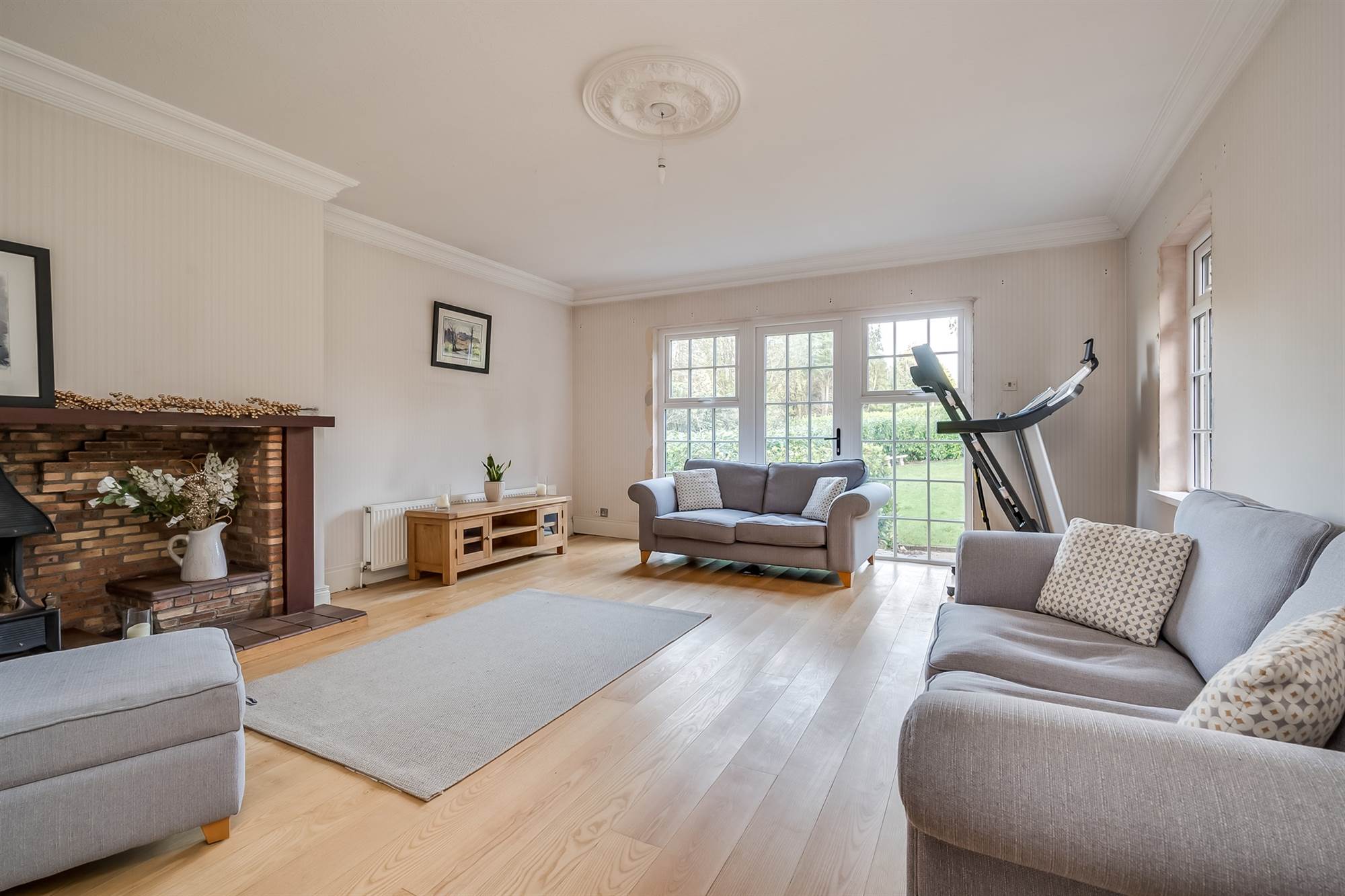 Natural brick recessed fireplace with tiled hearth and mahogany mantle, solid oak wood floor, French door to garden. Glazed double door to Dining Room.