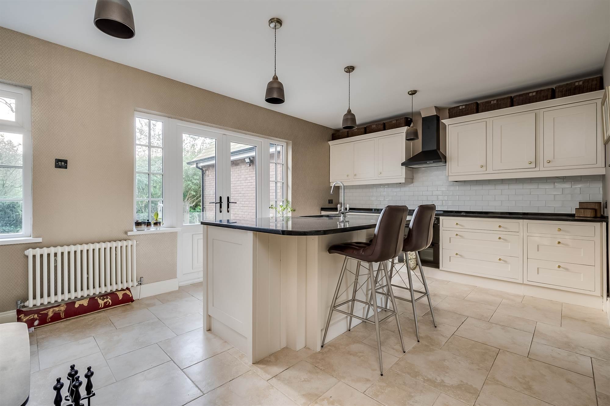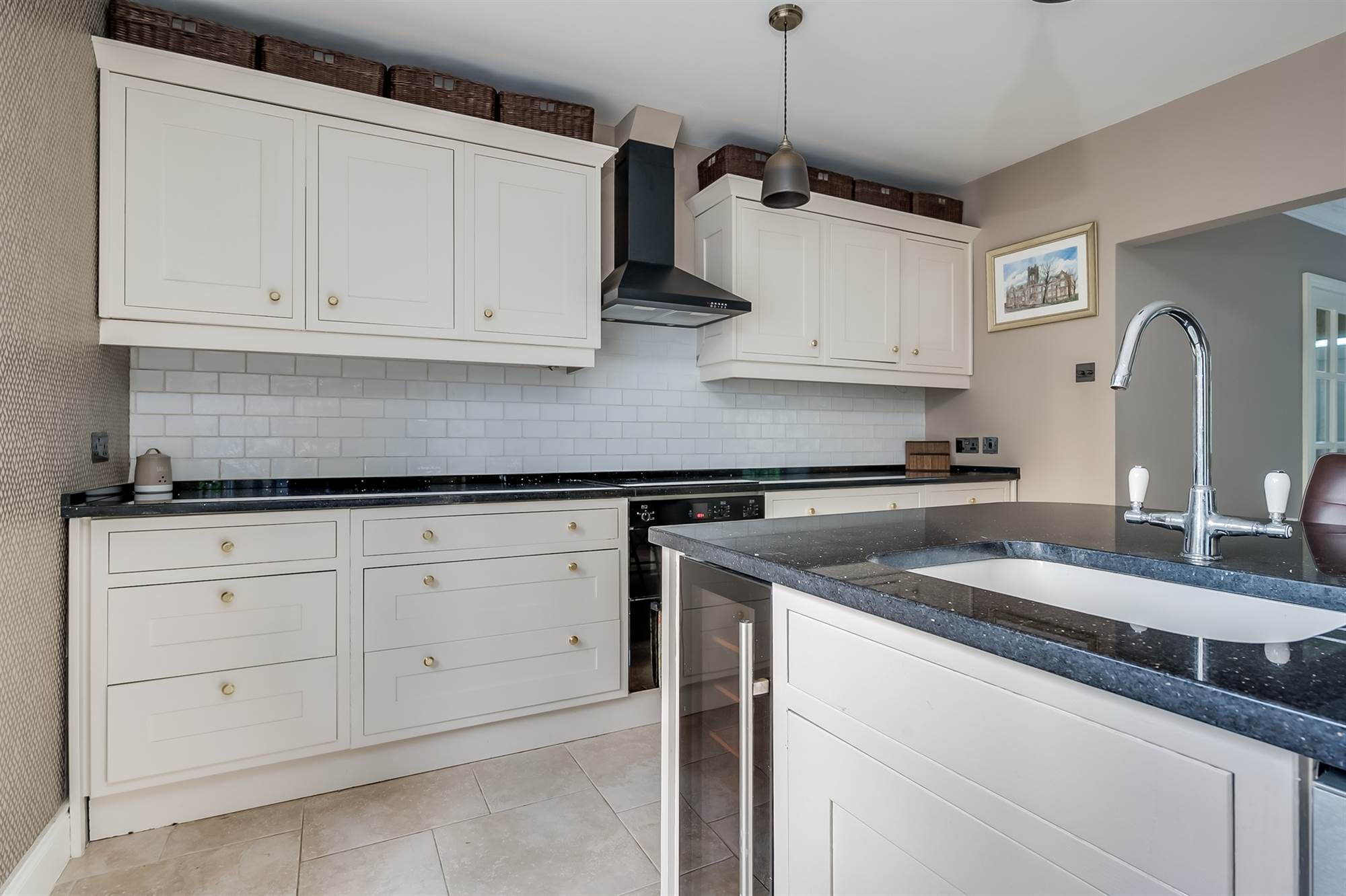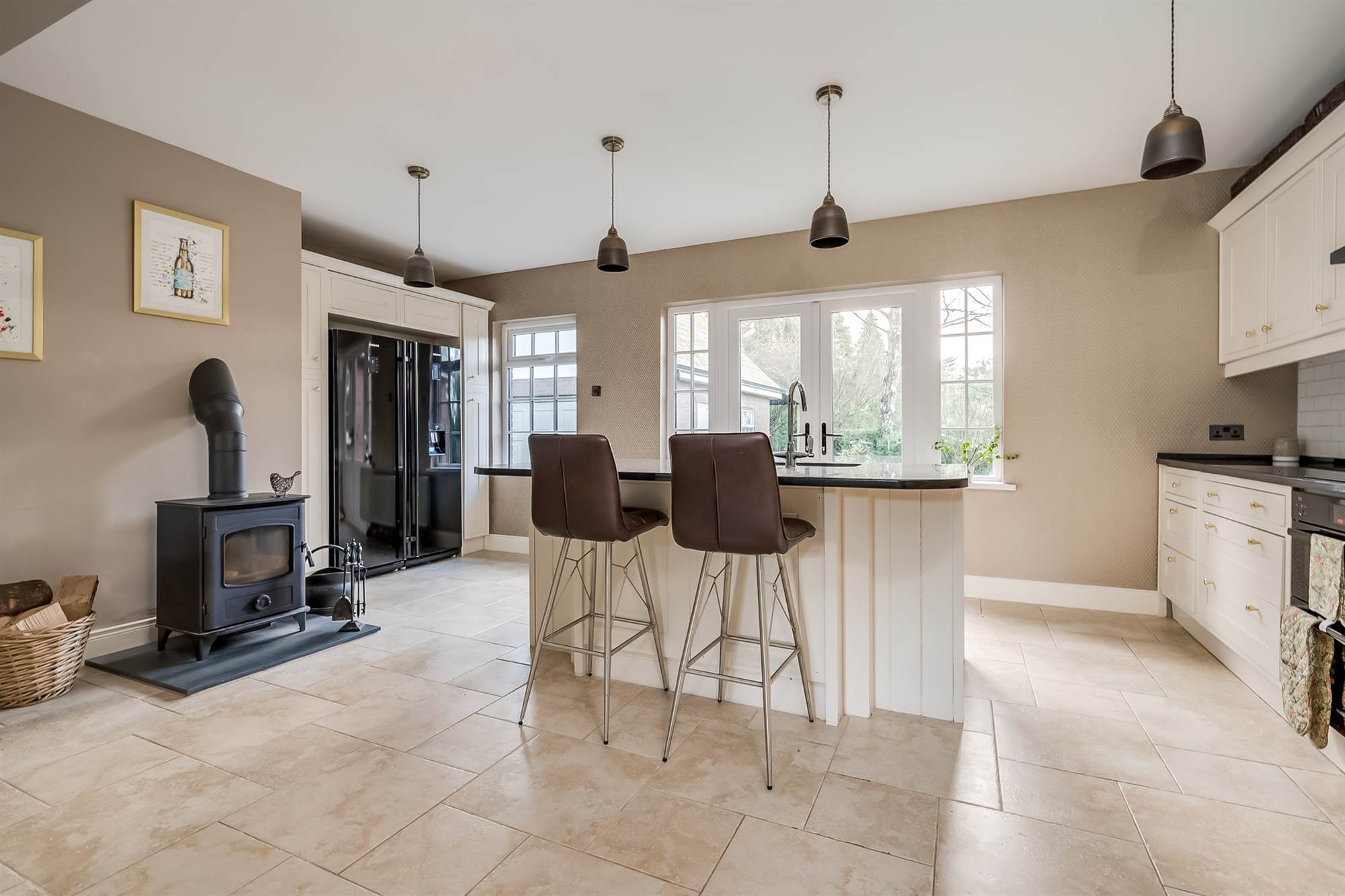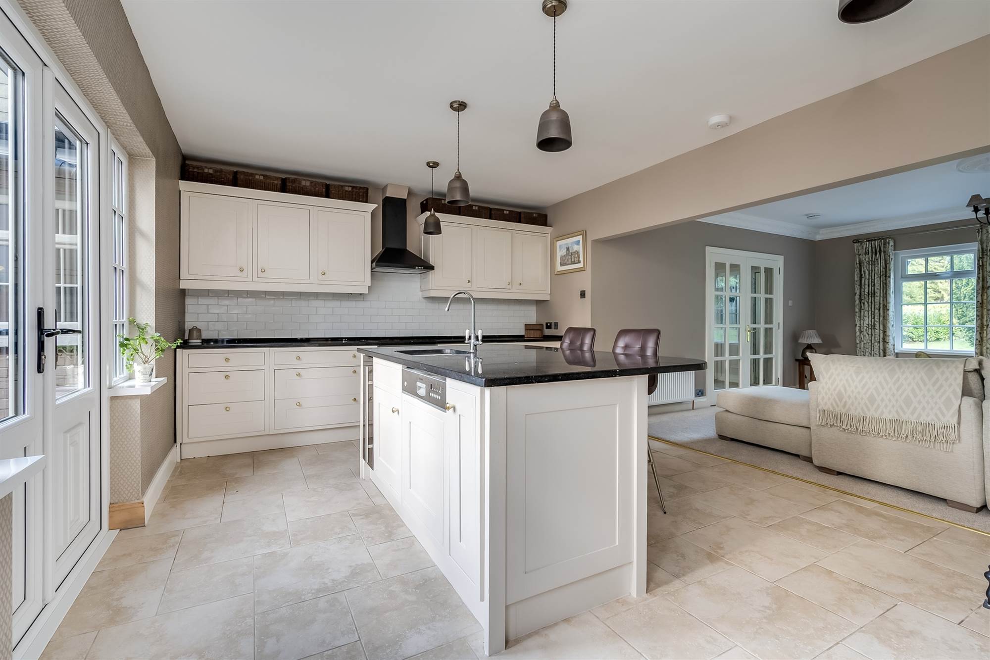 Excellent range of high and low level units, granite worktops, Bosch four ring induction hob, Bosch built-in oven and grill, extractor hood. Island unit with granite worktop, ceramic sink with mixer tap, breakfast bar, wine fridge, built-in dishwasher, larder unit with pull-out storage, space for American fridge freezer, ceramic tiled floor, double glazed French doors to patio, cornice ceiling in living area.