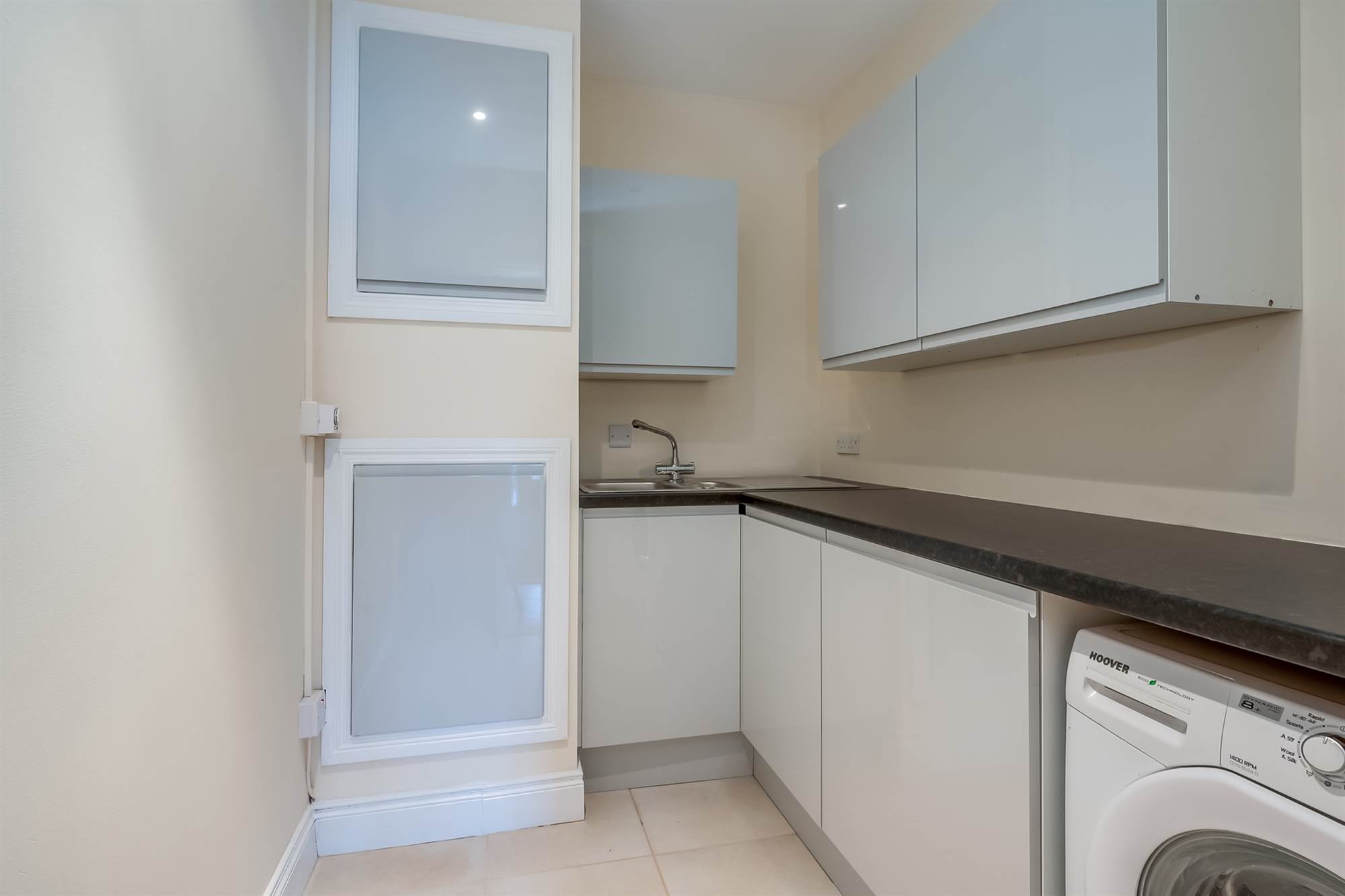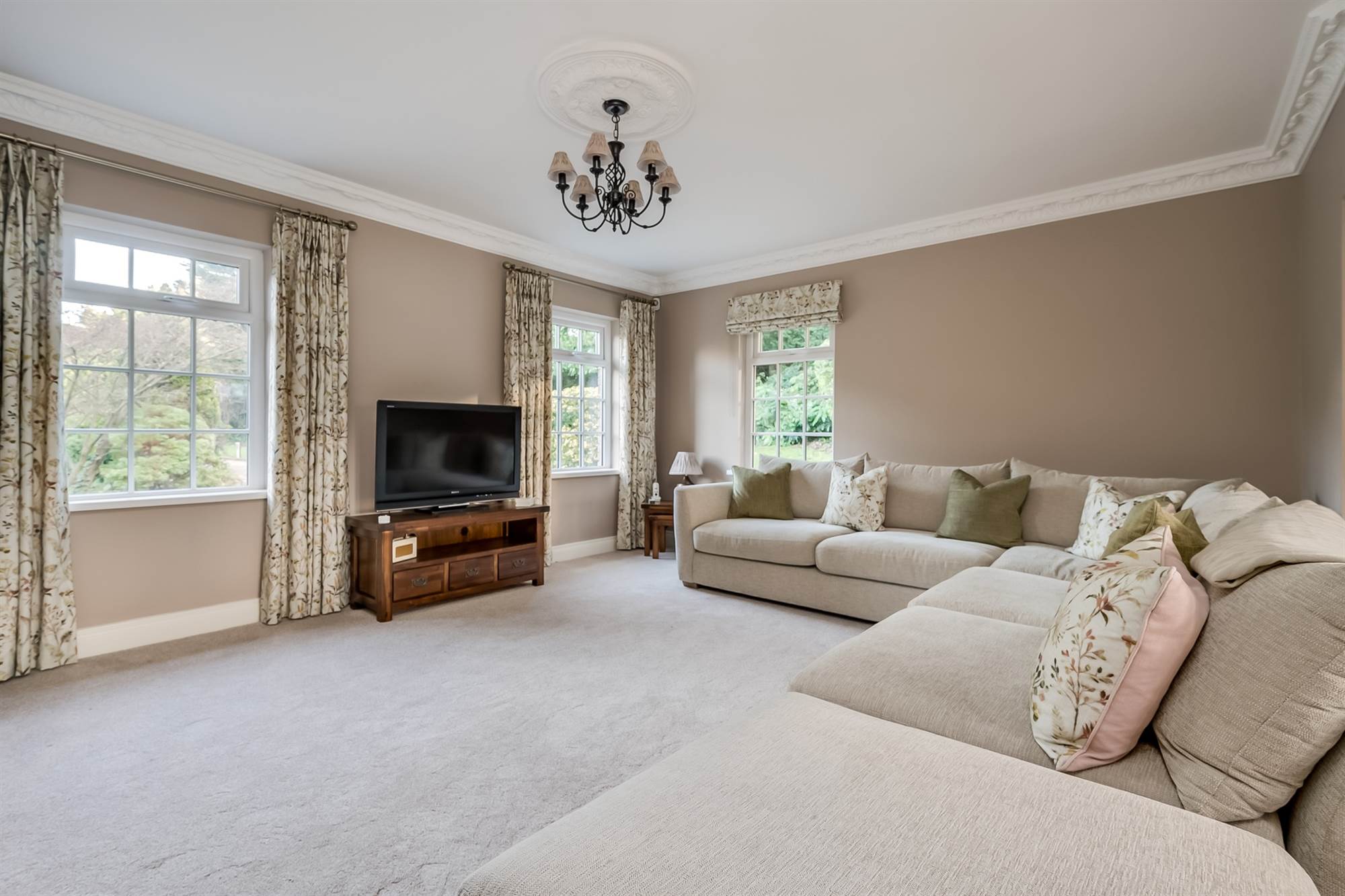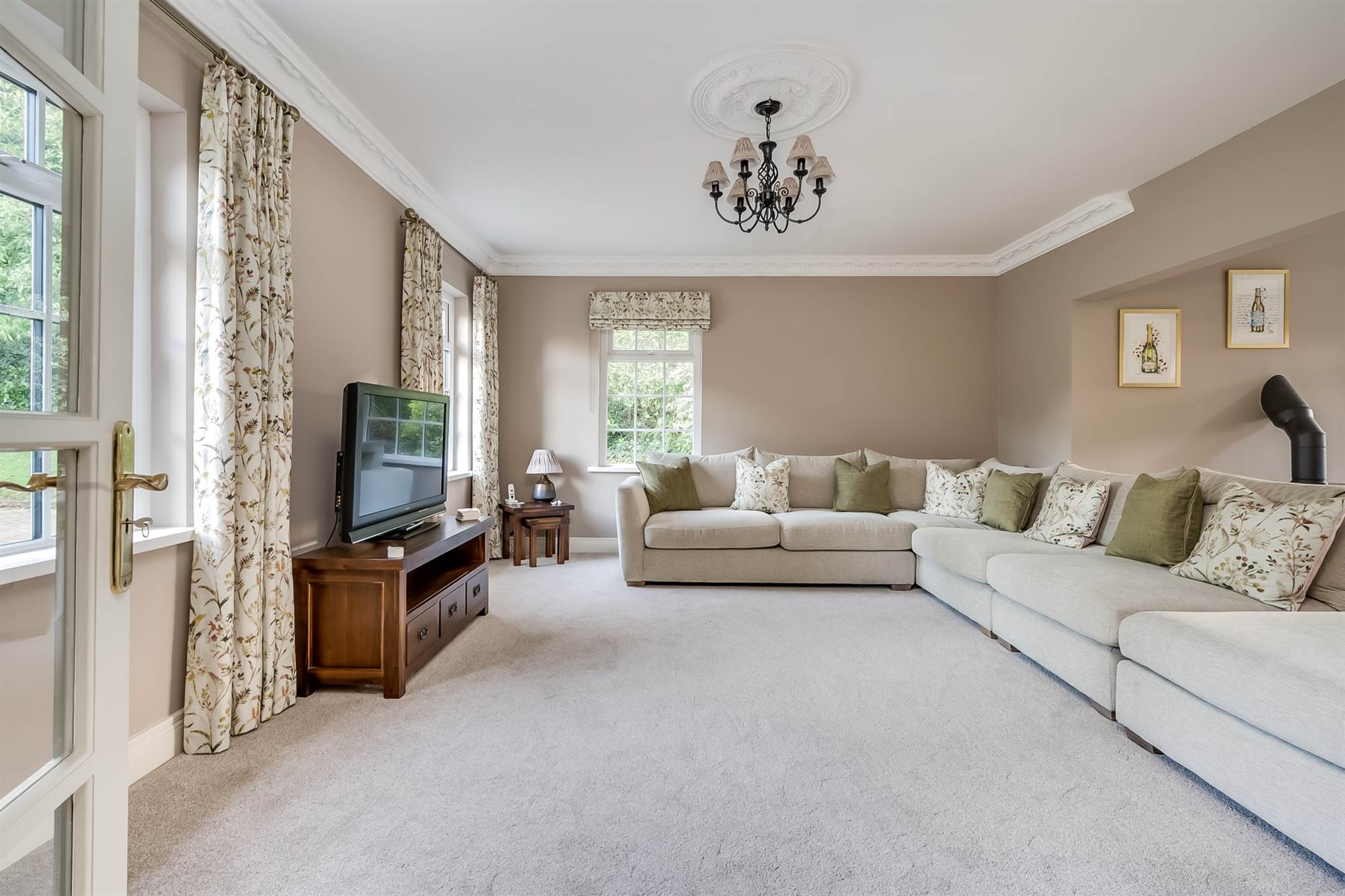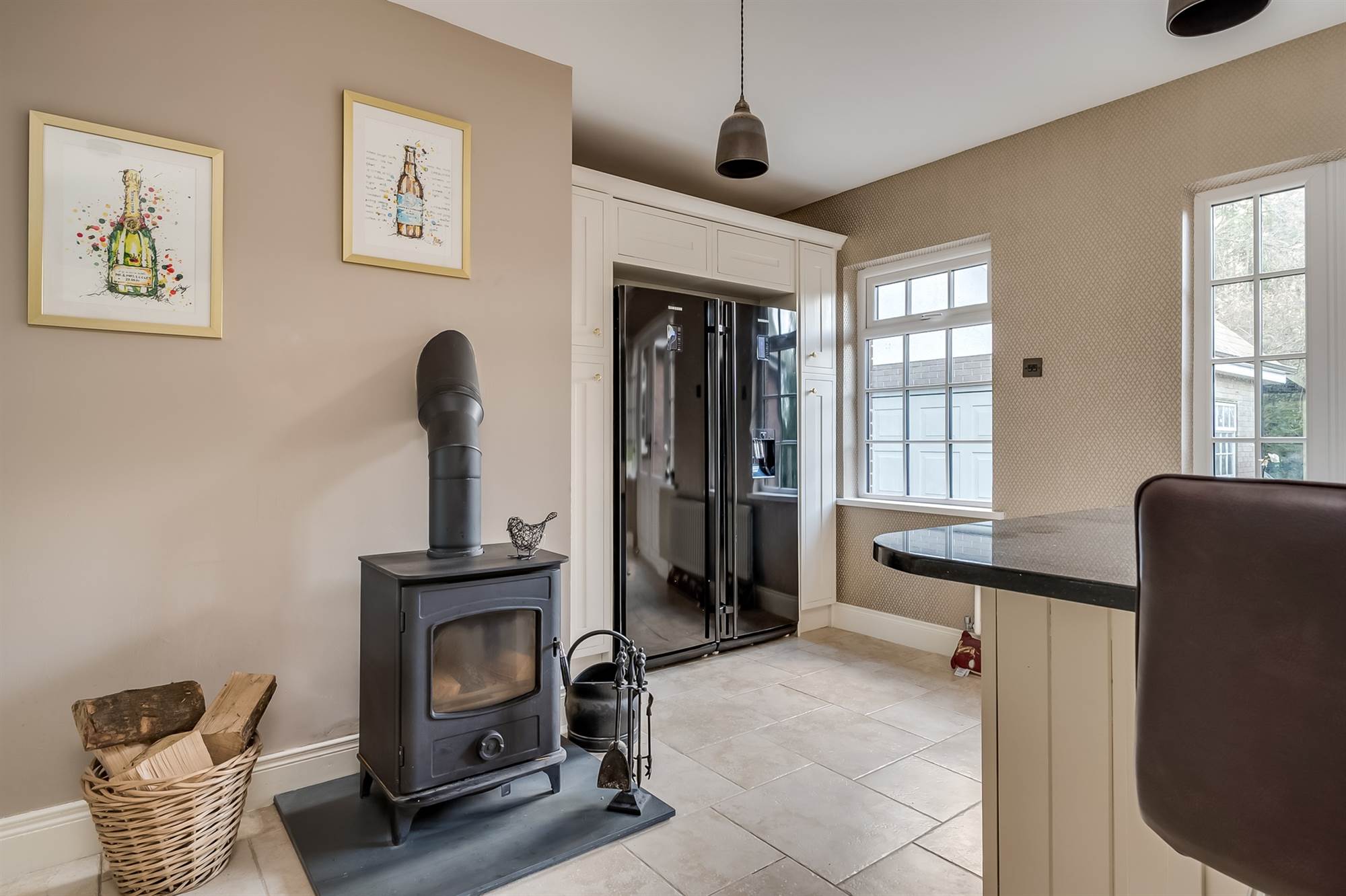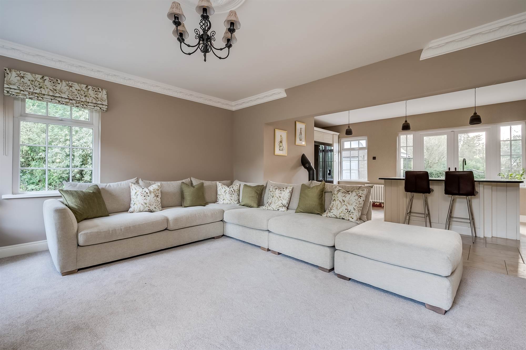 Excellent range of high and low level units, granite worktops, Bosch four ring induction hob, Bosch built-in oven and grill, extractor hood. Island unit with granite worktop, ceramic sink with mixer tap, breakfast bar, wine fridge, built-in dishwasher, larder unit with pull-out storage, space for American fridge freezer, ceramic tiled floor, double glazed French doors to patio, cornice ceiling in living area.