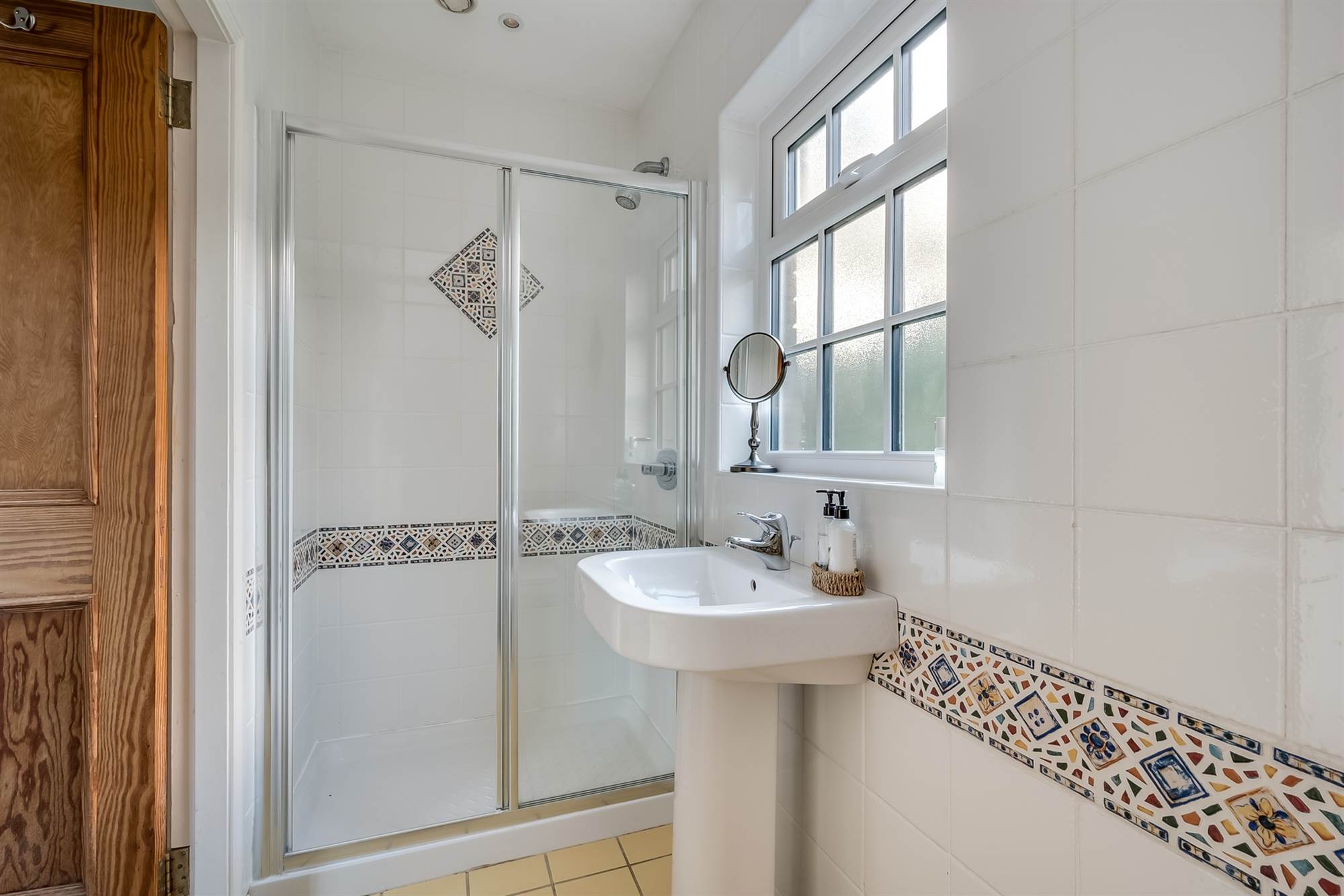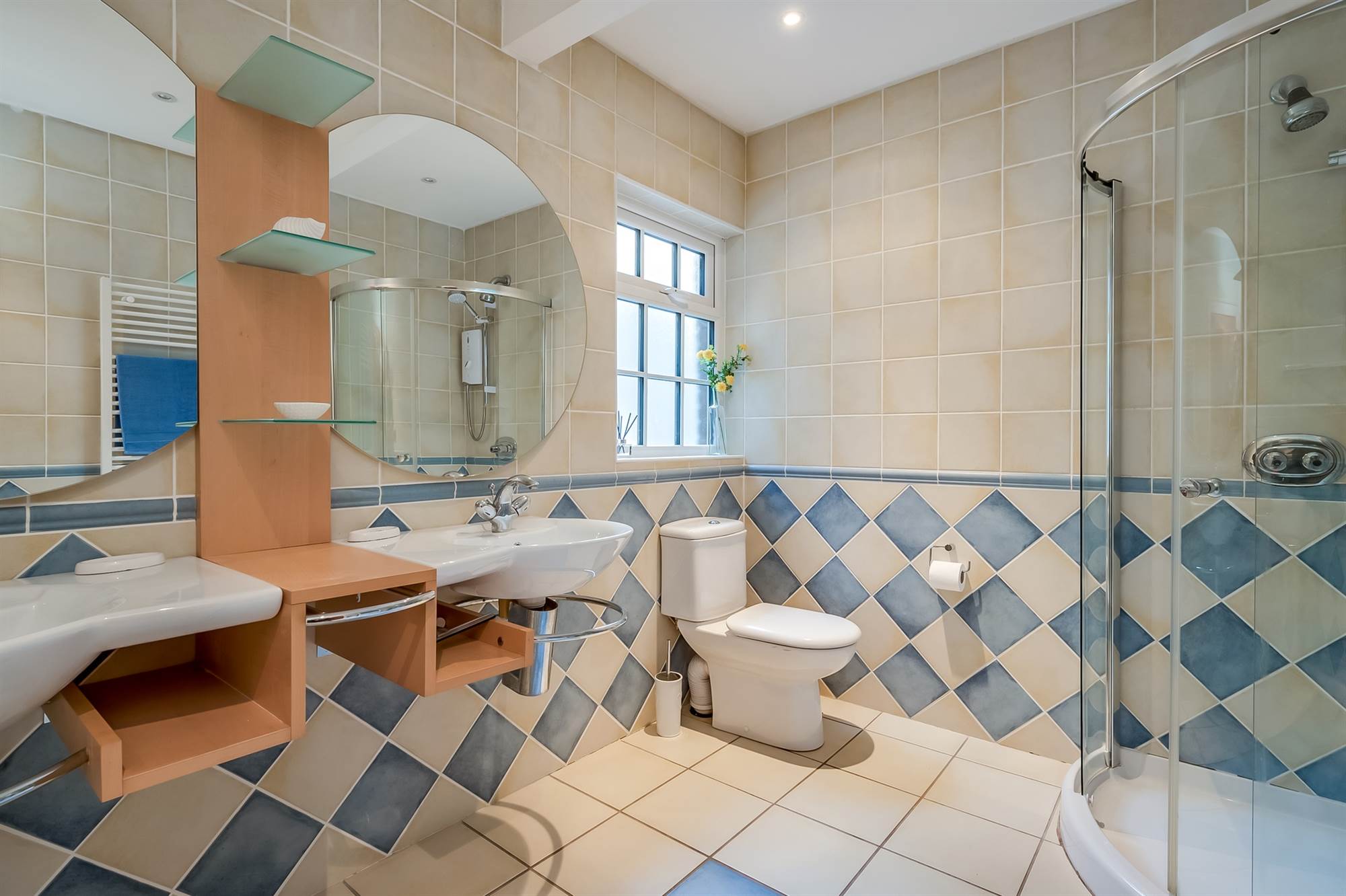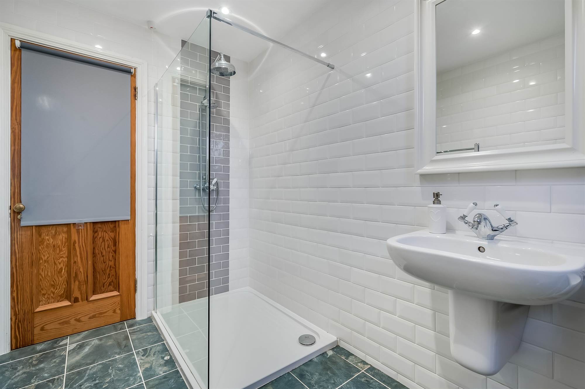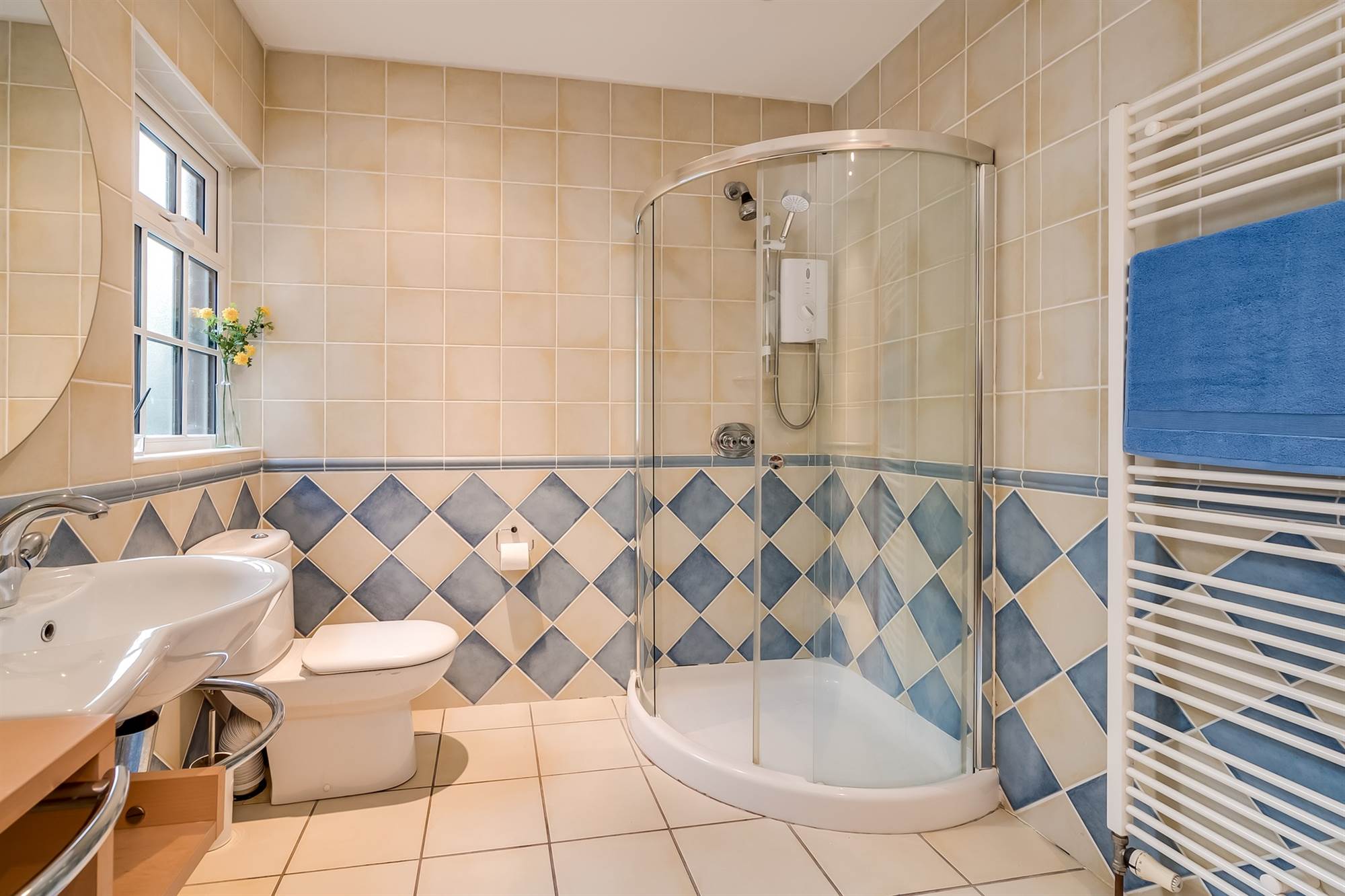 Fully tiled double built-in shower cubicle, pedestal wash hand basin, low flush wc, heated towel rail, ceramic tiled floor, walk-in storage nook.