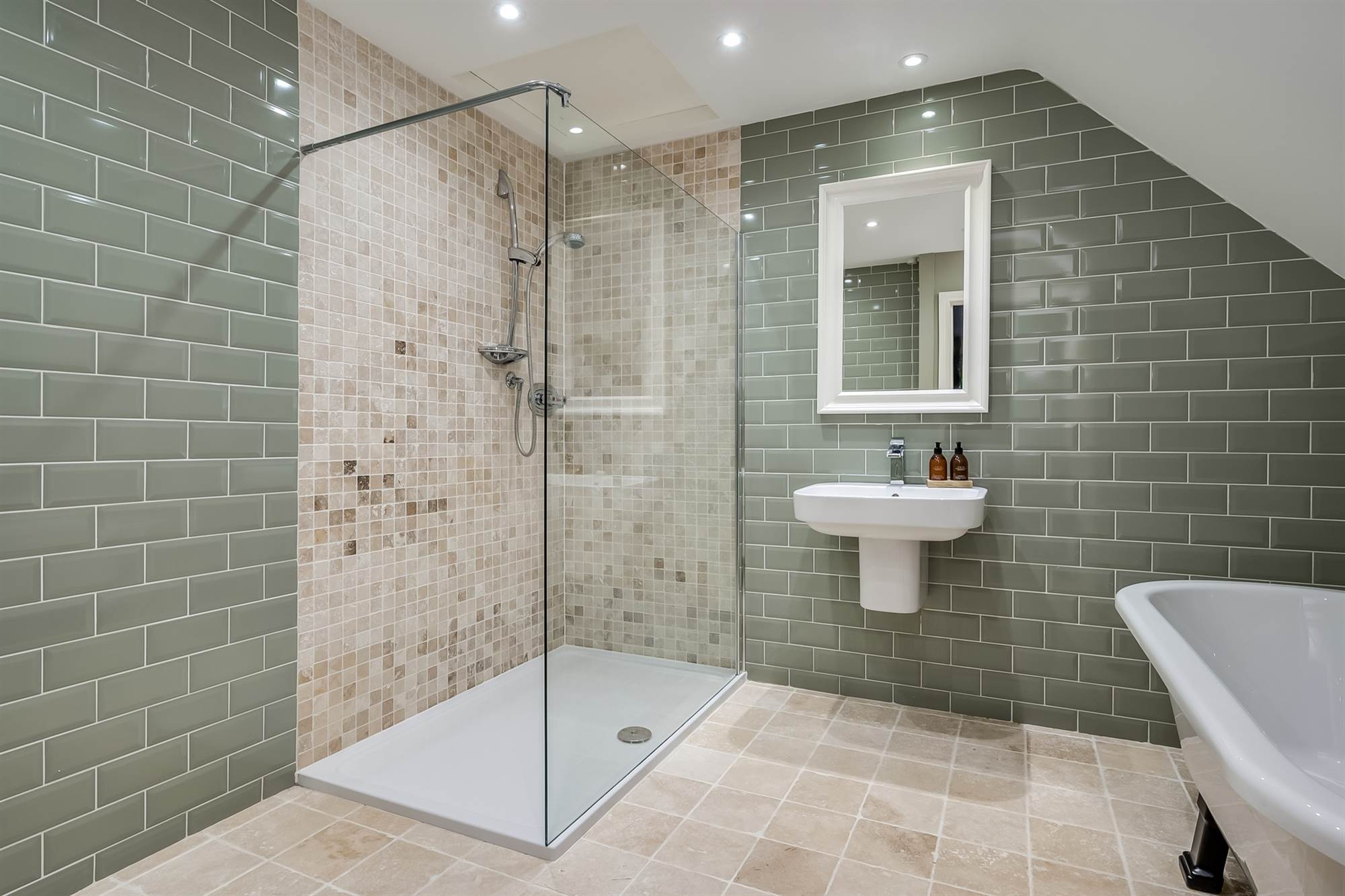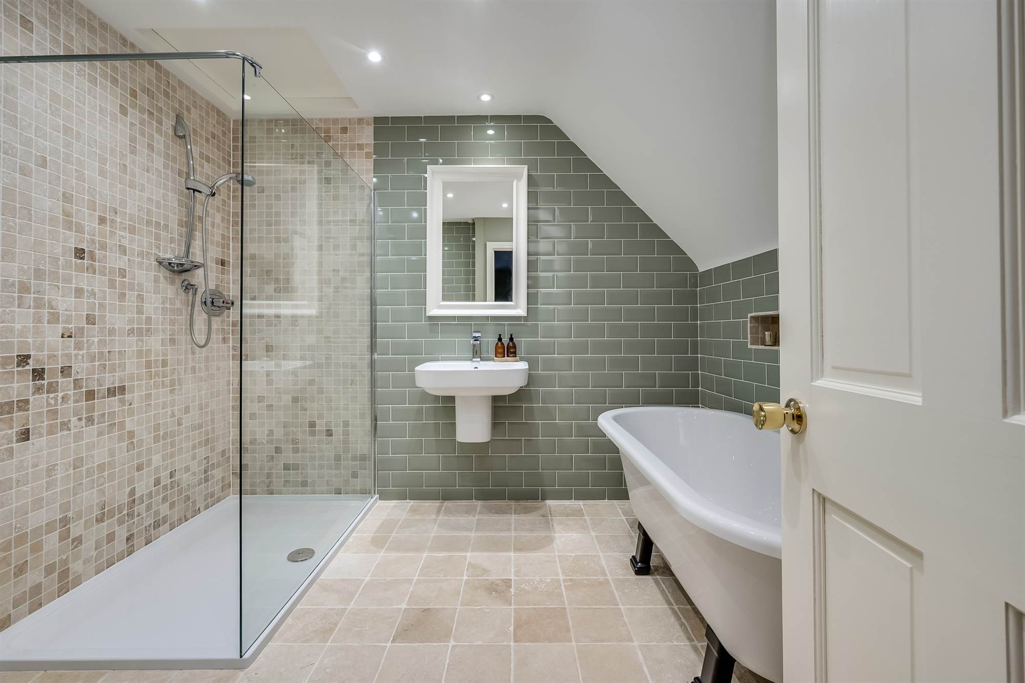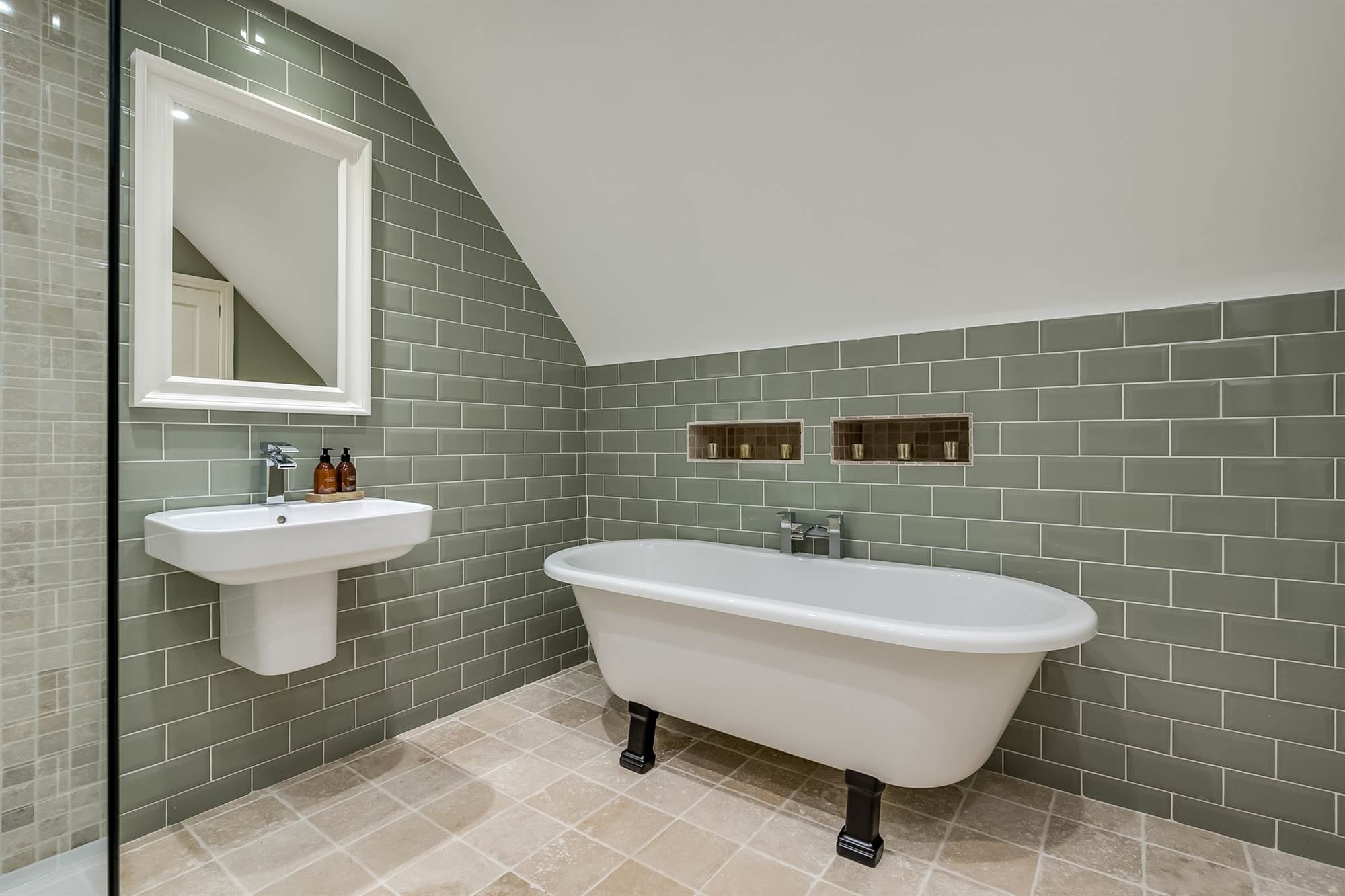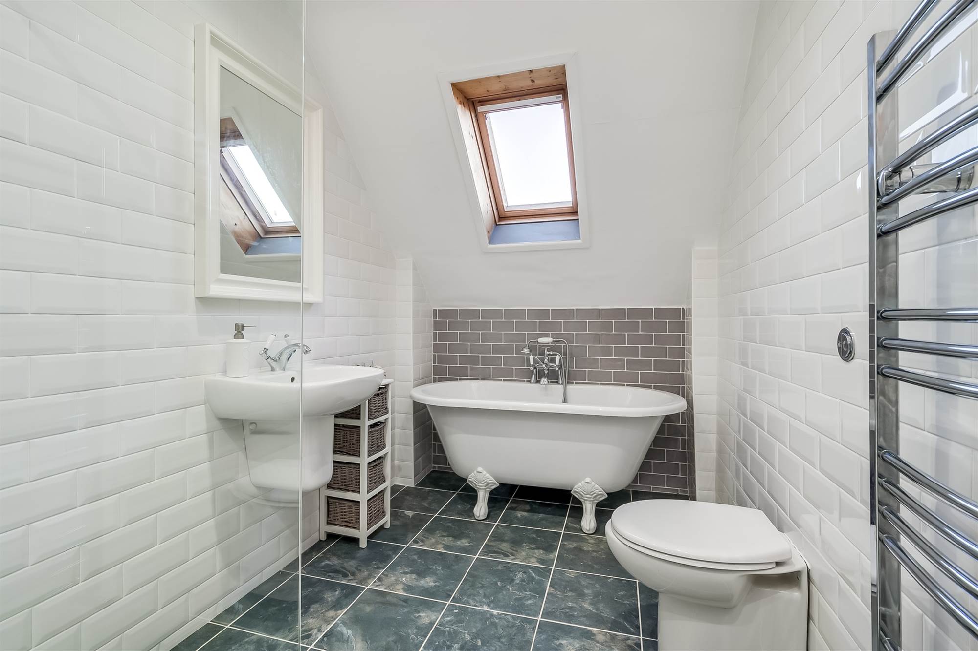 Roll top ball and claw bath with mixer taps and telephone hand shower, wash hand basin, low flush wc, fully tiled walk-in shower cubicle with over head shower and bodyjets, feature subway tiling, ceramic tiled floor, Velux window.