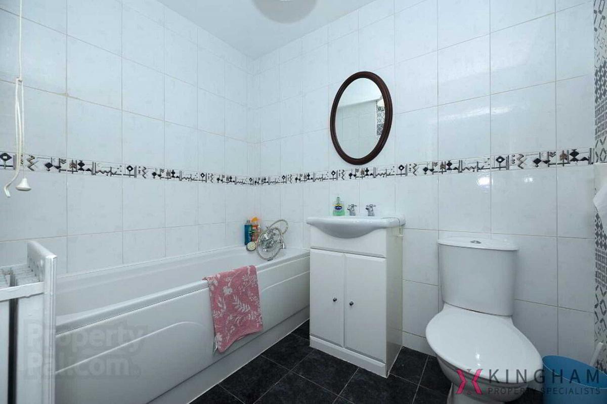 Tile flooring. Partially tiled walls. Three-piece bathroom suite. Double panel radiator.