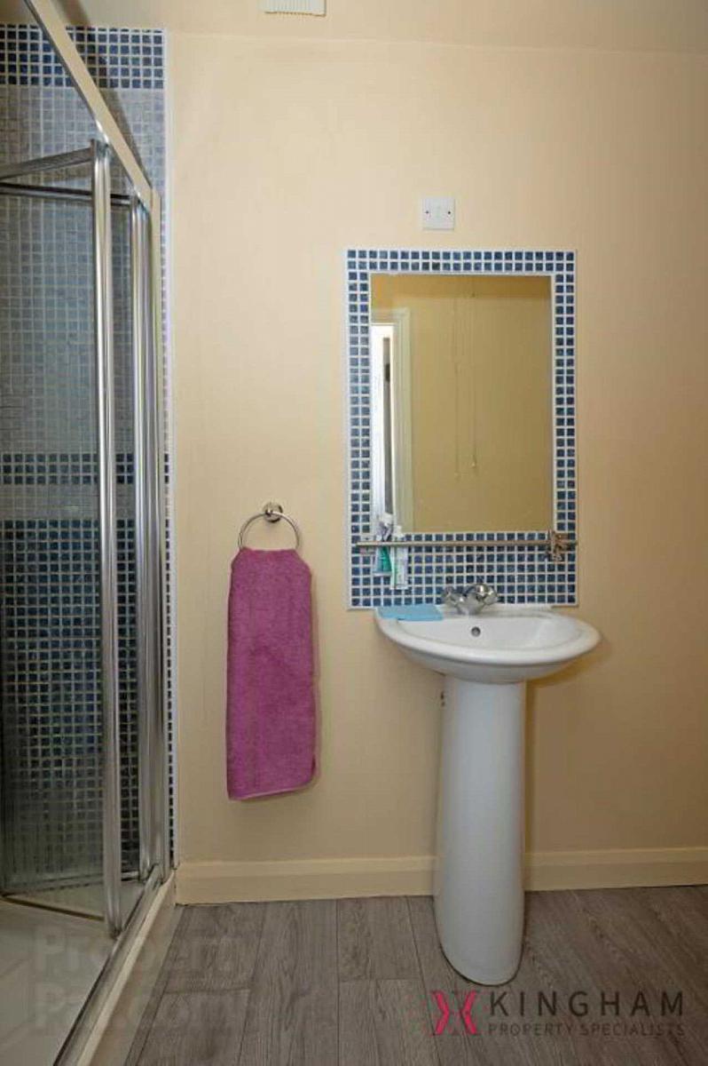 Wood flooring. Toilet & wash hand basin. Glass enclosed shower. Single panel radiator.