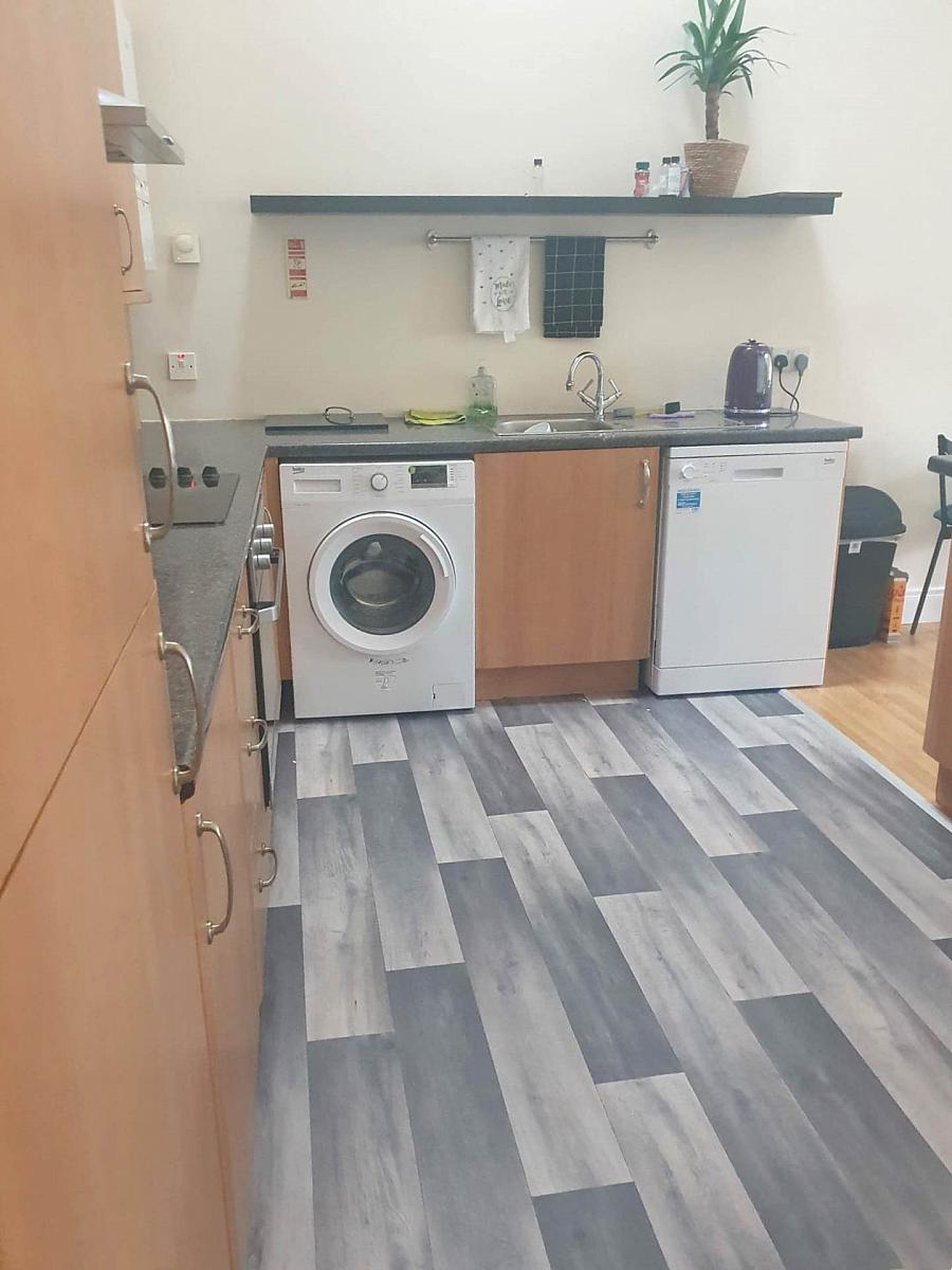 Contemporary Kitchen: Fitted kitchen with attractive units and breakfast bar. White goods included (e.g., Integrated oven/hob, washing machine, fridge/freezer).