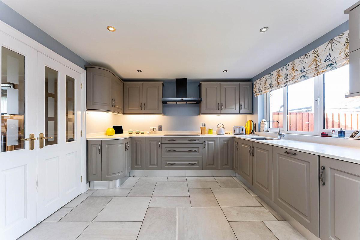 Sleek High-End Kitchen with stunning curved-edge units, granite worktops, spotlights, and tiled flooring. Fully integrated with hob, microwave, oven, dishwasher, and fridge freezer.