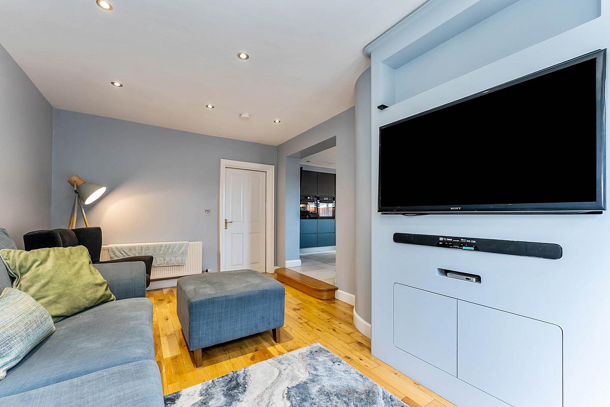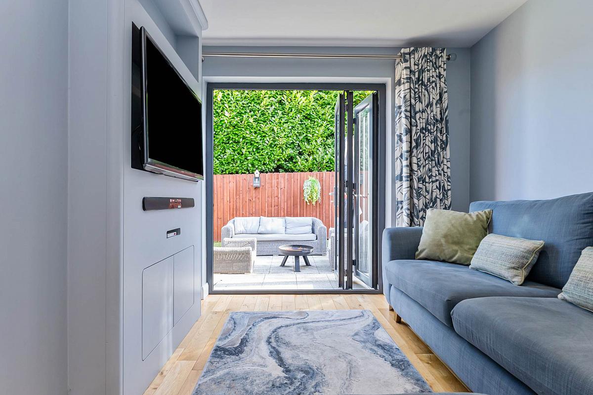 Converted Garage into a second open-plan reception room with a built-in media unit and bi-folding doors opening directly to the private rear garden the perfect snug!