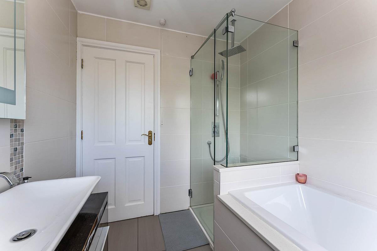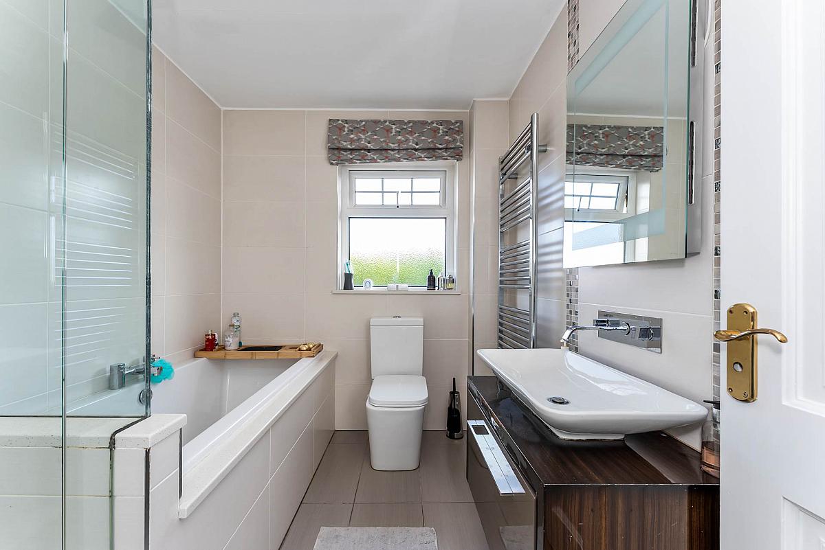 Family Bathroom with a luxury four-piece suite, including walk-in shower, bath, sink vanity unit, and WC.