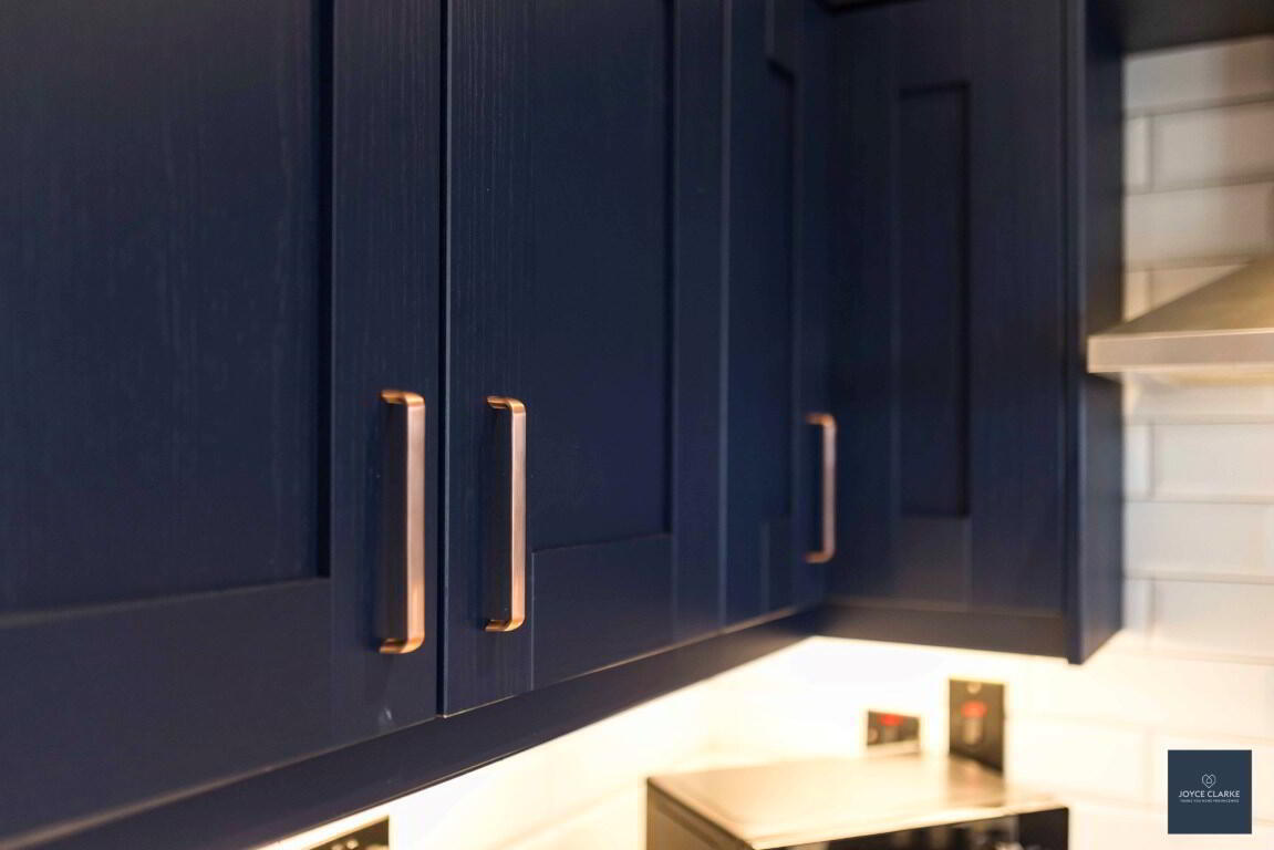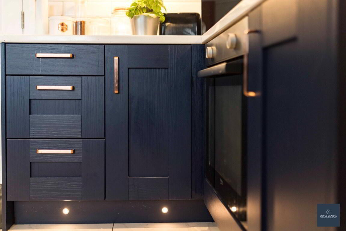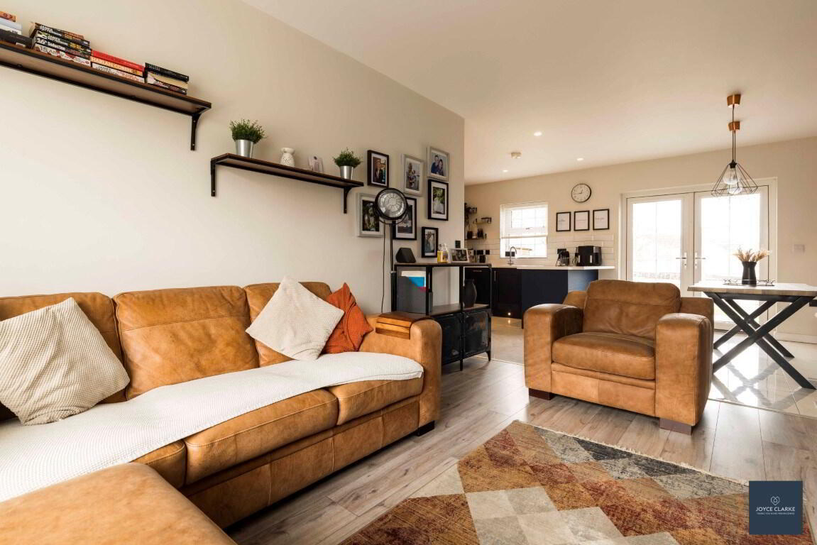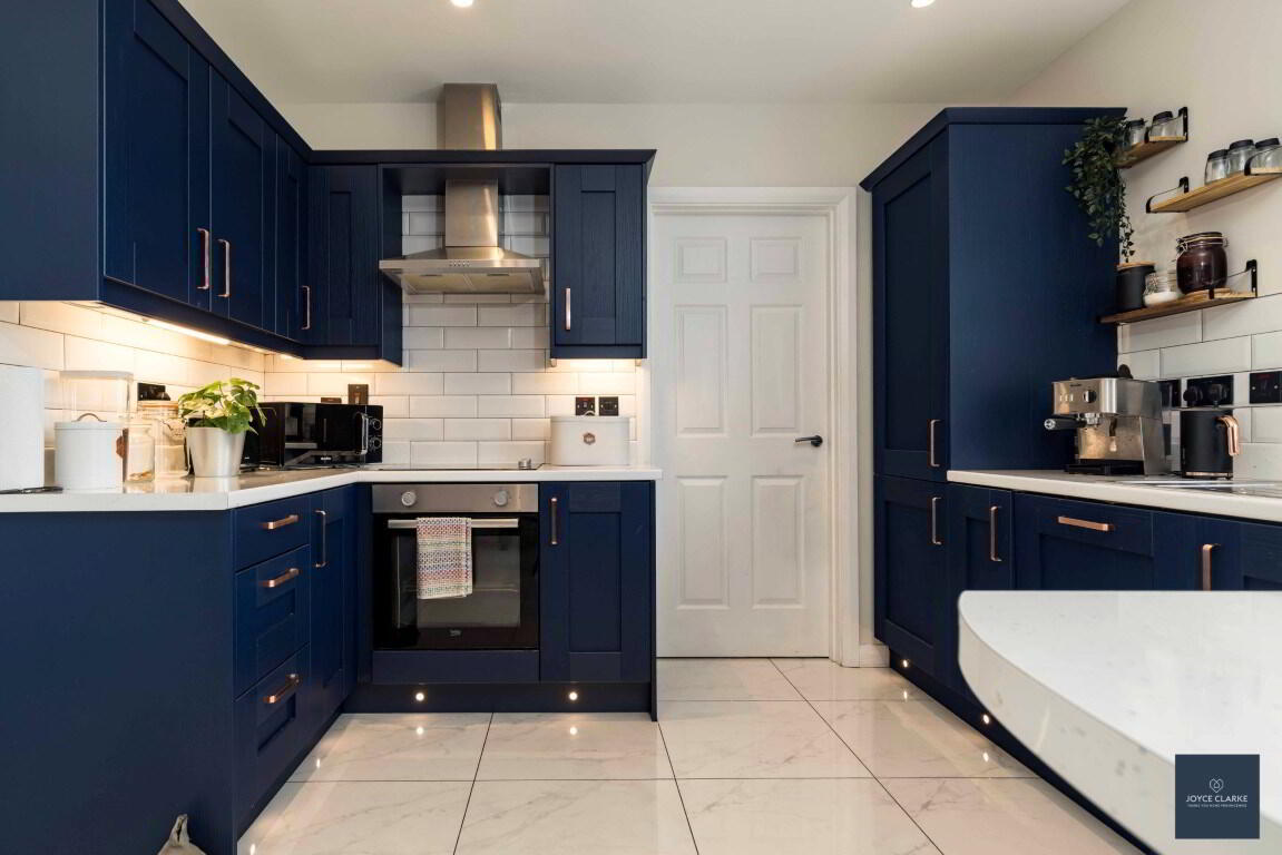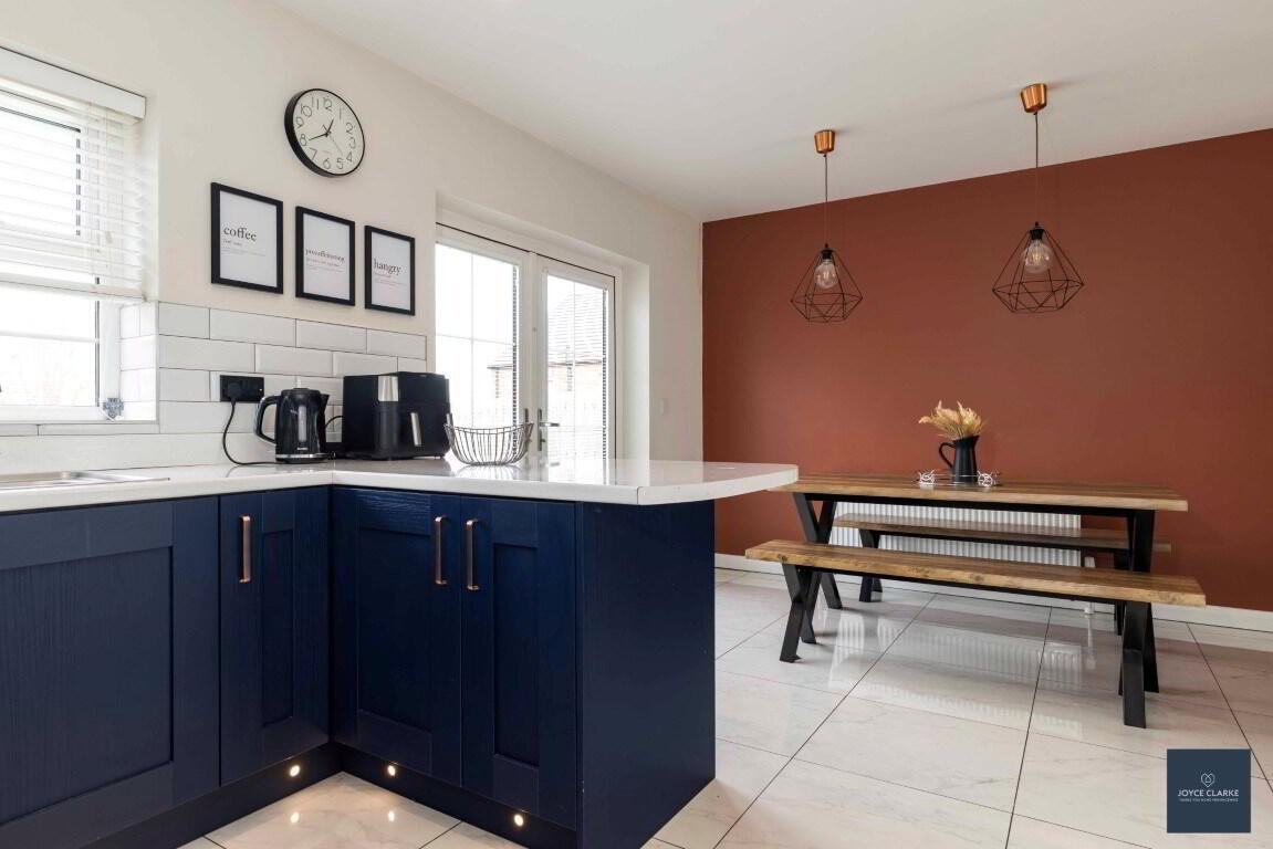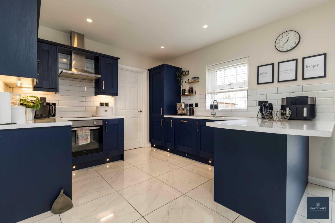 Excellent range of high and low navy units with breakfast bar and contrasting work surface. Integrated appliances, dish washer, fridge freezer, oven and ceramic hob with stainless steel extractor. Stainless steel sink and drainer. Open to in dining. Double panel radiator. French doors to patio.