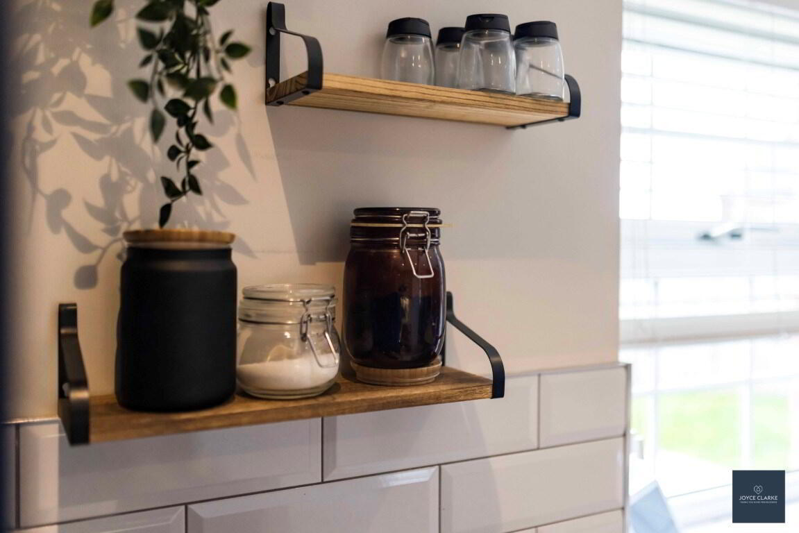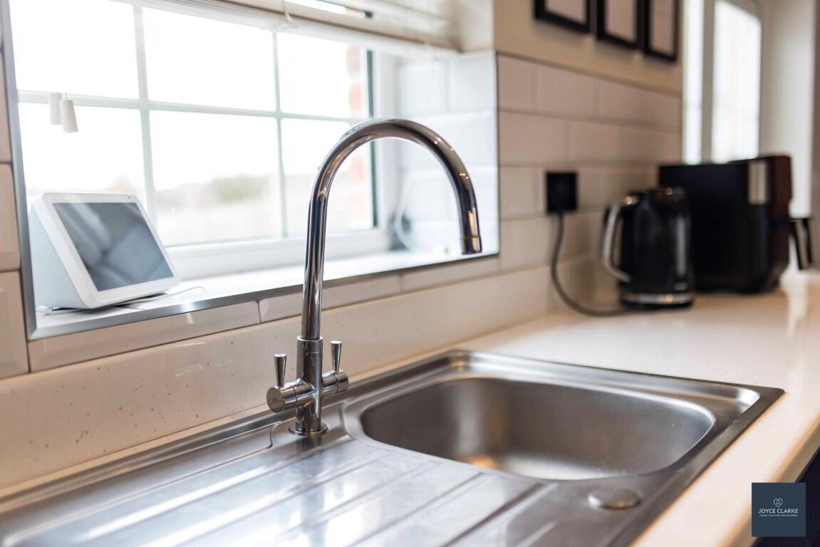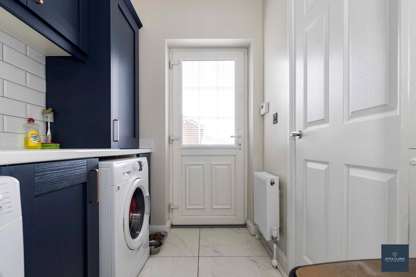High and low units. Stainless steel and drainer with mixer tap. Space for washing machine and tumble dryer. Part glazed uPVC door to rear.