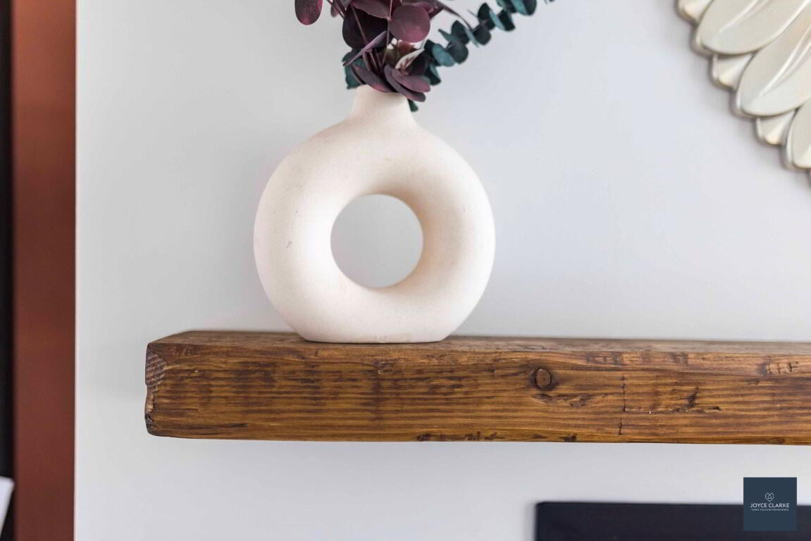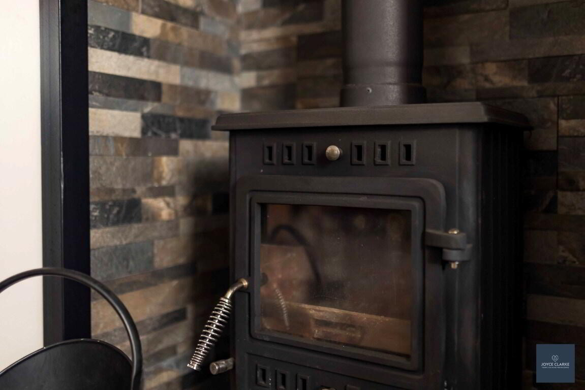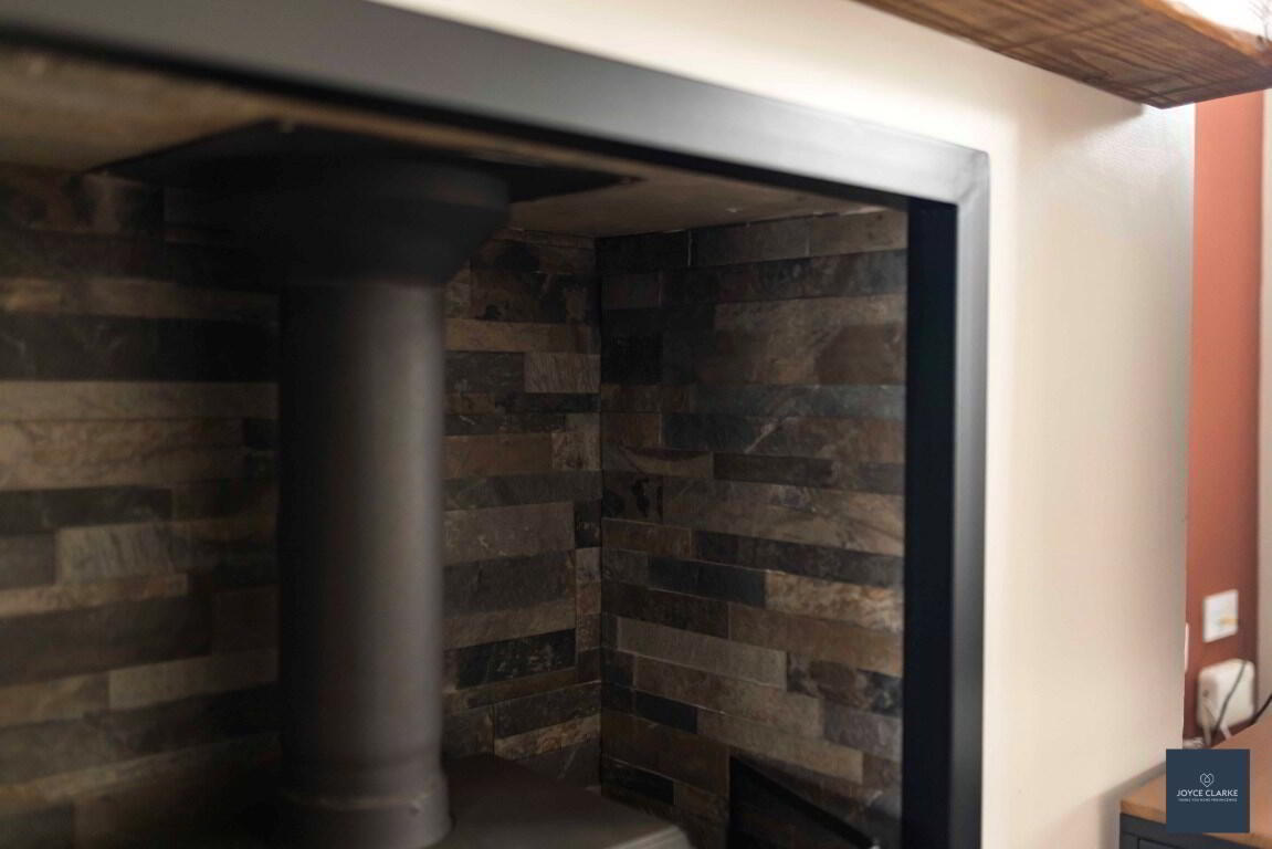 Multi fuel stove set in chamber with feature tiling set upon tiled hearth with beam mantel over. Laminate flooring. TV point.